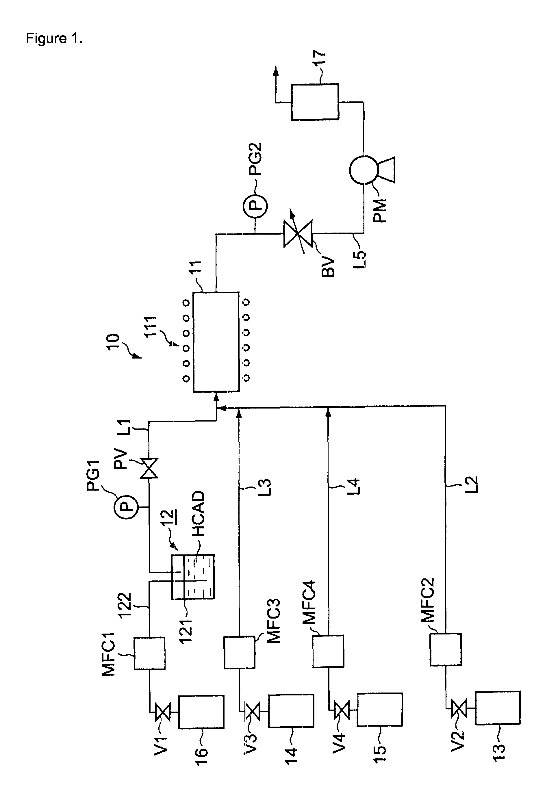 10, 20 CVD reaction apparatus 11 CVD reaction chamber 12 hydrocarbylaminodisilane (HCAD) supply source 13 nitrogen-containing gas supply source 14 dilution gas supply source 15 oxygen-containing gas supply source 16 carrier gas supply source 17 waste gas treatment apparatus 21 vaporizer 22 sealed container 111 heating means 121 sealed container 122 carrier gas injection conduit L1-L5, L21-L23 line V1-V4, V21-V22 Valve PG1-PG2 pressure sensor MFC1-MFC4, MFC21-MFC22 mass flow controller BV butterfly valve PM pump Example 1