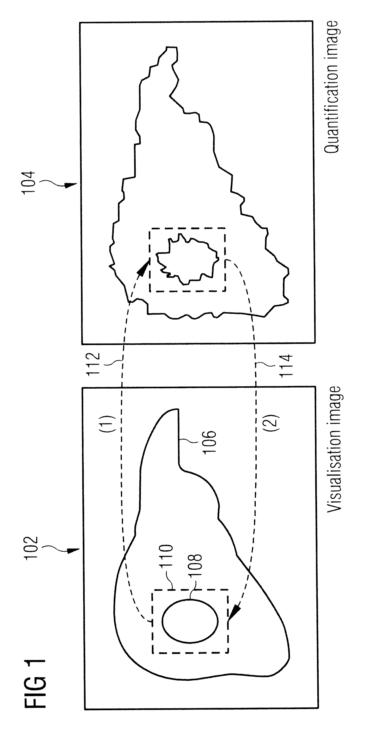 FIG. 1 is a diagram illustrating the processing and manipulation taking place in an embodiment of the invention. The image data has captured an object 106 for viewing by the clinician. The pre-image data, without the final smoothing filter, has been stored as a quantification image (104). The workstation/viewer presents the visualization image (102) to the user, who uses this image to identify lesions (such as lesion 108) and draw ROIs (such as ROI 110). This ROI 110 is then propagated (112) by the system to the quantification image. Any quantification parameters, such as mean pixel intensity, would then be computed using the data in the quantification image, instead of the viewing/visualization image, and the resultant values propagated (114) back to the viewer for display alongside the visualization image.