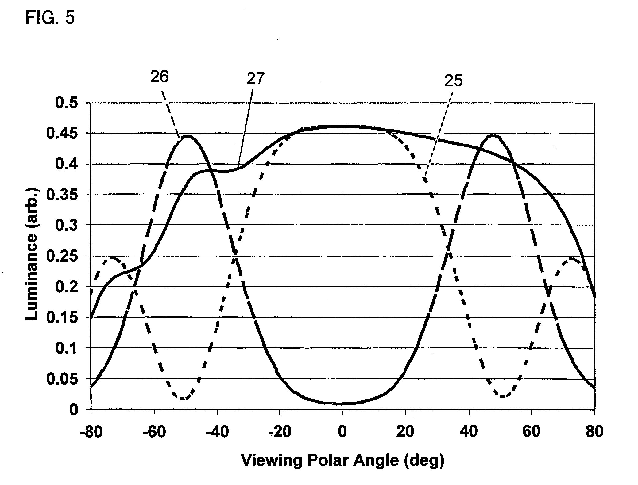 The present invention relates to a display having public and private viewing modes. Electronic display devices, such as monitors used with computers and screens built in to telephones and portable information devices, are usually designed to have a viewing angle as wide as possible, so that they can be read from any viewing position. However, there are some situations where a display that is visible from only a narrow range of angles is useful. For example, one might wish to read a private document using a portable computer while on a crowded train. U.S. Pat. No. 6,552,850 (E. Dudasik; Citicorp Inc. 2003) describes a method for the display of private information on a cash dispensing machine. Light emitted by the machine's display has a fixed polarisation state, and the machine and its user are surrounded by a large screen of sheet polariser which absorbs light of that polarisation state but transmits the orthogonal state. Passers by can see the user and the machine but cannot see information displayed on the screen. A versatile method for controlling the direction of light is a ‘louvred’ film. The film consists of alternating transparent and opaque layers in an arrangement similar to a Venetian blind. Like a Venetian blind, it allows light to pass through it when the light is travelling in a direction nearly parallel to the layers, but absorbs light travelling at large angles to the plane of the layers. These layers may be perpendicular to the surface of the film or at some other angle. Methods for the production of such films are described in a U.S. RE27617 (F. O. Olsen; 3M 1973), U.S. Pat. No. 4,766,023 (S.-L. Lu, 3M 1988), and U.S. Pat. No. 4,764,410 (R. F. Grzywinski; 3M 1988). Other methods exist for making films with similar properties to the louvred film. These are described, for example, in U.S. Pat. No. 5,147,716 (P. A. Bellus; 3M 1992), and U.S. Pat. No. 5,528,319 (R. R. Austin; Photran Corp. 1996). Louvre films may be placed either in front of a display panel or between a transmissive display and its backlight to restrict the range of angles from which the display can be viewed. In other words, they make a display “private”. U.S. 2002/0158967 (J. M. Janick; IBM, published 2002) shows how a light control film can be mounted on a display so that the light control film can be moved over the front of the display to give a private mode, or mechanically retracted into a holder behind or beside the display to give a public mode. This method has the disadvantages that it contains moving parts which may fail or be damaged and that it adds bulk to the display. A method for switching from public to private mode with no moving parts is to mount a light control film behind the display panel, and to place a diffuser which can be electronically switched on and off between the light control film and the panel. When the diffuser is inactive, the light control film restricts the range of viewing angles and the display is in private mode. When the diffuser is switched on, it causes light travelling at a wide range of angles to pass through the panel and the display is in public mode. It is also possible to mount the light control film in front of the panel and place the switchable diffuser in front of the light control film to achieve the same effect. Switchable privacy devices of these types are described in U.S. Pat. No. 5,831,698 (S. W. Depp; IBM 1998), U.S. Pat. No. 6,211,930 (W. Sautter; NCR Corp. 2001) and U.S. Pat. No. 5,877,829 (M. Okamoto; Sharp K. K. 2001). They share the disadvantage that the light control film always absorbs a significant fraction of the light incident upon it, whether the display is in public or private mode. The display is therefore inefficient in its use of light. Since the diffuser spreads light through a wide range of angles in the public mode, these displays are also dimmer in public than in private mode, unless the backlight is made brighter to compensate. Another disadvantage relates to the power consumption of these devices. In the public mode of operation, the diffuser is switched so as to be non-diffusing. This often means that voltage is applied to a switchable polymer-dispersed liquid crystal diffuser. More power is therefore consumed in the public mode than in the private mode. This is a disadvantage for displays which are used for most of the time in the public mode. Another known method for making a switchable public/private display is given in U.S. Pat. No. 5,825,436 (K. R. Knight; NCR Corp. 1998). The light control device is similar in structure to the louvred film described earlier. However, each opaque element in the louvred film is replaced by a liquid crystal cell which can be electronically switched from an opaque state to a transparent state. The light control device is placed in front of or behind a display panel. When the cells are opaque, the display is in its private mode; when the cells are transparent, the display is in its public mode. The first disadvantage of this method is in the difficulty and expense of manufacturing liquid crystal cells with an appropriate shape. A second disadvantage is that in the private mode, a ray of light may enter at an angle such that it passes first through the transparent material and then through part of a liquid crystal cell. Such a ray will not be completely absorbed by the liquid crystal cell and this may reduce the privacy of the device. Another method for making a switchable public/private display device is given in JP3607272 and JP3607286 (Toshiba 2005). This device uses an additional liquid crystal panel, which is has patterned liquid crystal alignment. Different aligned segments of the panel modify the viewing characteristics of different areas of the display in different ways, with the result that the whole display panel is fully readable only from a central position. GB2405544 describes switchable privacy devices based on louvres, which operate only for one polarisation of light. The l
