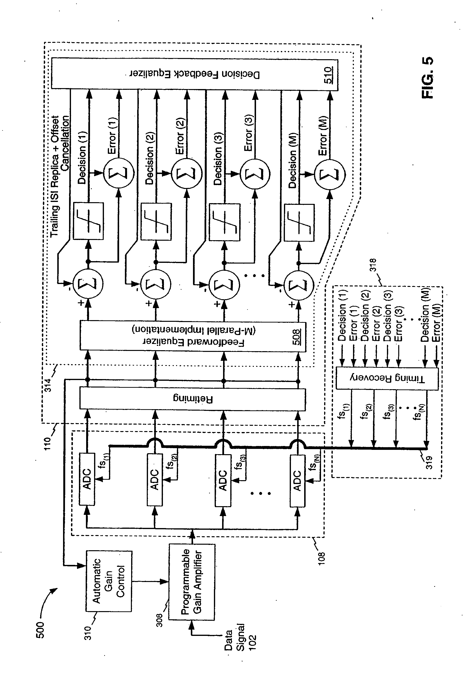 This application is a continuation of U.S. patent application Ser. No. 11/826,414 (Atty. Dkt. No. 1875.1280002), filed Jul. 16, 2007, now allowed, which is a continuation of U.S. patent application Ser. No. 10/085,071 (Atty. Dkt. No. 1875.1280001), filed Mar. 1, 2002, now patented, which claims priority to U.S. Provisional Application No. 60/273,215 (Atty. Dkt. No. 1875.1280000), filed Mar. 1, 2001, all of which are incorporated herein by reference in their entireties. U.S. patent application Ser. No. 10/085,071 is a Continuation-In-Part of U.S. patent application Ser. No. 09/909,896 (Atty. Dkt. No. 1875.1100001), filed Jul. 23, 2001, now patented, which claims priority to U.S. Provisional Application No. 60/219,918 (Atty. Dkt. No. 1875.1100000), filed Jul. 21, 2000, and to U.S. Provisional Application No. 60/273,215 (Atty. Dkt. No. 1875.1280000), filed Mar. 1, 2001, all of which are incorporated herein by reference in their entireties. 1. Field of the Invention The present invention is directed to receivers and, more particularly, to digital signal processing (“DSP”) based receivers, and more particularly still, to high speed multi-path analog-to-digital converters (“ADCs”) and high data rate multi-path DSPs. 2. Related Art There is an ever-increasing need for higher speed communications systems. In order to reduce costs, communications systems are increasingly implemented using Very Large Scale Integration (VLSI) techniques. The level of integration of communications systems is constantly increasing to take advantage of advances in integrated circuit manufacturing technology and the resulting cost reductions. This means that communications systems of higher and higher complexity are being implemented in a smaller and smaller number of integrated circuits. For reasons of cost and density of integration, the preferred technology is CMOS. Digital Signal Processing (“DSP”) techniques generally allow higher levels of complexity and easier scaling to finer geometry technologies than analog techniques, as well as superior testability and manufacturability. However, DSP based communications systems require, for their implementation, an analog-to-digital converter (“ADC”). In many applications, the ADC is challenging to design. In the extreme, the ADC requirements sometimes limit the practicality of building DSP-based communications systems. One such case occurs when the speed of the communication system is very high, for example in the multi-gigabit per second range. There is growing demand for communications systems that operate at data rates in the multi-gigabit per second range. Examples of such systems are transceivers for optical communications for standards such as OC-48, OC-192, and OC-768, 10 gigabit Ethernet, Fibre Channel, etc. Another example is a transmission system where the communication channel is a transmission line on a printed circuit (“PC”) board. These communications systems typically operate over short distances and they are used to interconnect chips on a PC board or on different PC boards across a back plane in a rack-based system. These systems typically operate at data rates of several gigabits per second, and there is a need to increase the speed to the limits allowed by the technology. Additional examples include: transmission systems operating over short lengths of coaxial, twisted pair, or twin-ax cable; and very short reach (“VSR”) applications, such as from one equipment rack to another. Conventional communications systems have limited ADC speeds and limited digital signal processing speeds. Therefore, there is a need for methods and systems for high speed analog-to-digital conversion and for high speed digital signal processing. The present invention is directed to receivers and, more particularly, to digital signal processing (“DSP”) based receivers, high speed multi-path analog-to-digital converters (“ADCs”), and high data rate multi-path DSPs. Aspects of the present invention include, among other things, and without limitation, coding and error correcting schemes, timing recovery schemes, and equalization schemes. In an embodiment, the present invention is implemented as a multi-path parallel receiver in which an analog-to-digital converter (“ADC”) and/or a digital signal processor (“DSP”) are implemented with parallel paths that operate at lower rates than the received data signal. In an embodiment, a receiver ADC is configured with N parallel paths and a receiver DSP is configured with M parallel paths, where M=kN, wherein k is an integer or a number of the form 1/s, where s is an integer. In an embodiment, the parallel ADC paths are operated in an interleaved fashion. In parallel implementations, one or more DSP and/or analog processes, including, without limitation, one or more processes that compensate for nonidealities in the analog front-end paths, can be performed on a per path basis, as described below. In an embodiment, a parallel DSP-based receiver in accordance with the invention includes a separate timing recovery loop for each ADC path. The separate timing recovery loops can be used to compensate for timing phase errors in the clock generation circuit that are different for each path. In an embodiment, phase compensation is performed with a phase interpolator or phase selector. In an embodiment, a parallel DSP-based receiver in accordance with the invention includes a separate automatic gain control (AGC) loop for each ADC path. The separate AGC loops can be used to compensate for gain errors on a path-by-path basis. In an embodiment, a parallel DSP-based receiver in accordance with the invention includes a separate offset compensation loop for each ADC path. The separate offset compensation loops can be used to independently compensate for offsets that are different for each path. In accordance with the invention, one or more adaptive processes are implemented to correct for ADC impairments. For example, 