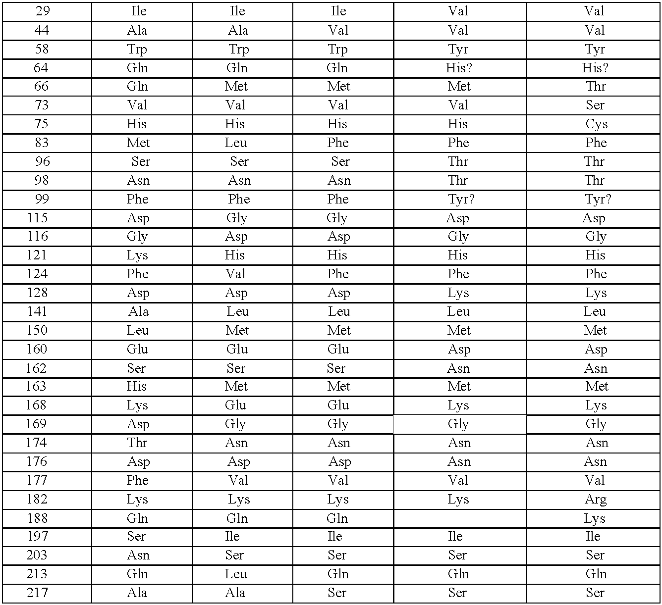 Aggregation reducing substitutions in mRed variants Residue mRed-595 mRedB-595 mRedX-595 2 AspGAC AspGAT AspGAT 3 AsnAAC SerAGC SerAGC 4 ThrACC ThrACT ThrACT 10 Glu Pro Pro 17 Tyr His His 29 Ile Val Val 58 Trp Tyr Tyr 85 Leu Leu Gln? 115 Gly Asp Gly? 116 Asp Gly Asp? 128 Asn Asp Asn? 160 Glu Glu Asp? 162 Ser Ser Asn? 168 Glu Lys Lys 188 Gln Lys Lys 198 Lys Lys Glu? The amino acids present at potentially substituted positions are listed for mRed-595, mRedB-595, and mRedX-595. mRedX-595 is the theoretical best variant after combination of all the site-directed aggregation-reducing substitutions. Superscripts indicate the codon used for residues 2-4. Undecided substitutions are indicated with a “?”. Substitutions relative to mRed-595 are highlighted in bold. Substitutions relative to DsRed.M1 Each variant in the table except mRed-595 is derived from the one to its left. mRed-595 is derived from DsRed.M1. A substitution relative to the parental variant is indicated by shading. Example 17