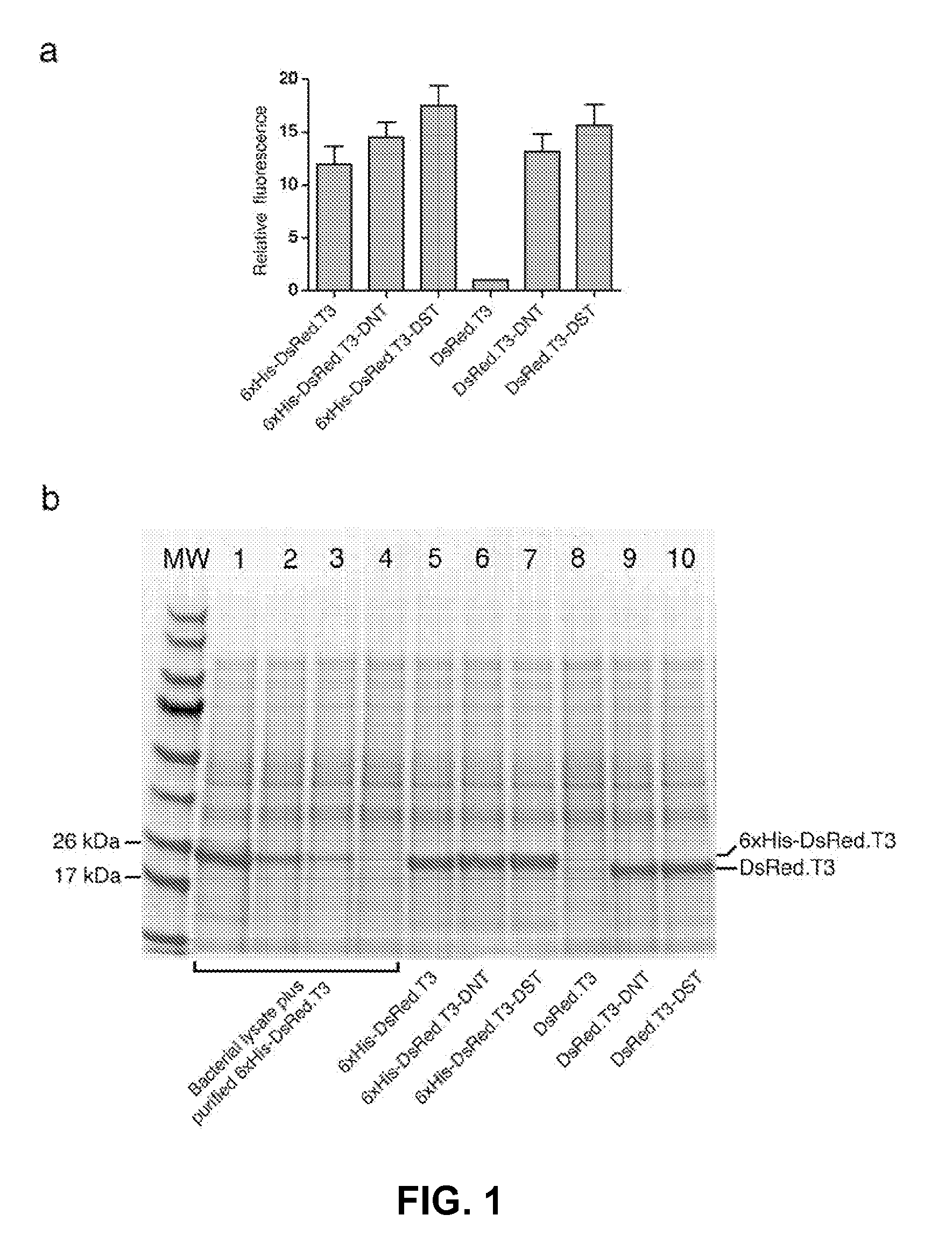 Data collection Space group P21212 Unit cell dimensions a = 115.5, b = 122.6, c = 164.9 Å α = β = γ = 90.0° Molecules per asymmetric unit 8 X-ray source APS 14-BM-C Wavelength (Å) 0.900 Resolution range (Å) 50-2.40 (2.49-2.40) Total/unique observations 597,626/91,172 Completeness (%) 98.0 (84.8)a <I/sigl> 14.3 (2.2) Rsym (%) 14.2 (61.4) Refinement and model statistics Rcryst (%) 22.3 Rfree (%) 27.1 Non-hydrogen atoms (solvent) 14,710 (491) Average B-factor (Å2) 35.3 RMS Bond lengths (Å) 0.011 RMS Bond angles (°) 1.4 aValues in parentheses are for the high-resolution shell. Protein crystal statistics for DsRed tetramers Protein (PDB code) Solvent content (%) Buried surface area (Å2)a Wild-type DsRed 35 4,900 (1ZGO) Wild-type DsRed 39 2,900 (1G7K) Wild-type DsRed 38 3,500 (1GGX) DsRed.T4 (2VAE) 47 3,400b DsRed-Max (2V4E) 58 1,700 b aFor a given tetramer, the total buried surface area of inter-tetramer interfaces was calculated from PISA analysis as the sum of all packing interfaces larger than 100 Å2. Intra-tetramer interfaces were excluded. bThe average buried surface area per tetramer is listed for structures with two tetramers per asymmetric unit. Amino acid substitutions in the new tetrameric variants Position DsRed.T3 DsRed-Max DsRed-Express2 2 Ala AspGAT AspGAT 3 SerTCC SerAGC SerAGC 4 Ser ThrACT ThrACT 6 Asp Asn Asn 10 Glu Pro Pro 17 Arg His His 36 Arg Lys Lys 47 Lys Gln Gln 66 Gln Met Gln 73 Val Thr Val 117 Cys Thr Thr 121 Lys His His 141 Met Leu Leu 169 Asp Gly Gly 175 Val Cys Val 188 Gln Lys Lys 210 Ile Val Val 217 Thr Thr Ala 219 Gly Ala Ala 225 Leu Gln Gln The amino acids present at potentially substituted positions are listed for DsRed-Max and DsRed-Express2. Substitutions relative to DsRed.T3 are highlighted in bold. Superscripts following an amino acid indicate the codon used if different than the Clontech, human optimized codon. Example 6