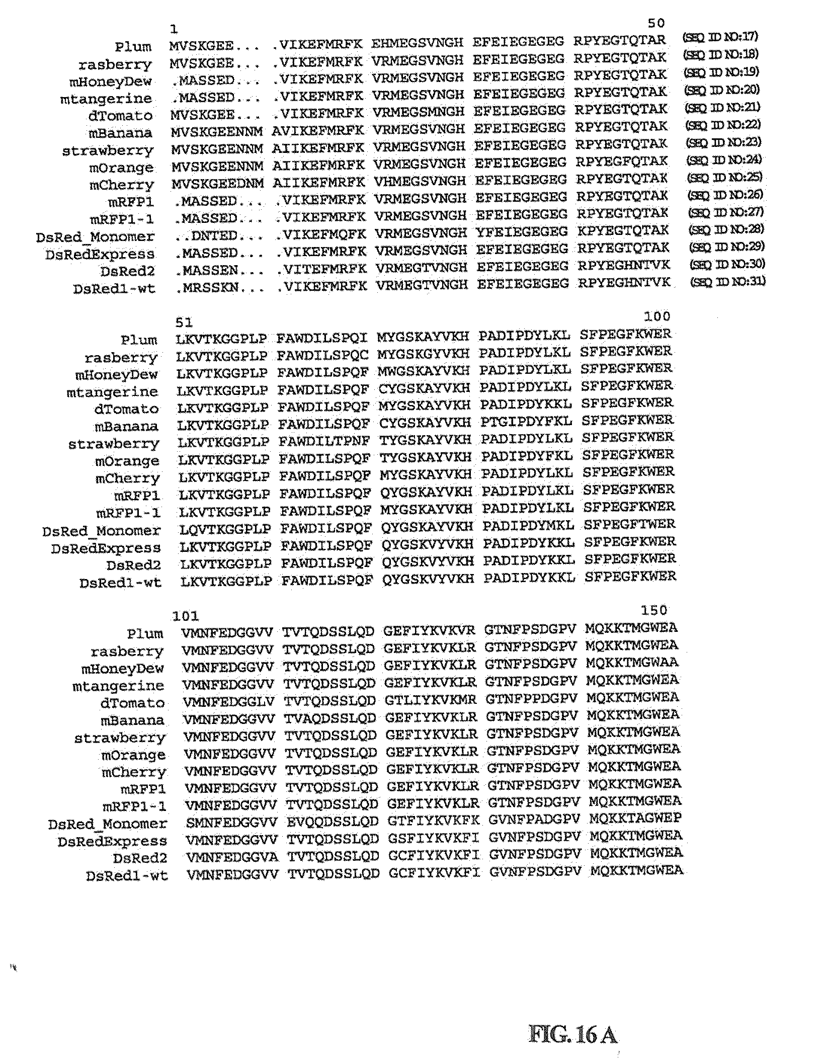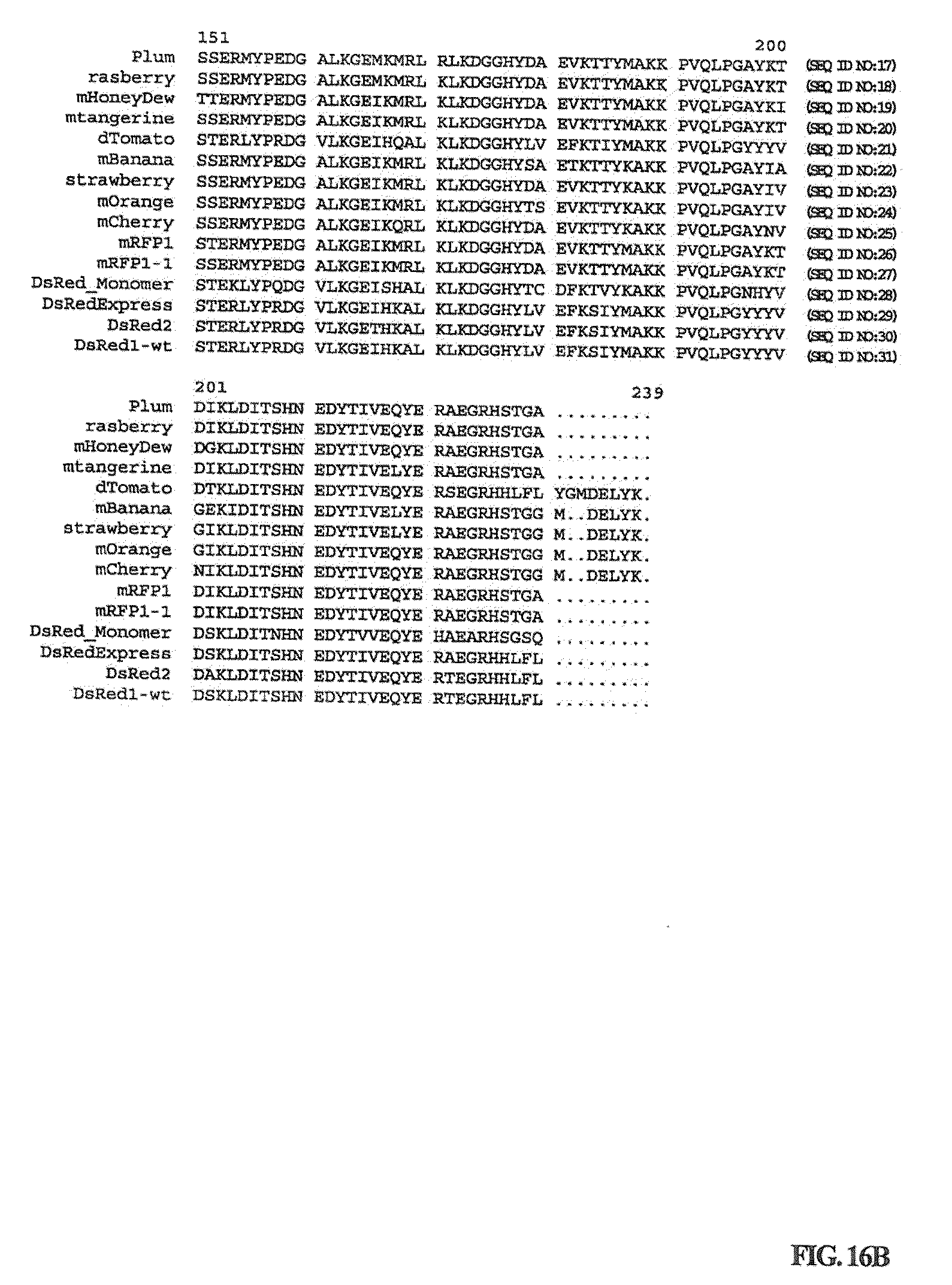 Amino acid substitutions in the mRed variants Residue DsRed.M1 mRed-555 mRed-580 mRed-595 6 Asp Asn Asn Asn 17 Arg Tyr Tyr Tyr 44 Ala Ala Ala Val 66 Gln Met Met Met 83 Met Leu Leu Phe 115 Asp Gly Gly Gly 116 Gly Asp Asp Asp 121 Lys His His His 124 Phe Phe Val Phe 141 Ala Leu Leu Leu 150 Leu Leu Met Met 163 His His Met Met 168 Lys Glu Glu Glu 169 Asp Gly Gly Gly 174 Thr Asn Asn Asn 177 Phe Phe Val Val 197 Ser Ser Ile Ile 203 Asn Ser Ser Ser 213 Gln Gln Leu Gln 217 Ala Ser Ala Ser The amino acids present at potentially substituted positions are listed for mRed-555, mRed-580, and mRed-595. Substitutions relative to DsRed.M1 are highlighted in bold. Summary of mRed spectral and biophysical properties Emission Molar Excitation Max Extinction Quantum Relative Protein Max (nm) (nm) Coefficient Yield Brightness WT 558 583 58,000 0.68 1.00 DsRed DsRed.M1 559 592 25,200 0.17 0.11 mRed-555 554 588 73,700 0.12 0.22 mRed-580 580 605 48,800 0.36 0.44 mRed-595 594 617 52,200 0.31 0.41 Example 14