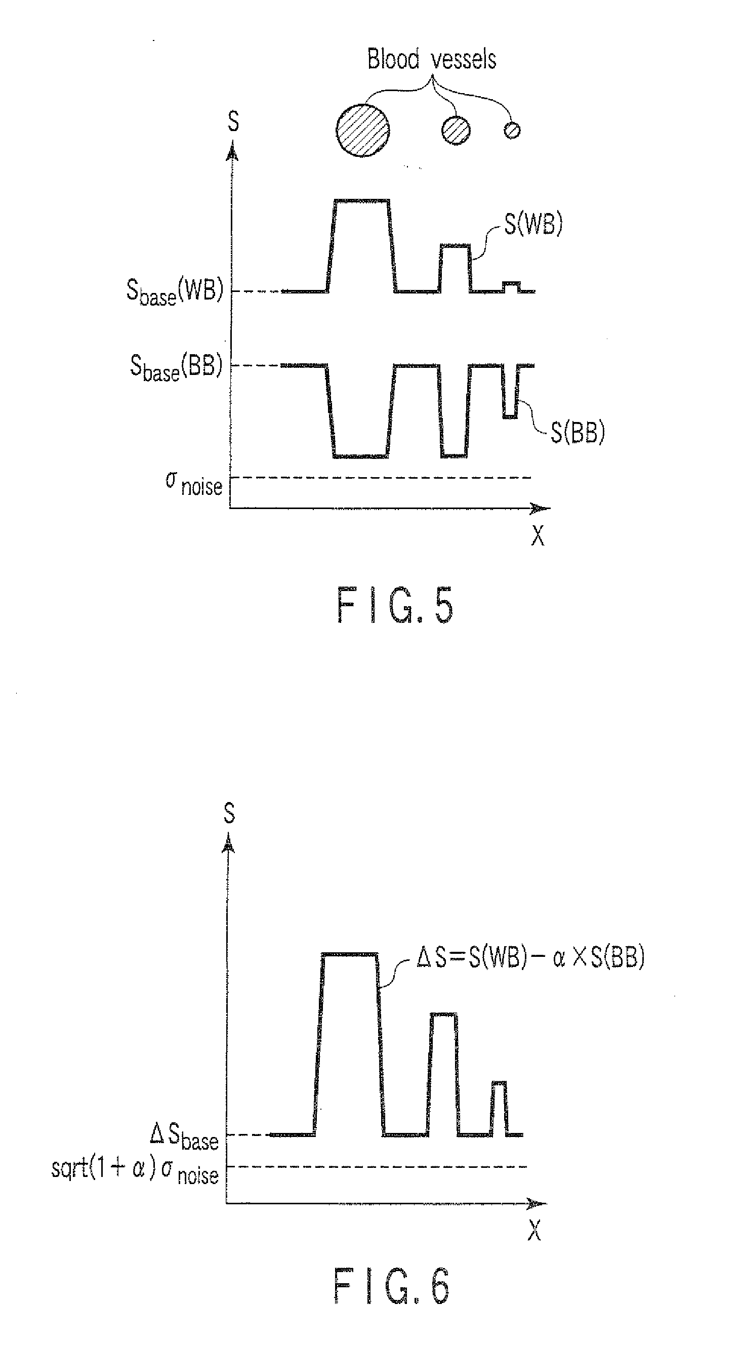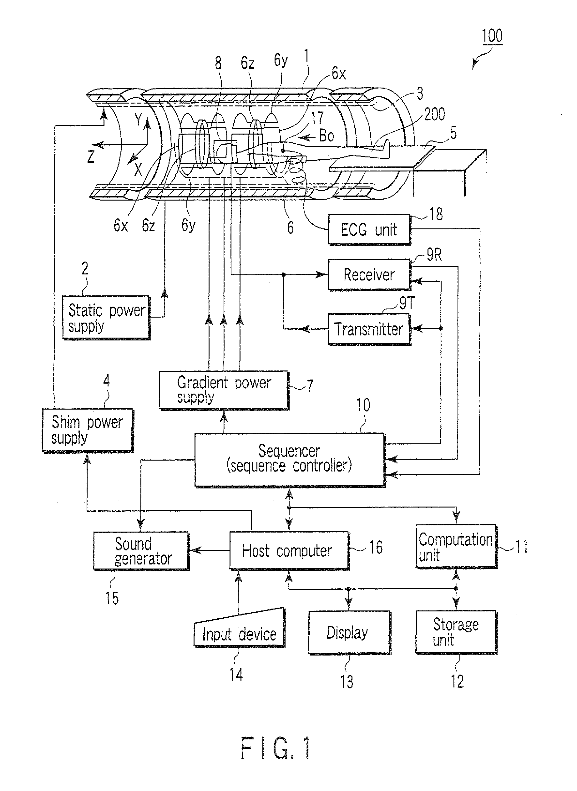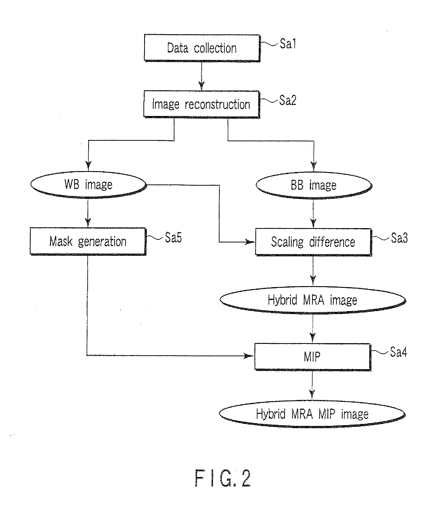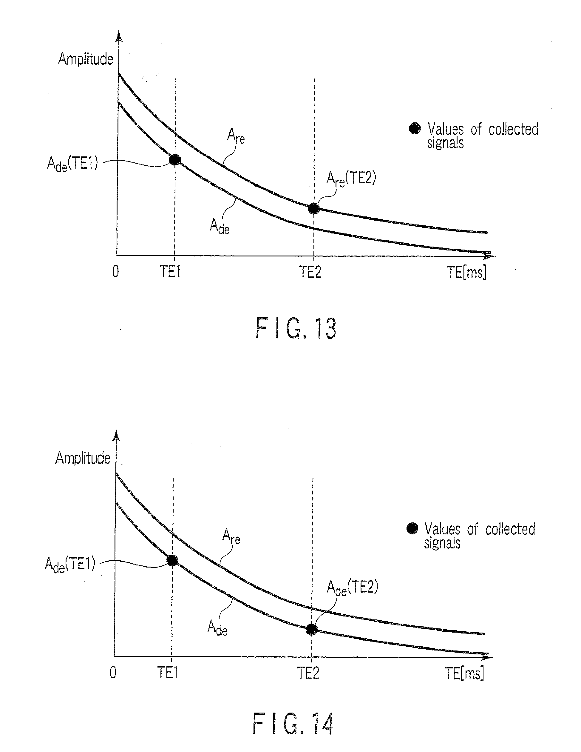 (B) Data Collection and Processing Method in Rephase/Dephase The use of dephase in combination with rephase enables a new application in contrast with the conventional use of rephase or dephase alone. As described above, a signal change is only caused by T1 relaxation, T2 relaxation and the susceptibility effect in rephase. In dephase, the flow effect is added to the effects in rephase. Thus, data for rephase and dephase can be computed with regard to one another to obtain an image in which the flow effect is separated from the components of the effects other than the flow effect, such as components associated with the stationary tissue and the susceptibility effect. Moreover, the above-mentioned computation makes it possible to obtain a universal parameter image more quantitatively representing the magnetic susceptibility and the flow effect. Clinically, this concerns the separation of arteries from veins using the physical intensity of the flow effect and the susceptibility effect in dephase and rephase. Here, devices in collection and clinical applications thereof are provided as examples. (B-1) Theory The theory is explained before the explanation of a specific processing procedure. The MR signal in rephase and dephase is a complex signal having an amplitude and a phase. If the Equations (9) and (10) are expressed as functions of an arbitrary gain K and TR, TE and the b factor, which are variable parameters of a sequence, while the gains of the MR signal are K, A0=M0, AT1 and AT2, the results are as shown in Equations (9′) and (10′): In addition, here, the b factor has only to exert the signal attenuation effect caused by the flow and is, therefore, sufficiently small, so that an effect AD of molecular diffusion occupied in A0 is negligible. In other words, A0 is the same in rephase and dephase. Further, longitudinal magnetization Mz is found by M0 AT1, and AT1 is determined by TR including an inflow effect in the case of the GRE. (B-1-1) Living Tissue, and Magnetic Susceptibility and Flow When the difference of nature between the magnetic susceptibility and flow is examined with respect to each tissue in a living body, much oxyhemoglobin (oxyHb) is contained and the susceptibility effect can, therefore, be neglected in arteries, so that arteries are not visualized in rephase. On the other hand, in veins, the flow effect is smaller than in arteries, and the susceptibility effect due to deoxyhemoglobin (deoxyHb) is added. Therefore, for blood vessels, if the phase change due to the flow is completely refocused in rephase, vein signals (susceptibility effect components) are dominantly visualized. As a result, both arteries and veins (susceptibility effect+flow components) are visualized in dephase. The stationary tissue is visualized equally in both rephase and dephase. Veins have a low flow, and there is no good method but to utilize the susceptibility effect to selectively visualize the veins, Moreover, with rephase alone, the contrast between arteries and the stationary tissue is not sufficient and it is, therefore, difficult to separate the arteries from the stationary tissue. (B-1-2) Optimum Sequence Parameter: TE For TE, TE=T2* is the optimum condition of TE that maximizes the CNR in both the amplitude and phase. In other words, when TE is equal to T2* of a target tissue, the maximum CNR is provided between the target tissue and its neighboring tissue having T2*. While T2* has a distribution depending on the collection condition or the kind of human tissue, blood also has the range of susceptibility that is important in the visualization of blood vessels, and white matter and gray matter can be regarded as substantially constant, so that it is substantially possible to determine TE under the above-mentioned condition when a constant voxel size is set. (B-1-3) Separation Between Flow Effect and Susceptibility Effect If imaging parameters such as the reception gain, TR, TE and the b factor are fixed, a comparison between rephase and dephase can be made without change. However, for more quantitative indices, the flow component should be calculated from, for example, Dflow and displayed, while the susceptibility components should be calculated from, for example, T2* or Δxand displayed. In that case, b=0 is substituted in rephase, and two or more TEs and at least three images are required. (B-1-3-1) Quantification of Flow Effect If an amplitude ratio and a phase difference between dephase and rephase are taken, the flow effect can be separated on the basis of Equation (11) as shown in the following Equations (12) and (13): Here, the phase difference Φflow may be found by a measurement using three directions of a velocity encode pulse VENC, as in phase contrast MR angiography (PC-MRA). However, this is not very realistic and is thus omitted here, and Dflow is found that is in a relation as shown in the following Equation (14) and that represents the degree of random phase dispersion due to various flow velocities and flows in various directions. Here, when the value b of dephase is represented by b(de), the signal intensities (amplitudes) of dephase and rephase are represented by A(de) and A(re), respectively, b=0 can be substituted for refuse. Therefore, Dflow is calculated by the following Equation (15): (B-1-3-2) Quantification of Susceptibility Effect First, the calculation of a quantitative index of the susceptibility effect using the amplitude is explained. An attenuation term Asus due to the susceptibility effect is dependent on TE, and a single TE cannot erase A0 containing the contributions of, for example, the T1 relaxation and T2 relaxation. Thus, more universalization can be achieved if T2* containingγΔB0σ or T2 is found. When two TEs (hereinafter, these are referred to as TE1 and TE2, with TE2>TE1) in rephase are used, signal strengths (amplitudes) A1 and A2 in TE1 and TE2 are determined by the following Equations (16) and (17): From Equation (16) and Equation (17