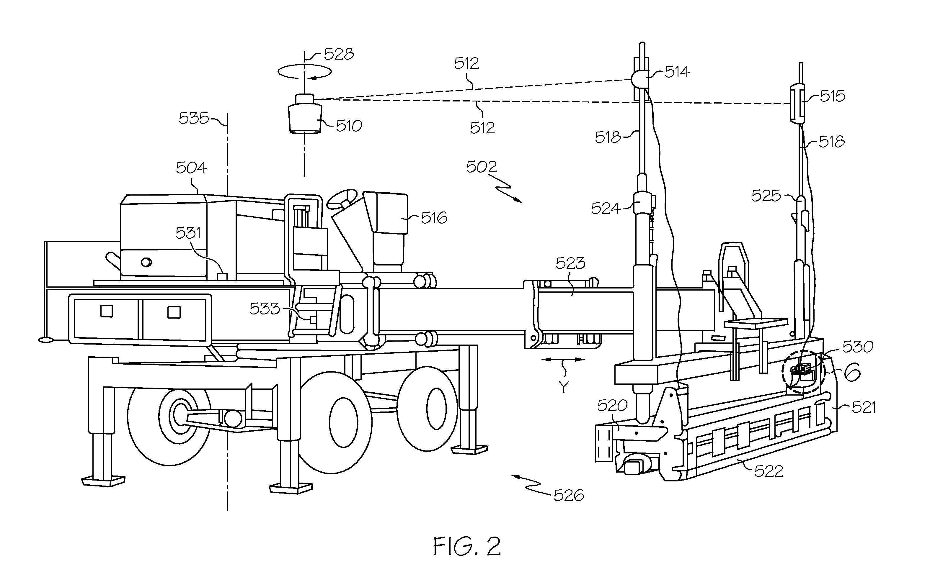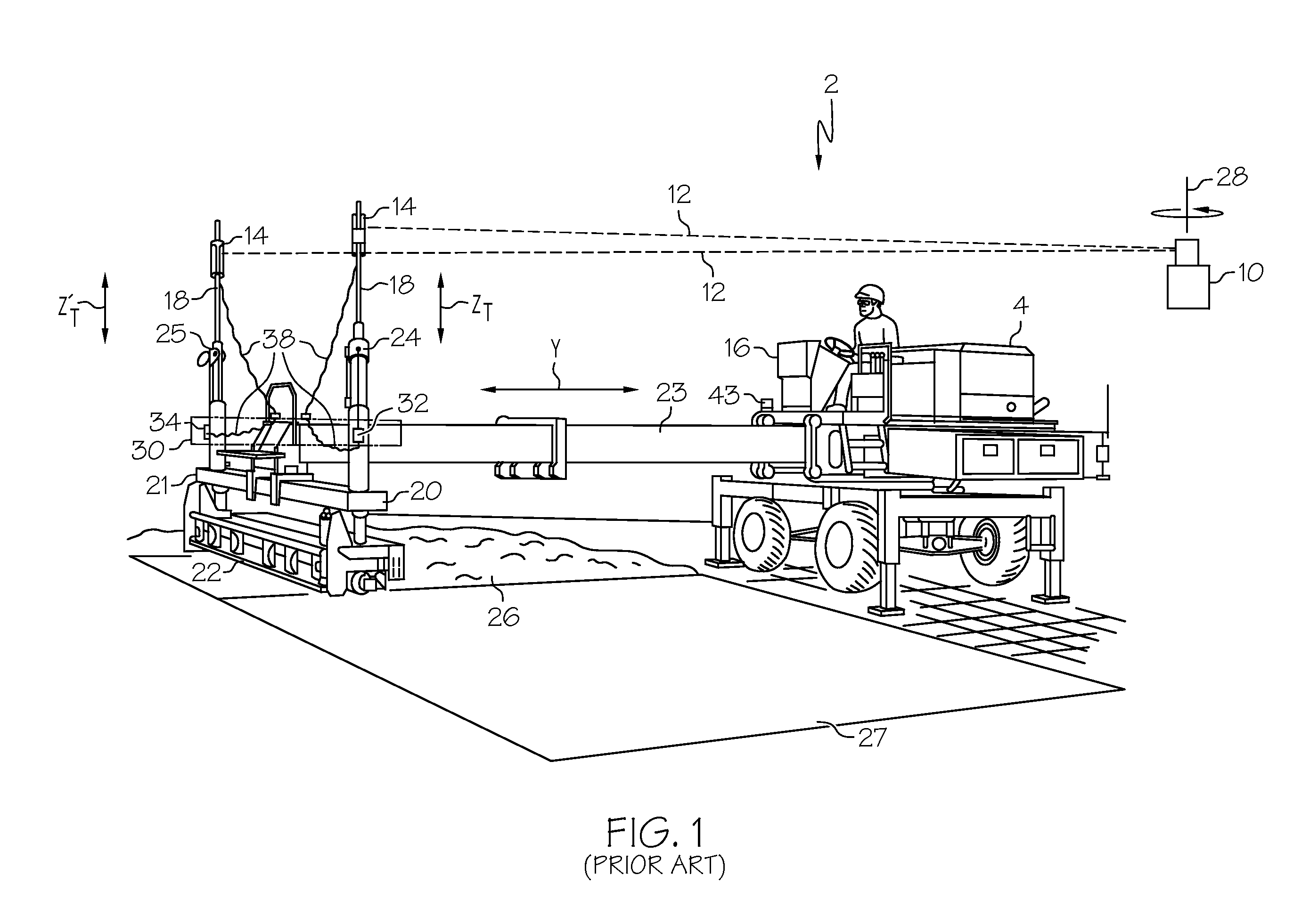 A control system for controlling movement of individual hydraulically moveable ends of a screed head carried by a boom of a machine so as to maintain a selected elevation position between each end of the screed head and a reference in a concrete paving application as the screed head is moved toward the machine, includes elevation receivers mounted on the ends of the screed head, and a first sensor for sensing the orientation of the screed head along its length from the first end to the second end of the screed head. A second sensor senses rotational movement of the machine which will induce an error in the output of the first sensor, and providing an output indicating such rotational movement. A control circuit is responsive to the elevation receivers and to the first and second sensors for controlling the hydraulically moveable ends of the screed head using the signals from the elevation receivers when they are not blocked, and for controlling the hydraulically movable ends of the screed head using the signals from the first and second sensors, and one of the elevation receivers when the other of the elevation receivers is blocked.