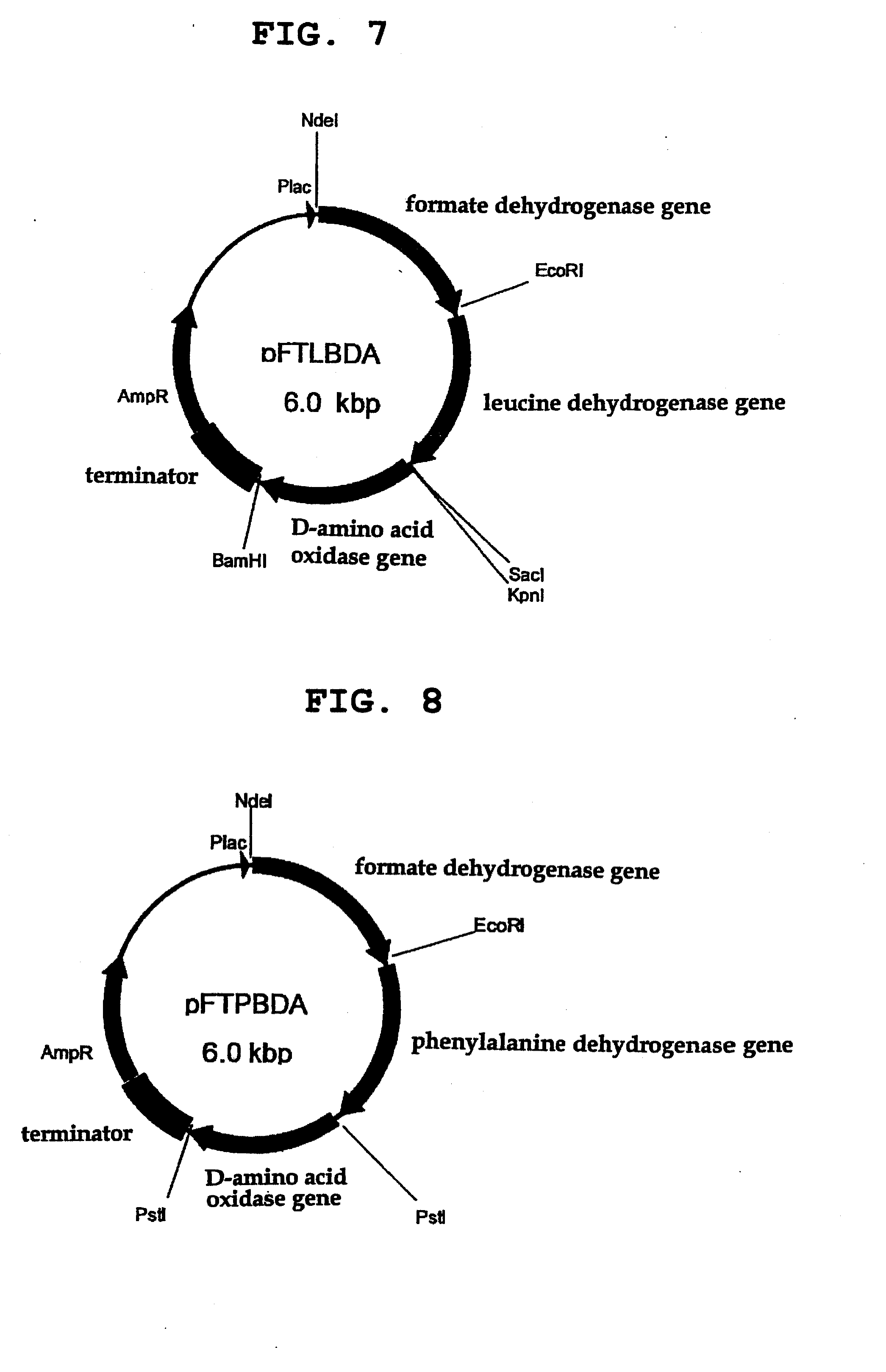 PCR was performed with DNA primers (Primer-13: Sequence Listing SEQ ID NO: 16, and Primer-14: Sequence Listing SEQ ID NO: 17) using as a template an expression plasmid pCDA003 as obtained in Example 6 designed to express a D-amino acid oxidase derived from Candida intermedia NBRC0761 strain. PCR was performed in the same manner as in Example 11-1. The DNA amplified fragment obtained by PCR was digested with the restriction enzyme PstI. This DNA fragment was ligated, using a T4 DNA ligase, with a fragment prepared by digesting with the enzyme a plasmid pFTPB obtained in Reference Example 5 below and designed to express a phenylalanine dehydrogenase and formate dehydrogenase. By mixing the plasmid obtained by the ligase reaction with the competent cells of Escherichia coli HB101, the competent cells were transformed. Among the transformants, those that maintained a plasmid in which the D-amino acid oxidase gene was inserted in the same direction as the phenylalanine dehydrogenase and formate dehydrogenase were selected by sequencing the DNA sequence of the plasmid. As a result, a plasmid pFTPBDA as shown in FIG. 8 that is designed to express D-amino acid oxidase, phenylalanine dehydrogenase and formate dehydrogenase was obtained.