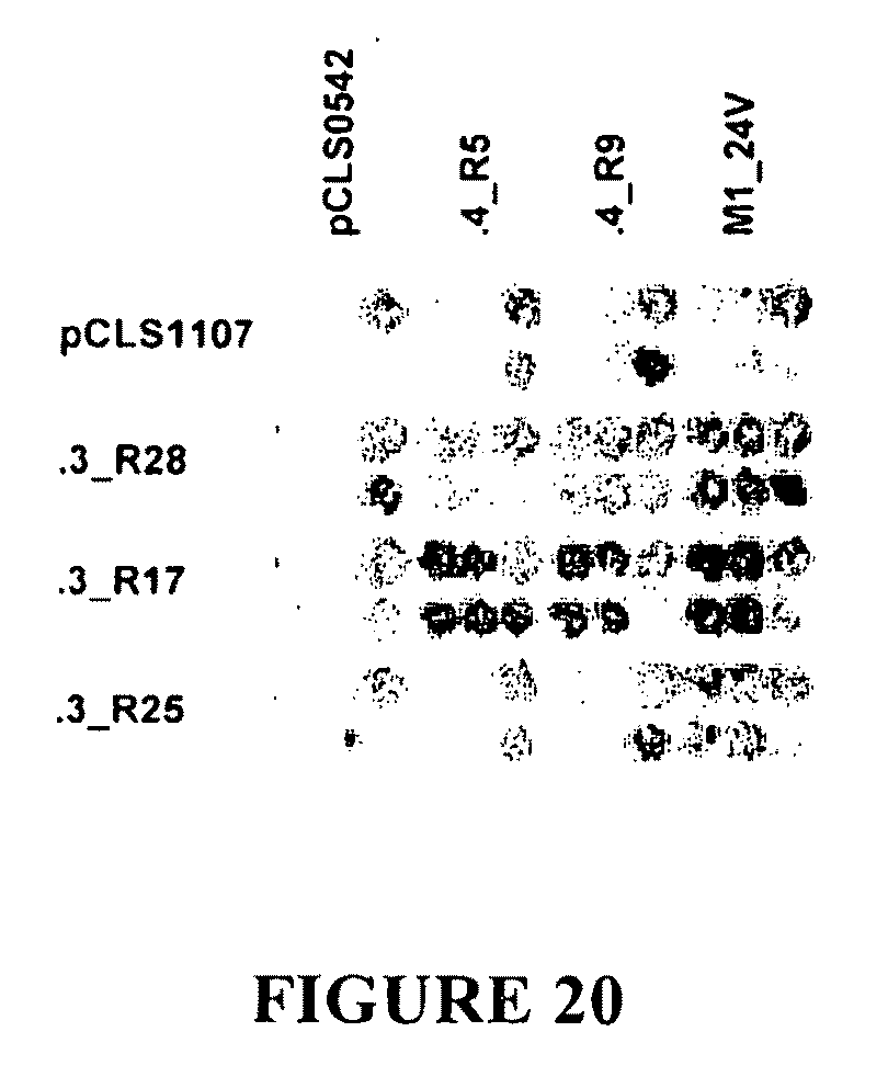 As the cleavage activity toward the IL2RG3.4 target for the seven clones Seq1 to Seq7 is still relatively weak, the mutations E80K and I132V were introduced by site-directed mutagenesis on a pool of mutants constituted by the Seq4, Seq5 and Seq7 clones. The screening of the resulting mutants gave very strong cutters against the IL2RG3.4 target and three clones among them with a unique sequence given in Table XVII were able to cleave the IL2RG3.6 target (FIG. 28).