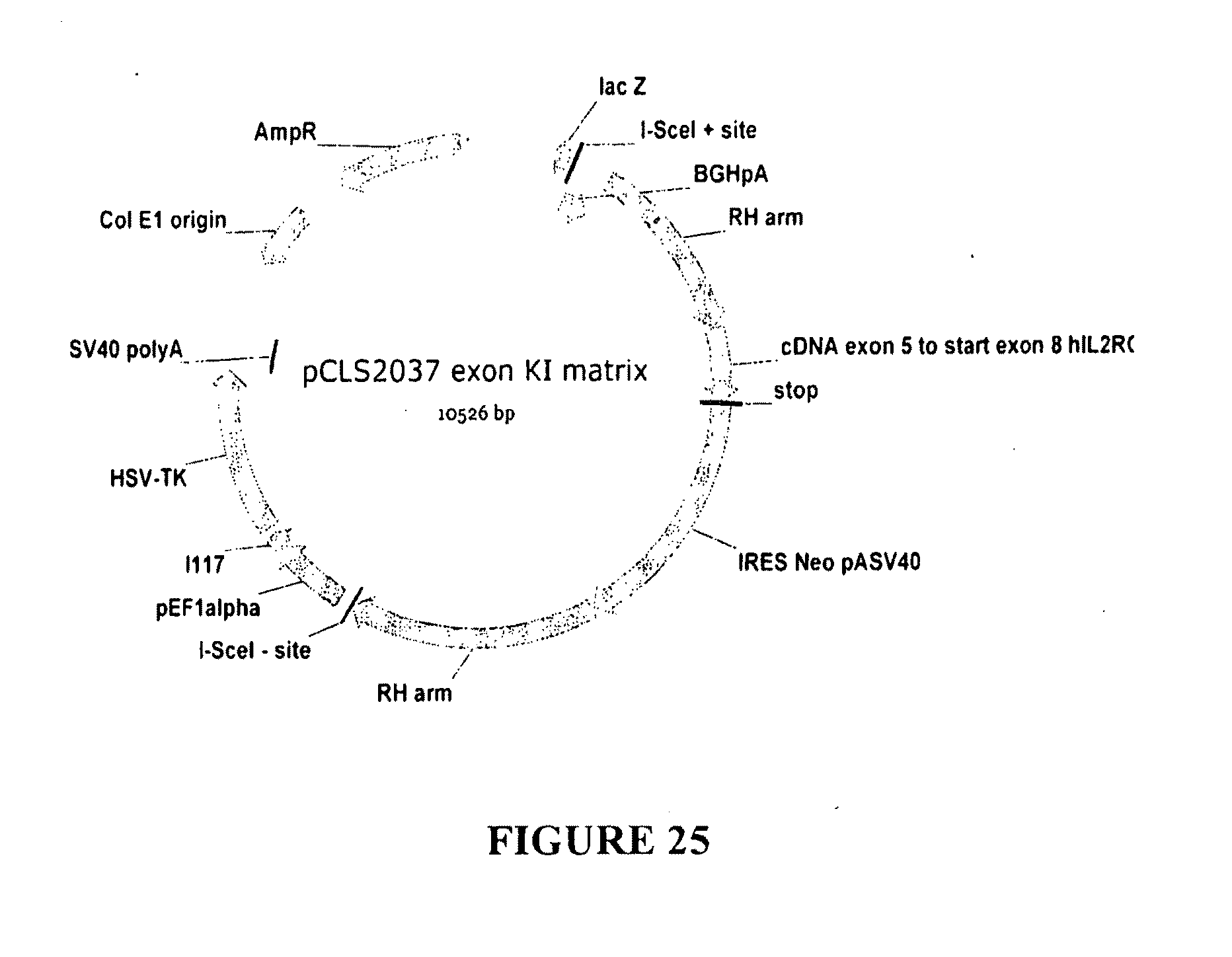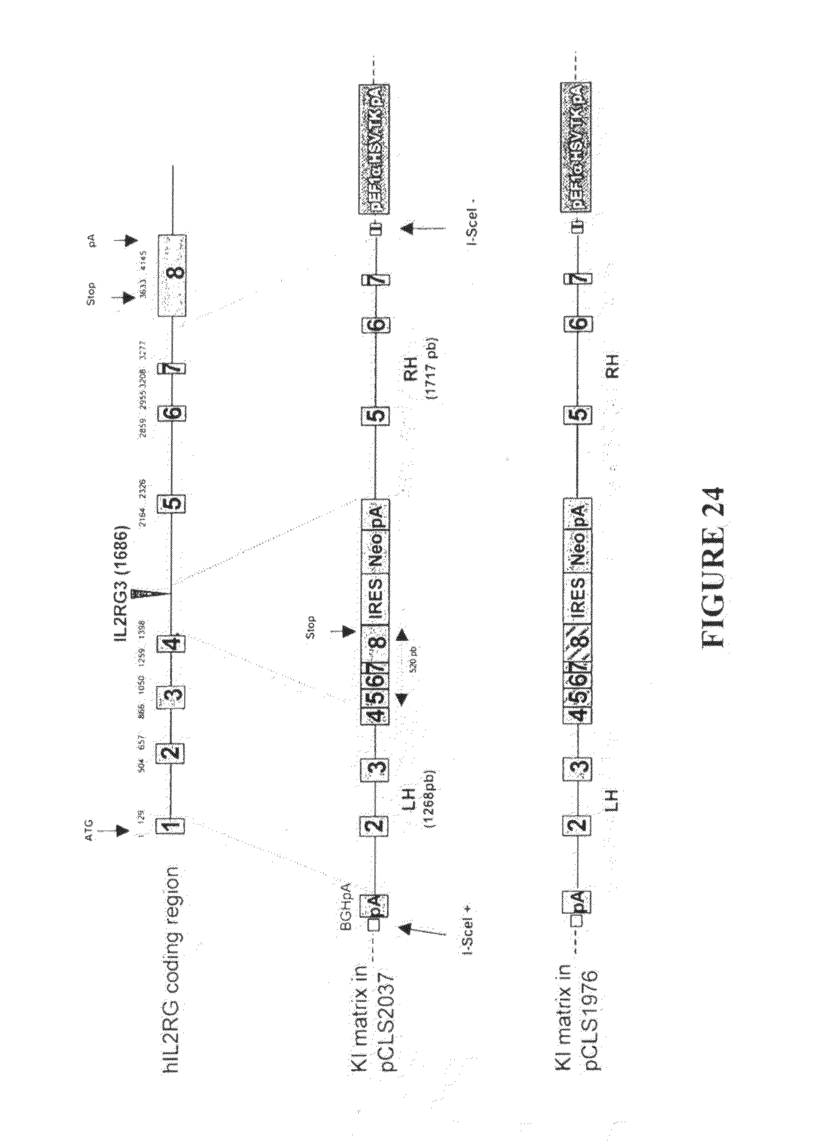 The Knock-in matrix is an exon knock-in strategy using a cDNA containing exons 5 to 8 of hIL2RG (cDNA fragment of 520 bp from 609 to 1128 in mRNA human IL2RG sequence NM000206) cloned between two human IL2RG homology arms (LH of 1268 bp from 130 to 1398 and RH of 1717 bp from 1740 to 3451 in the genomic sequence NC000023.9) (FIG. 24). The resulting plasmid is pCLS2037 (FIG. 25). The homology arms are amplified from genomic DNA purified from human cell lines (HEK-293 for LH and EBV transformed human B cells line for RH). The coding sequence of the neomycin resistance gene (Neo) is operatively linked to an IRES region and to the SV40 polyA signal. The neomycin expression cassette (IRES_Neo_pA) can be released and replaced by a pA site by enzymatic digestion. The thymidine kinase from HSV under the control of the EF1α promoter cloned after the RH arm can be used to eliminate clones with random integration of the KI matrix.