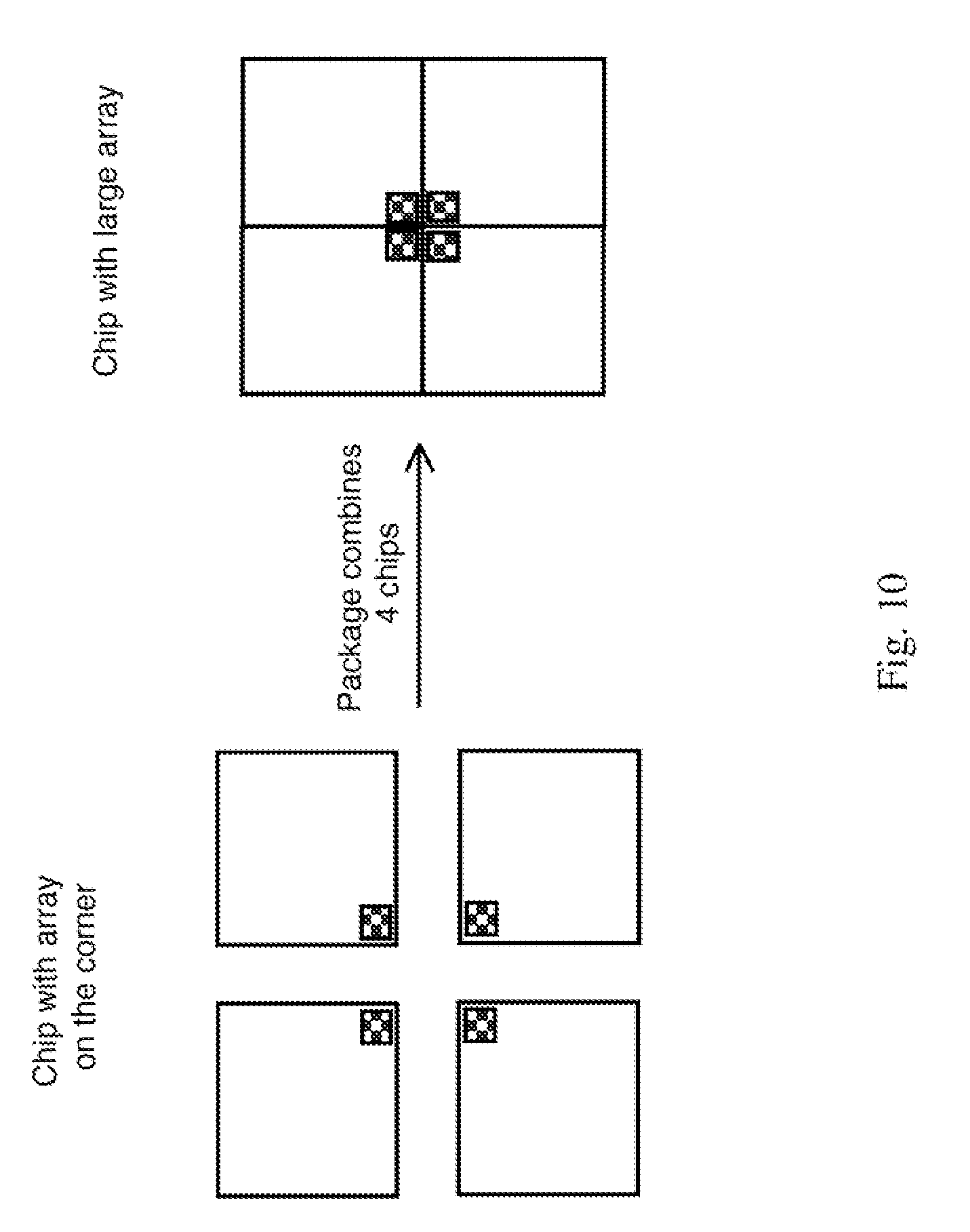 FIG. 10 shows an example of a chip design that sets a probe array on a corner of each chip. By combining four such chips in the way shown in the drawing, a larger array can be formed.