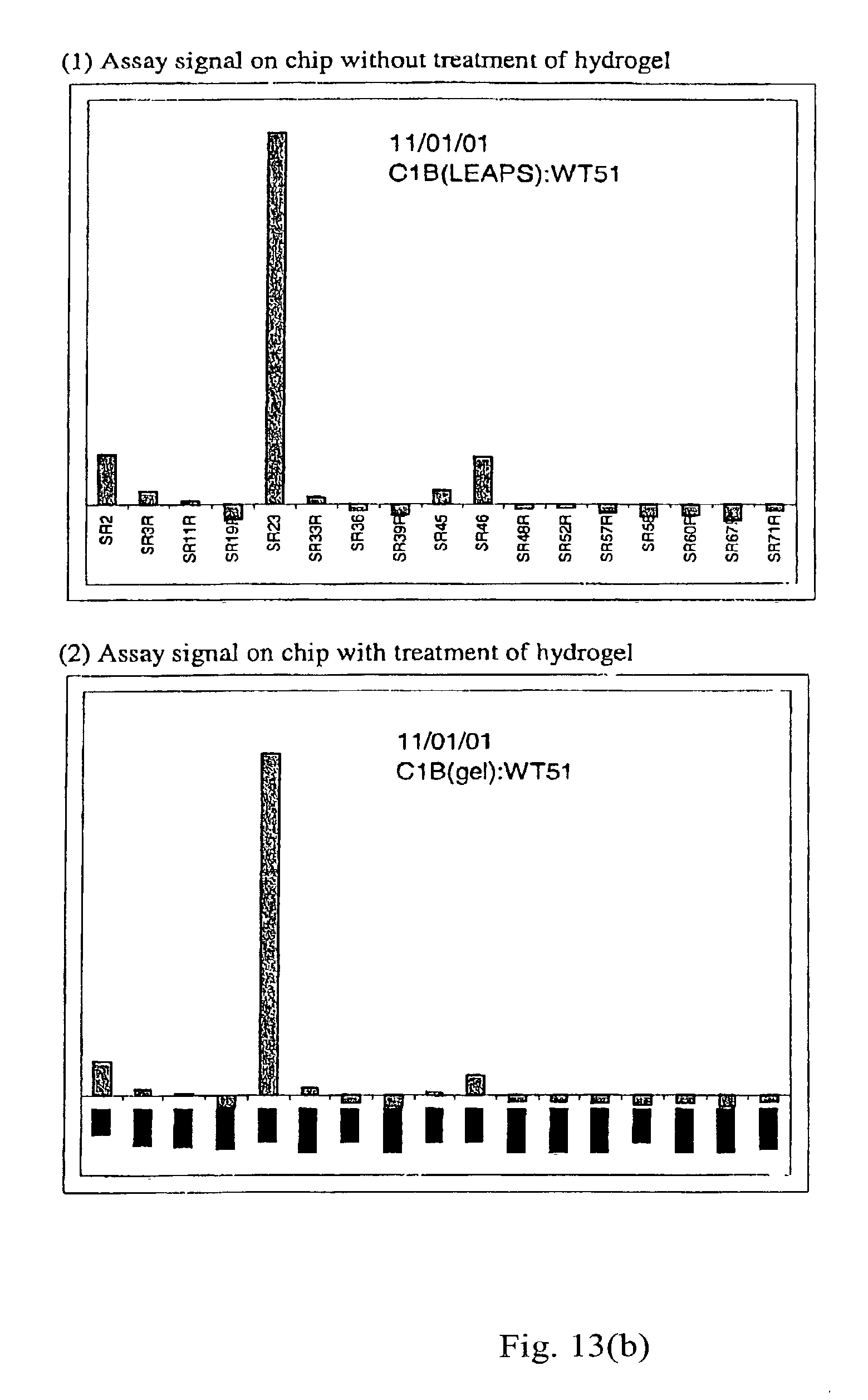 FIG. 13a is an illustration of the fluorescent images of a bead array on a chip before hydrogel formation and after gel peeling. The number of beads and bead positions were identical. FIG. 13b is an illustration of on-chip reaction results with hydrogel treatment and without hydrogel treatment.