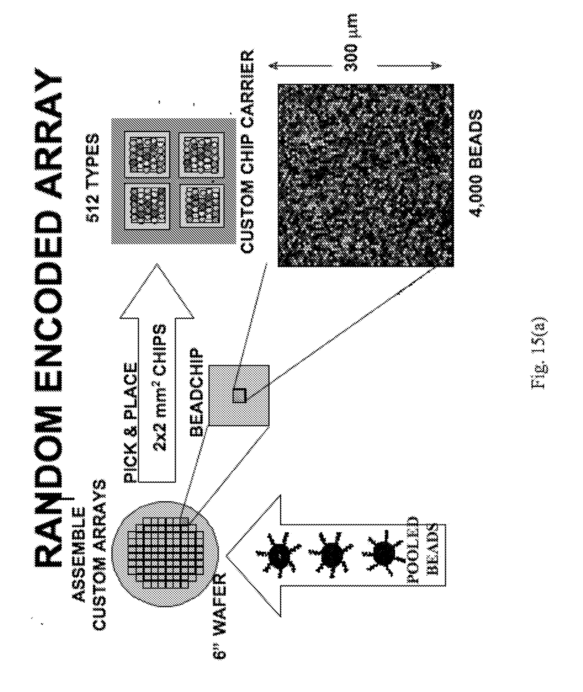 A multiplicity of chips can be produced by the assembly of random encoded arrays of probes that are displayed on beads. Each chip may include one or more random encoded bead arrays and may be cut from a uniquely identified wafer. As illustrated in FIG. 15 (a, b, c and d), a random encoded array of chips may be produced in a tiling process. This process may be facilitated by a choosing an appropriate chip shape in order to facilitate alignment and to maximize interlocking placement to decrease the array-to-array distance.