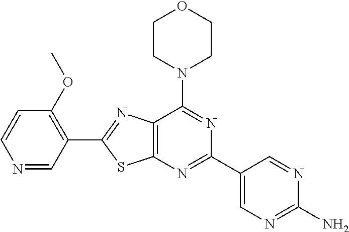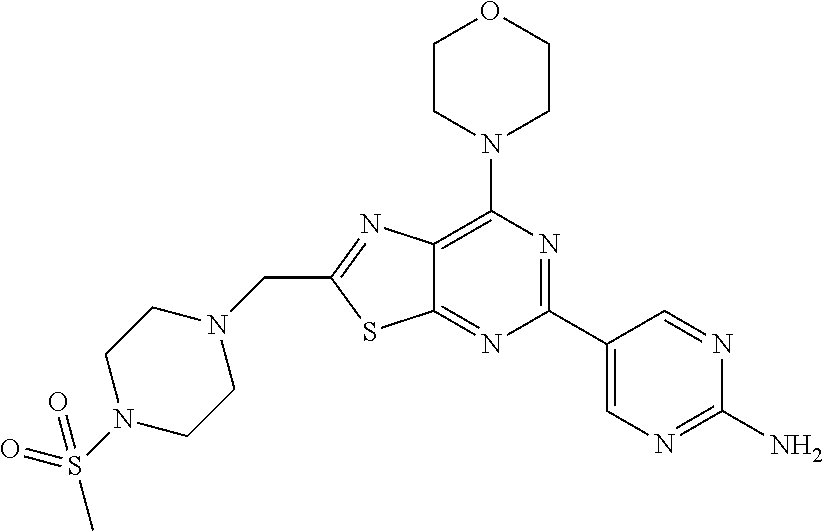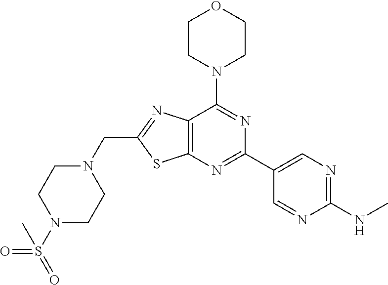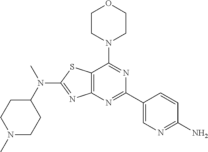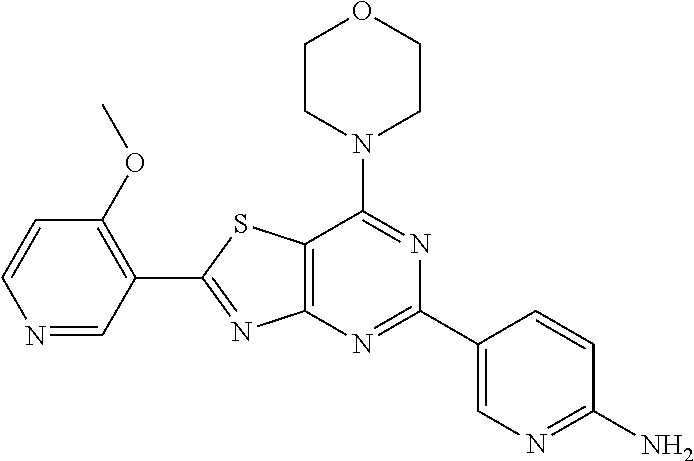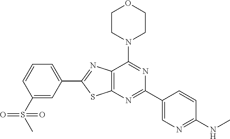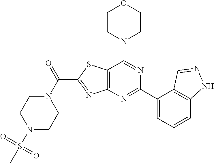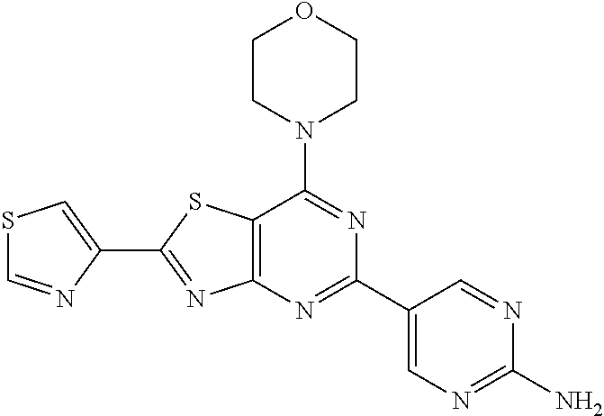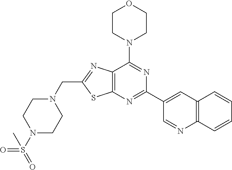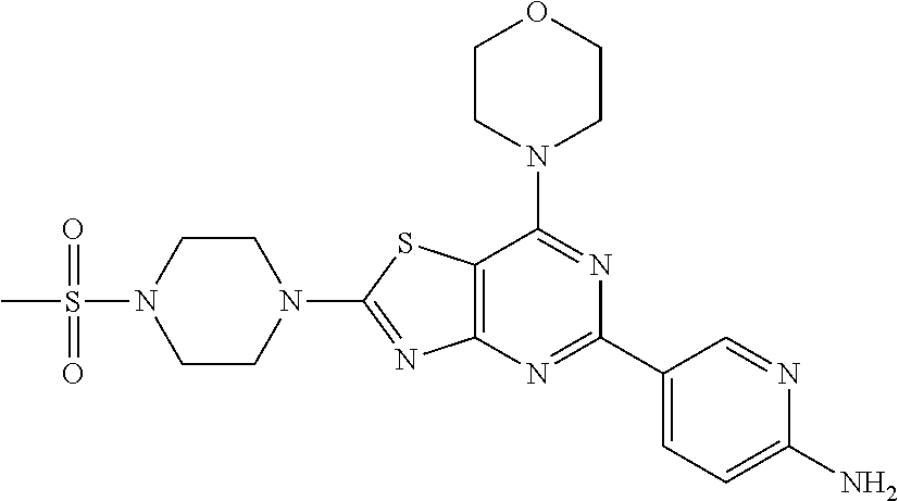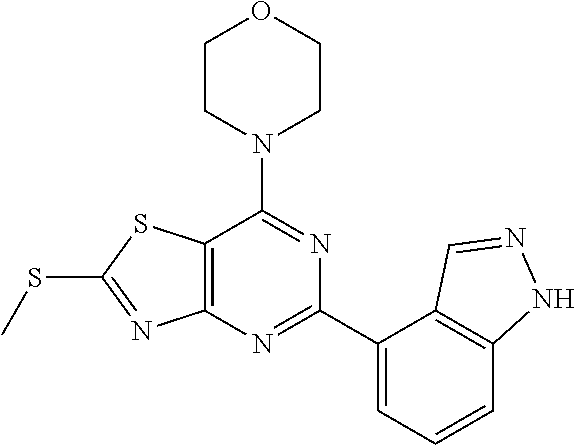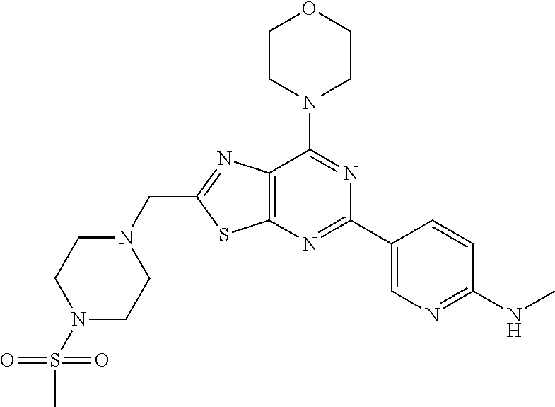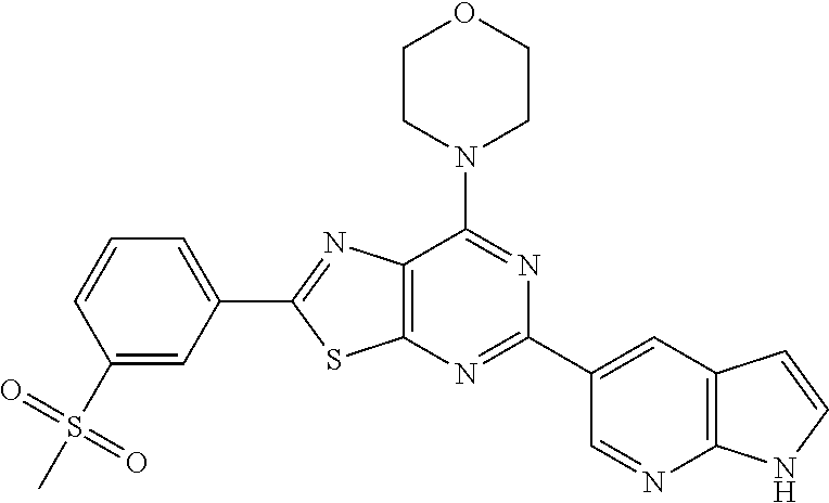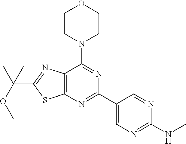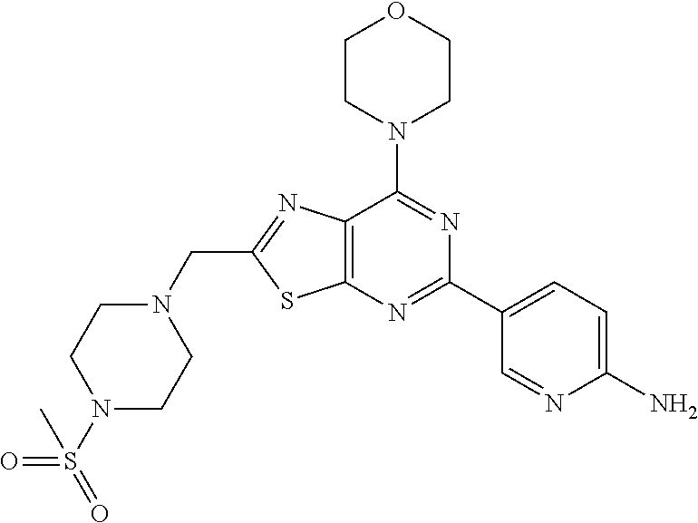 101. N-methyl-5-(2-((4- (methylsulfonyl)piperazin-1- yl)methyl)-7-morpholinothiazolo[5,4- d]pyrimidin-5-yl)pyridin-2-amine 102. 5-(2-(2-methoxypropan-2-yl)-7- morpholinothiazolo[5,4-d]pyrimidin- 5-yl)-N-methylpyridin-2-amine 103. 5-(2-(2-methoxypropan-2-yl)-7- morpholinothiazolo[5,4-d]pyrimidin- 5-yl)-N-methylpyrimidin-2-amine 104. 5-(2-(2-methoxypropan-2-yl)-7- morpholinothiazolo[5,4-d]pyrimidin- 5-yl)pyrimidin-2-amine 105. N-methyl-5-(2-(3- (methylsulfonyl)phenyl)-7- morpholinothiazolo[5,4-d]pyrimidin- 5-yl)pyridin-2-amine 106. (S)-2-hydroxy-1-(4-((7-morpholino- 5-(quinolin-3-ypthiazolo[5,4- d]pyrimidin-2-yl)methyl)piperazin-1- yl)propan-1-one 107. (S)-2-hydroxy-1-(4-((5-(2- (methylamino)pyrimidin-5-yl)-7- morpholinothiazolo[5,4-d]pyrimidin- 2-yl)methyl)piperazin-1-yl)propan-1- one 108. (S)-1-(4-((5-(2-aminopyrimidin-5- yl)-7-morpholinothiazolo[5,4- d]pyrimidin-2-yl)methyl)piperazin-1- yl)-2-hydroxypropan-1-one 109. 4-(2-(3-(methylsulfonyl)phenyl)-5- (1H-pyrrolo[2,3-b]pyridin-5- yl)thiazolo[5,4-d]pyrimidin-7- yl)morpholine 110. N,N-dimethyl-5-(2-((4- (methylsulfonyl)piperazin-1- yl)methyl)-7-morpholinothiazolo[5,4- d]pyrimidin-5-yl)pyrimidin-2-amine 111. 5-(2-((4-(methylsulfonyl)piperazin-1- yl)methyl)-7-morpholinothiazolo[5,4- d]pyrimidin-5-yl)pyridin-2-amine 112. 4-(2-((4-(methylsulfonyl)piperazin-1- yl)methyl)-5-(quinolin-3- yl)thiazolo [5,4-d]pyrimidin-7- yl)morpholine 113. N-methyl-5-(2-((4- (methylsulfonyl)piperazin-1- yl)methyl)-7-morpholinothiazolo[5,4- d]pyrimidin-5-yl)pyrimidin-2-amine 114. N-(3-(5-(2-(methylamino)pyrimidin- 5-yl)-7-morpholinothiazolo[5,4- d]pyrimidin-2- yl)benzyl)methanesulfonamide 115. N-(3-(7-morpholino-5-(1H- pyrrolo[2,3-b]pyridin-5- yl)thiazolo[5,4-d]pyrimidin-2- yl)benzyl)methanesulfonamide 116. 4-(2-((4-(methylsulfonyl)piperazin-1- yl)methyl)-5-(1H-pyrrolo[2,3- b]pyridin-5-yl)thiazolo[5,4- d]pyrimidin-7-yl)morpholine 117. 5-(2-aminopyrimidin-5-yl)-7- morpholino-N-(4- morpholinophenyl)thiazolo[5,4- d]pyrimidin-2-amine 118. 5-(2-aminopyrimidin-5-yl)-N-(4- (methylsulfonyl)phenyl)-7- morpholinothiazolo[5,4-d]pyrimidin- 2-amine 119. 5-(2-aminopyrimidin-5-yl)-7- morpholino-N-phenylthiazolo[5,4- d]pyrimidin-2-amine 120. 5-(2-(5-(methylsulfonyl)pyridin-3- yl)-7-morpholinothiazolo[5,4- d]pyrimidin-5-yl)pyrimidin-2-amine 121. N-(3-(5-(2-aminopyrimidin-5-yl)-7- morpholinothiazolo[5,4-d]pyrimidin- 2-yl)phenyl)methanesulfonamide 122. 5-(2-((4-(methylsulfonyl)piperazin-1- yl)methyl)-7-morpholinothiazolo[5,4- d]pyrimidin-5-yl)pyrimidin-2-amine 123. 5-(7-morpholino-2-(6- morpholinopyridin-3-yl)thiazolo[5,4- d]pyrimidin-5-yl)pyrimidin-2-amine 124. N-(3-(5-(2-aminopyrimidin-5-yl)-7- morpholinothiazolo[5,4-d]pyrimidin- 2-yl)phenyl)acetamide 125. N-(4-(5-(2-aminopyrimidin-5-yl)-7- morpholinothiazolo[5,4-d]pyrimidin- 2-yl)phenyl)methanesulfonamide 126. N-(3-(5-(2-aminopyrimidin-5-yl)-7- morpholinothiazolo[5,4-d]pyrimidin- 2-yl)benzyl)methanesulfonamide 127. 5-(2-(6-aminopyridin-3-yl)-7- morpholinothiazolo[5,4-d]pyrimidin- 5-yl)pyrimidin-2-amine 128. 5-(2-(4-methoxypyridin-3-yl)-7- morpholinothiazolo[5,4-d]pyrimidin- 5-yl)pyrimidin-2-amine 129. 4-(5-(1H-indazol-4-yl)-2-((4 (methylsulfonyl)piperazin-1- yl)methyl)thiazolo[5,4-d]pyrimidin- 7-yl)morpholine 130. 2-(5-(2-aminopyrimidin-5-yl)-7- morpholinothiazolo[5,4-d]pyrimidin- 2-yl)propan-2-ol 131. 5-(7-morpholinothiazolo[5,4- d]pyrimidin-5-yl)pyrimidin-2-amine 132. 5-(2-(3-(methylsulfonyl)phenyl)-7- morpholinothiazolo[5,4-d]pyrimidin- 5-yl)pyrimidin-2-amine 133. 5-(2-aminopyrimidin-5-yl)-N-(2- (methylsulfonyl)ethyl)-7- morpholinothiazolo[4,5-d]pyrimidin- 2-amine 134. 2-(4-(5-(2-aminopyrimidin-5-yl)-7- morpholinothiazolo[4,5-d]pyrimidin- 2-yl)piperazin-1-yl)ethanol 135. 5-(2-(4-(methylsulfonyl)piperazin-1- yl)-7-morpholinothiazolo[4,5- d]pyrimidin-5-yl)pyrimidin-2-amine 136. 5-(2-aminopyrimidin-5-yl)-7- morpholino-N-(2- morpholinoethypthiazolo[4,5- d]pyrimidin-2-amine 137. 2-(5-(2-aminopyrimidin-5-yl)-7- morpholinothiazolo[4,5-d]pyrimidin- 2-yl)propan-2-ol 138. 5-(7-morpholino-2-(thiazol-4- yl)thiazolo[4,5-d]pyrimidin-5- yl)pyrimidin-2-amine 139. 5-(2,7-dimorpholinothiazolo[4,5- d]pyrimidin-5-yl)pyrimidin-2-amine 140. N-(3-(5-(2-aminopyrimidin-5-yl)-7- morpholinothiazolo[4,5-d]pyrimidin- 2-yl)phenyl)acetamide 141. (5-(1H-indazol-4-yl)-7- morpholinothiazolo[4,5-d]pyrimidin- 2-yl)(4-(methylsulfonyl)piperazin-1- yl)methanone 142. 5-(2-(3-(methylsulfonyl)phenyl)-7- morpholinothiazolo[4,5-d]pyrimidin- 5-yl)pyrimidin-2-amine 143. 5-(2-(4-methoxypyridin-3-yl)-7- morpholinothiazolo[4,5-d]pyrimidin- 5-yl)pyridin-2-amine 144. 5-(6-aminopyridin-3-yl)-N-methyl-N- (1-methylpiperidin-4-yl)-7- morpholinothiazolo[4,5-d]pyrimidin- 2-amine 145. 5-(2-(4-(methylsulfonyl)piperazin-1- yl)-7-morpholinothiazolo[4,5- d]pyrimidin-5-yl)pyridin-2-amine 146. 5-(6-aminopyridin-3-yl)-7- morpholino-N-phenylthiazolo[4,5- d]pyrimidin-2-amine 147. 4-(5-(1H-indazol-4-yl)-2- (methylthio)thiazolo[4,5- d]pyrimidin-7-yl)morpholine EXAMPLES