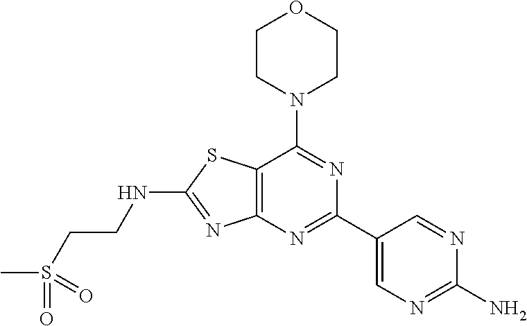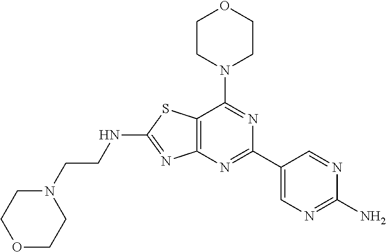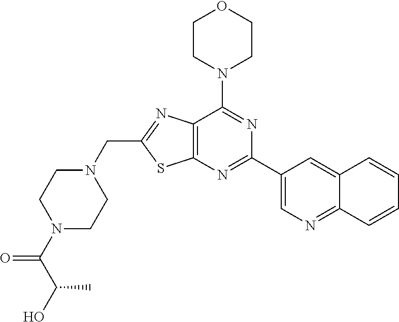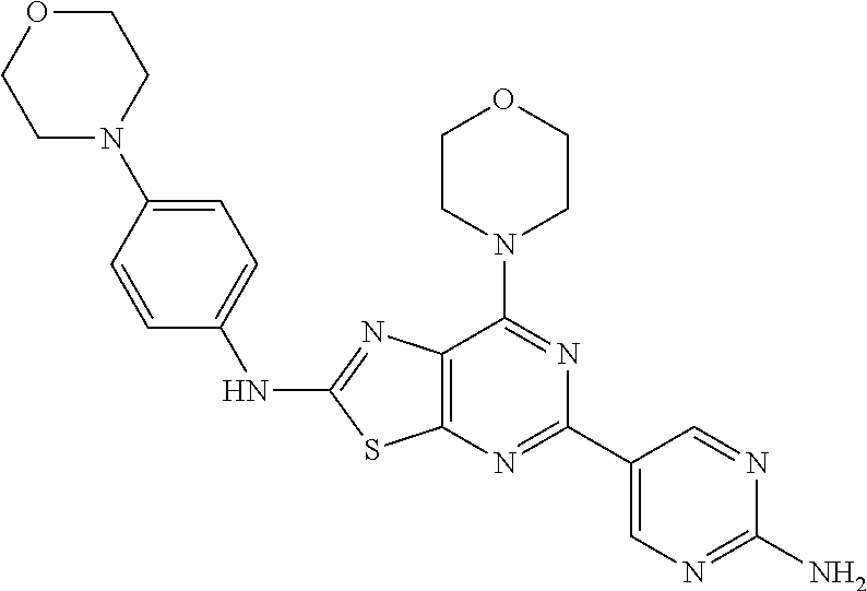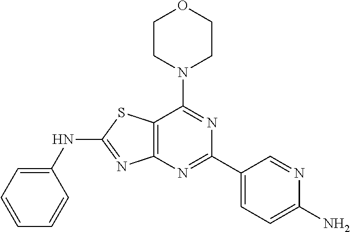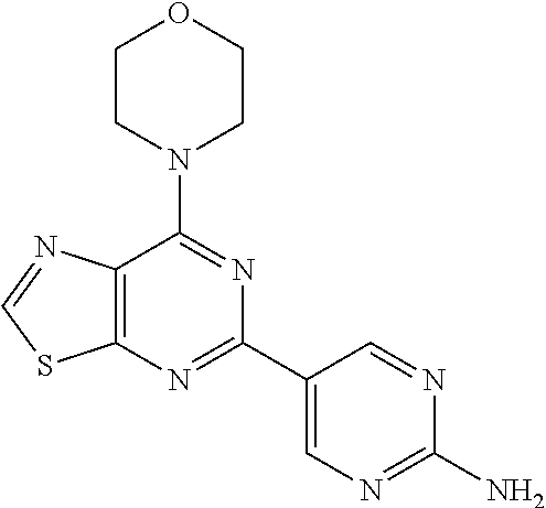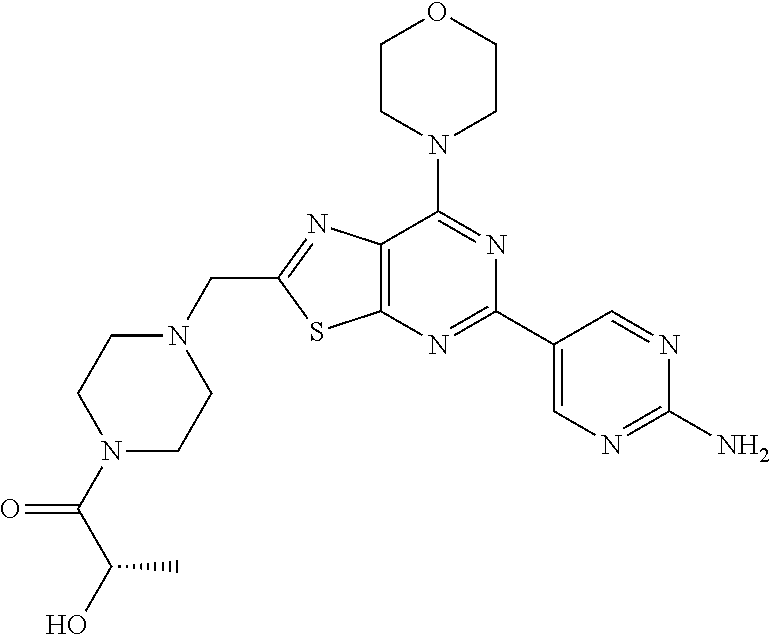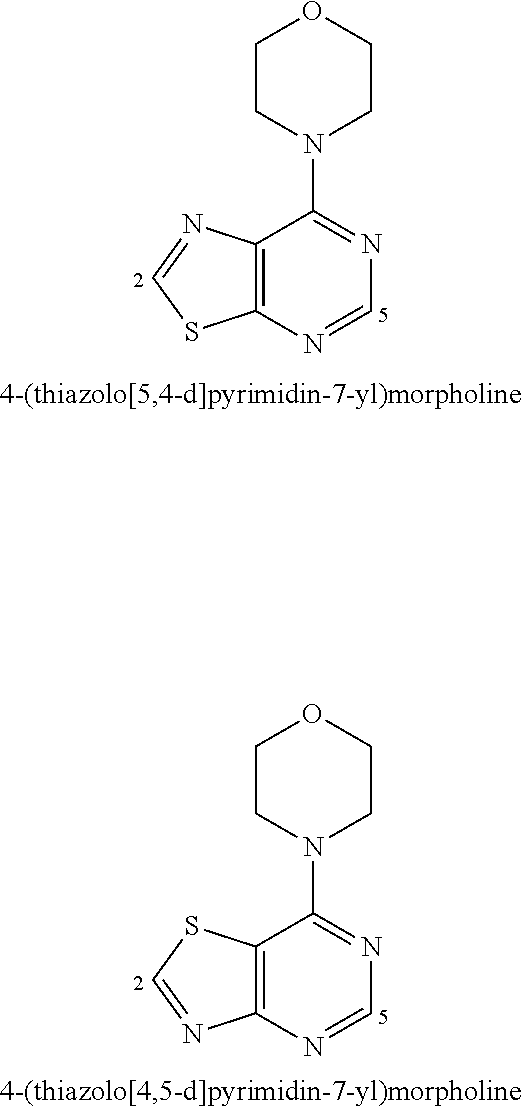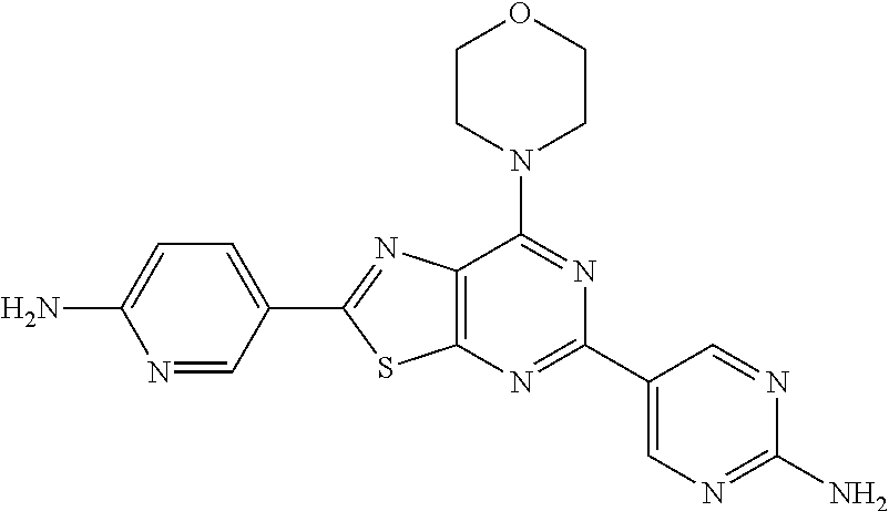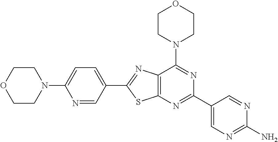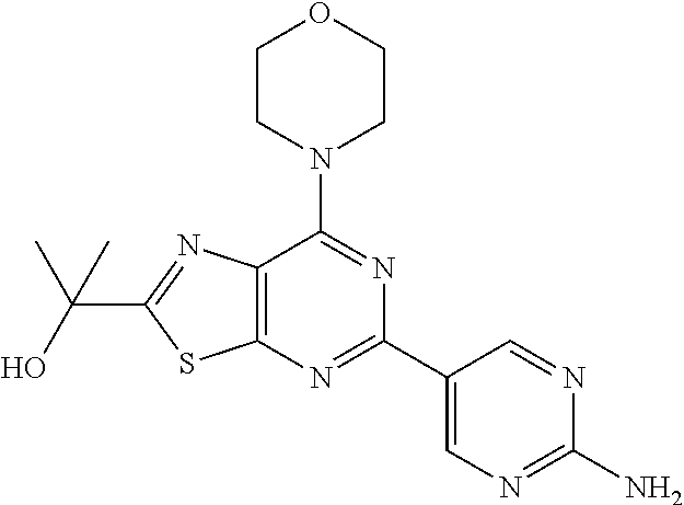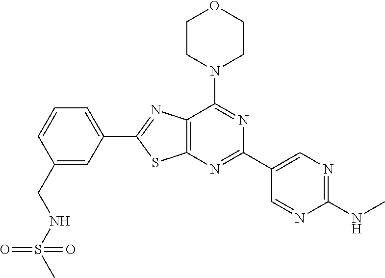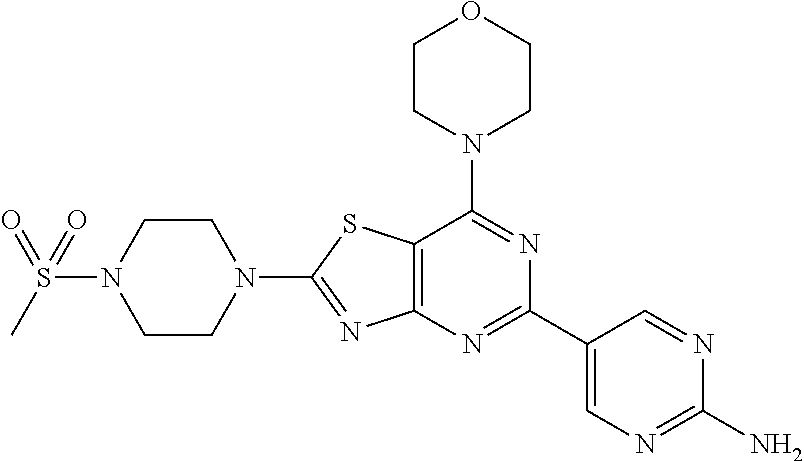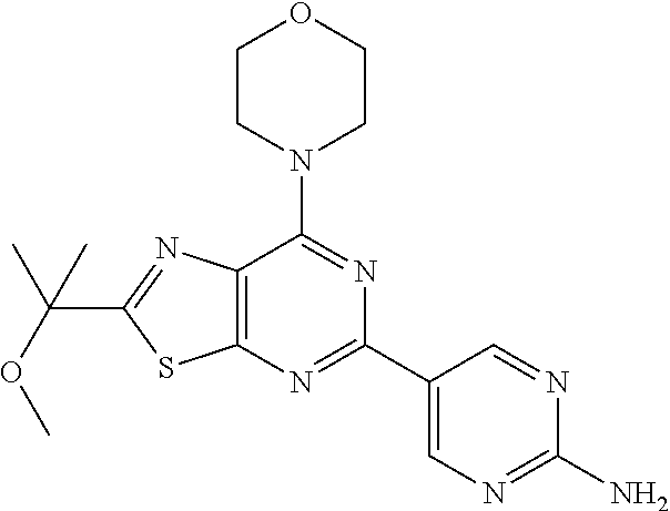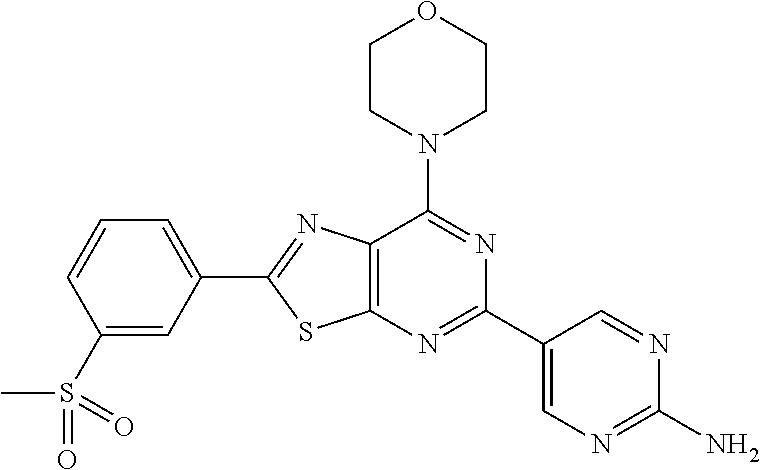 101. N-methyl-5-(2-((4- (methylsulfonyl)piperazin-1- yl)methyl)-7-morpholinothiazolo[5,4- d]pyrimidin-5-yl)pyridin-2-amine 102. 5-(2-(2-methoxypropan-2-yl)-7- morpholinothiazolo[5,4-d]pyrimidin- 5-yl)-N-methylpyridin-2-amine 103. 5-(2-(2-methoxypropan-2-yl)-7- morpholinothiazolo[5,4-d]pyrimidin- 5-yl)-N-methylpyrimidin-2-amine 104. 5-(2-(2-methoxypropan-2-yl)-7- morpholinothiazolo[5,4-d]pyrimidin- 5-yl)pyrimidin-2-amine 105. N-methyl-5-(2-(3- (methylsulfonyl)phenyl)-7- morpholinothiazolo[5,4-d]pyrimidin- 5-yl)pyridin-2-amine 106. (S)-2-hydroxy-1-(4-((7-morpholino- 5-(quinolin-3-ypthiazolo[5,4- d]pyrimidin-2-yl)methyl)piperazin-1- yl)propan-1-one 107. (S)-2-hydroxy-1-(4-((5-(2- (methylamino)pyrimidin-5-yl)-7- morpholinothiazolo[5,4-d]pyrimidin- 2-yl)methyl)piperazin-1-yl)propan-1- one 108. (S)-1-(4-((5-(2-aminopyrimidin-5- yl)-7-morpholinothiazolo[5,4- d]pyrimidin-2-yl)methyl)piperazin-1- yl)-2-hydroxypropan-1-one 109. 4-(2-(3-(methylsulfonyl)phenyl)-5- (1H-pyrrolo[2,3-b]pyridin-5- yl)thiazolo[5,4-d]pyrimidin-7- yl)morpholine 110. N,N-dimethyl-5-(2-((4- (methylsulfonyl)piperazin-1- yl)methyl)-7-morpholinothiazolo[5,4- d]pyrimidin-5-yl)pyrimidin-2-amine 111. 5-(2-((4-(methylsulfonyl)piperazin-1- yl)methyl)-7-morpholinothiazolo[5,4- d]pyrimidin-5-yl)pyridin-2-amine 112. 4-(2-((4-(methylsulfonyl)piperazin-1- yl)methyl)-5-(quinolin-3- yl)thiazolo [5,4-d]pyrimidin-7- yl)morpholine 113. N-methyl-5-(2-((4- (methylsulfonyl)piperazin-1- yl)methyl)-7-morpholinothiazolo[5,4- d]pyrimidin-5-yl)pyrimidin-2-amine 114. N-(3-(5-(2-(methylamino)pyrimidin- 5-yl)-7-morpholinothiazolo[5,4- d]pyrimidin-2- yl)benzyl)methanesulfonamide 115. N-(3-(7-morpholino-5-(1H- pyrrolo[2,3-b]pyridin-5- yl)thiazolo[5,4-d]pyrimidin-2- yl)benzyl)methanesulfonamide 116. 4-(2-((4-(methylsulfonyl)piperazin-1- yl)methyl)-5-(1H-pyrrolo[2,3- b]pyridin-5-yl)thiazolo[5,4- d]pyrimidin-7-yl)morpholine 117. 5-(2-aminopyrimidin-5-yl)-7- morpholino-N-(4- morpholinophenyl)thiazolo[5,4- d]pyrimidin-2-amine 118. 5-(2-aminopyrimidin-5-yl)-N-(4- (methylsulfonyl)phenyl)-7- morpholinothiazolo[5,4-d]pyrimidin- 2-amine 119. 5-(2-aminopyrimidin-5-yl)-7- morpholino-N-phenylthiazolo[5,4- d]pyrimidin-2-amine 120. 5-(2-(5-(methylsulfonyl)pyridin-3- yl)-7-morpholinothiazolo[5,4- d]pyrimidin-5-yl)pyrimidin-2-amine 121. N-(3-(5-(2-aminopyrimidin-5-yl)-7- morpholinothiazolo[5,4-d]pyrimidin- 2-yl)phenyl)methanesulfonamide 122. 5-(2-((4-(methylsulfonyl)piperazin-1- yl)methyl)-7-morpholinothiazolo[5,4- d]pyrimidin-5-yl)pyrimidin-2-amine 123. 5-(7-morpholino-2-(6- morpholinopyridin-3-yl)thiazolo[5,4- d]pyrimidin-5-yl)pyrimidin-2-amine 124. N-(3-(5-(2-aminopyrimidin-5-yl)-7- morpholinothiazolo[5,4-d]pyrimidin- 2-yl)phenyl)acetamide 125. N-(4-(5-(2-aminopyrimidin-5-yl)-7- morpholinothiazolo[5,4-d]pyrimidin- 2-yl)phenyl)methanesulfonamide 126. N-(3-(5-(2-aminopyrimidin-5-yl)-7- morpholinothiazolo[5,4-d]pyrimidin- 2-yl)benzyl)methanesulfonamide 127. 5-(2-(6-aminopyridin-3-yl)-7- morpholinothiazolo[5,4-d]pyrimidin- 5-yl)pyrimidin-2-amine 128. 5-(2-(4-methoxypyridin-3-yl)-7- morpholinothiazolo[5,4-d]pyrimidin- 5-yl)pyrimidin-2-amine 129. 4-(5-(1H-indazol-4-yl)-2-((4 (methylsulfonyl)piperazin-1- yl)methyl)thiazolo[5,4-d]pyrimidin- 7-yl)morpholine 130. 2-(5-(2-aminopyrimidin-5-yl)-7- morpholinothiazolo[5,4-d]pyrimidin- 2-yl)propan-2-ol 131. 5-(7-morpholinothiazolo[5,4- d]pyrimidin-5-yl)pyrimidin-2-amine 132. 5-(2-(3-(methylsulfonyl)phenyl)-7- morpholinothiazolo[5,4-d]pyrimidin- 5-yl)pyrimidin-2-amine 133. 5-(2-aminopyrimidin-5-yl)-N-(2- (methylsulfonyl)ethyl)-7- morpholinothiazolo[4,5-d]pyrimidin- 2-amine 134. 2-(4-(5-(2-aminopyrimidin-5-yl)-7- morpholinothiazolo[4,5-d]pyrimidin- 2-yl)piperazin-1-yl)ethanol 135. 5-(2-(4-(methylsulfonyl)piperazin-1- yl)-7-morpholinothiazolo[4,5- d]pyrimidin-5-yl)pyrimidin-2-amine 136. 5-(2-aminopyrimidin-5-yl)-7- morpholino-N-(2- morpholinoethypthiazolo[4,5- d]pyrimidin-2-amine 137. 2-(5-(2-aminopyrimidin-5-yl)-7- morpholinothiazolo[4,5-d]pyrimidin- 2-yl)propan-2-ol 138. 5-(7-morpholino-2-(thiazol-4- yl)thiazolo[4,5-d]pyrimidin-5- yl)pyrimidin-2-amine 139. 5-(2,7-dimorpholinothiazolo[4,5- d]pyrimidin-5-yl)pyrimidin-2-amine 140. N-(3-(5-(2-aminopyrimidin-5-yl)-7- morpholinothiazolo[4,5-d]pyrimidin- 2-yl)phenyl)acetamide 141. (5-(1H-indazol-4-yl)-7- morpholinothiazolo[4,5-d]pyrimidin- 2-yl)(4-(methylsulfonyl)piperazin-1- yl)methanone 142. 5-(2-(3-(methylsulfonyl)phenyl)-7- morpholinothiazolo[4,5-d]pyrimidin- 5-yl)pyrimidin-2-amine 143. 5-(2-(4-methoxypyridin-3-yl)-7- morpholinothiazolo[4,5-d]pyrimidin- 5-yl)pyridin-2-amine 144. 5-(6-aminopyridin-3-yl)-N-methyl-N- (1-methylpiperidin-4-yl)-7- morpholinothiazolo[4,5-d]pyrimidin- 2-amine 145. 5-(2-(4-(methylsulfonyl)piperazin-1- yl)-7-morpholinothiazolo[4,5- d]pyrimidin-5-yl)pyridin-2-amine 146. 5-(6-aminopyridin-3-yl)-7- morpholino-N-phenylthiazolo[4,5- d]pyrimidin-2-amine 147. 4-(5-(1H-indazol-4-yl)-2- (methylthio)thiazolo[4,5- d]pyrimidin-7-yl)morpholine EXAMPLES