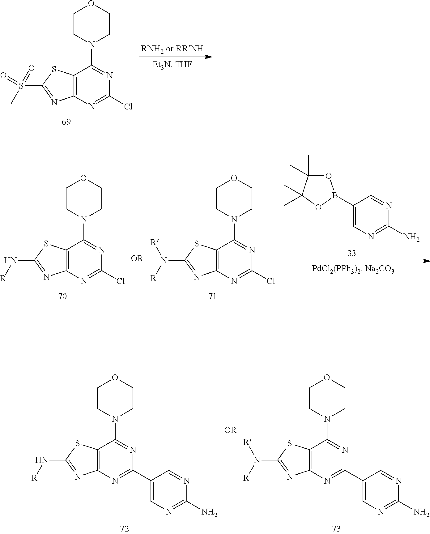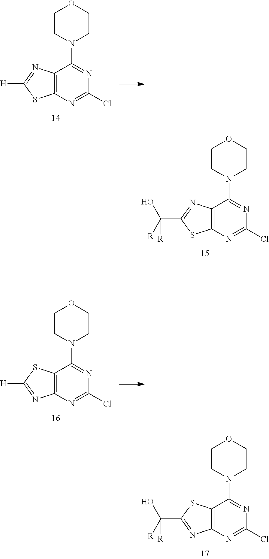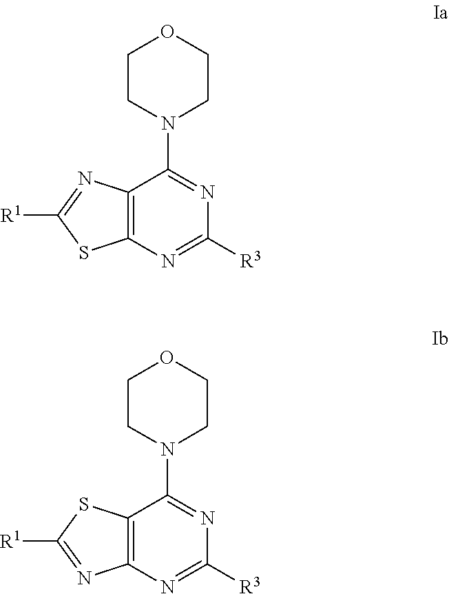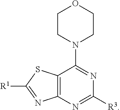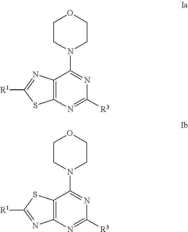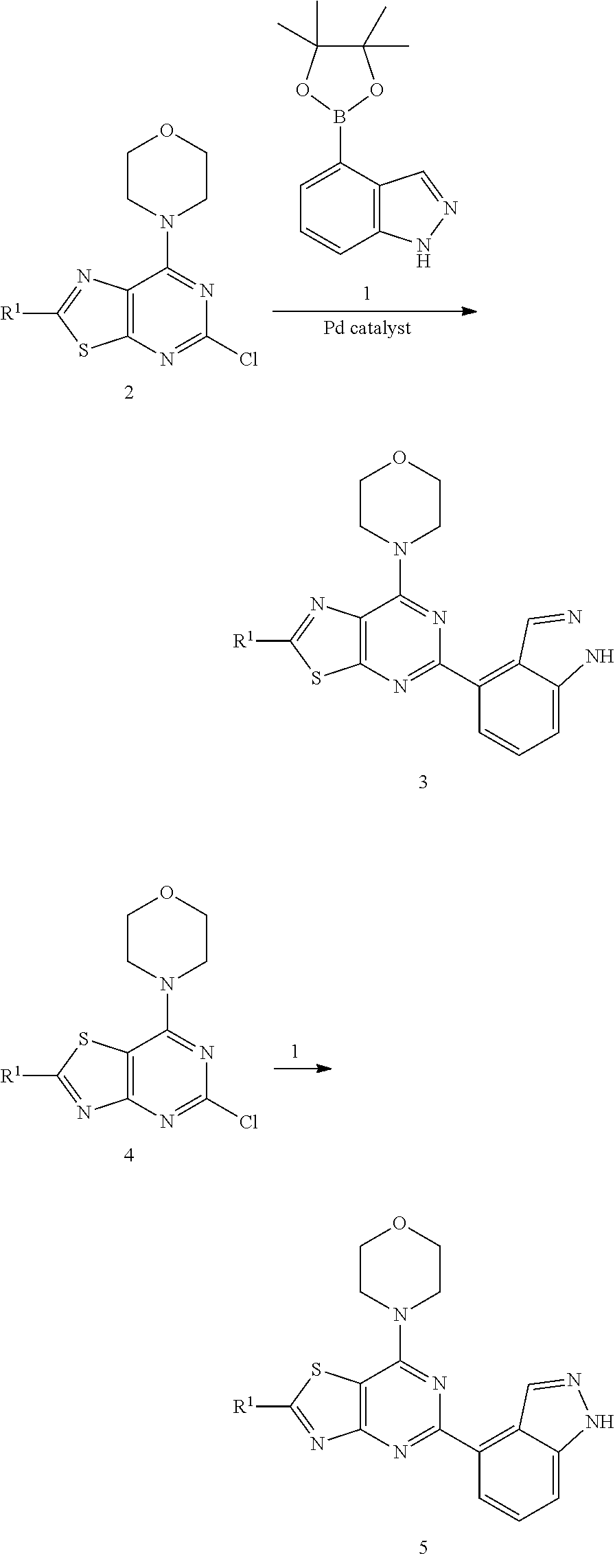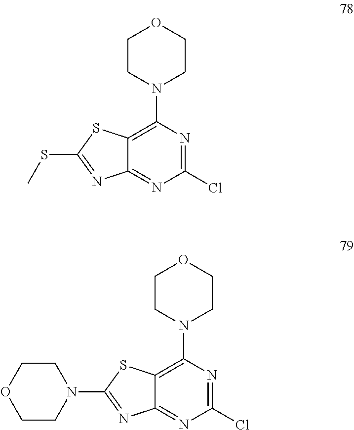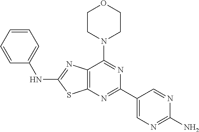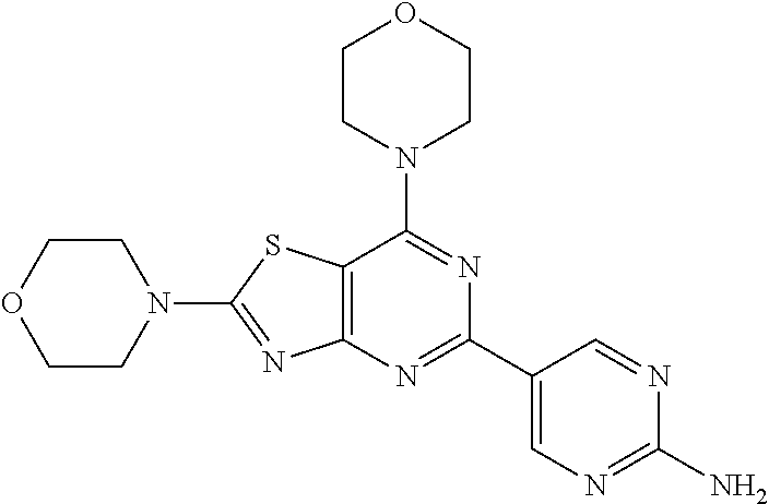 101. N-methyl-5-(2-((4- (methylsulfonyl)piperazin-1- yl)methyl)-7-morpholinothiazolo[5,4- d]pyrimidin-5-yl)pyridin-2-amine 102. 5-(2-(2-methoxypropan-2-yl)-7- morpholinothiazolo[5,4-d]pyrimidin- 5-yl)-N-methylpyridin-2-amine 103. 5-(2-(2-methoxypropan-2-yl)-7- morpholinothiazolo[5,4-d]pyrimidin- 5-yl)-N-methylpyrimidin-2-amine 104. 5-(2-(2-methoxypropan-2-yl)-7- morpholinothiazolo[5,4-d]pyrimidin- 5-yl)pyrimidin-2-amine 105. N-methyl-5-(2-(3- (methylsulfonyl)phenyl)-7- morpholinothiazolo[5,4-d]pyrimidin- 5-yl)pyridin-2-amine 106. (S)-2-hydroxy-1-(4-((7-morpholino- 5-(quinolin-3-ypthiazolo[5,4- d]pyrimidin-2-yl)methyl)piperazin-1- yl)propan-1-one 107. (S)-2-hydroxy-1-(4-((5-(2- (methylamino)pyrimidin-5-yl)-7- morpholinothiazolo[5,4-d]pyrimidin- 2-yl)methyl)piperazin-1-yl)propan-1- one 108. (S)-1-(4-((5-(2-aminopyrimidin-5- yl)-7-morpholinothiazolo[5,4- d]pyrimidin-2-yl)methyl)piperazin-1- yl)-2-hydroxypropan-1-one 109. 4-(2-(3-(methylsulfonyl)phenyl)-5- (1H-pyrrolo[2,3-b]pyridin-5- yl)thiazolo[5,4-d]pyrimidin-7- yl)morpholine 110. N,N-dimethyl-5-(2-((4- (methylsulfonyl)piperazin-1- yl)methyl)-7-morpholinothiazolo[5,4- d]pyrimidin-5-yl)pyrimidin-2-amine 111. 5-(2-((4-(methylsulfonyl)piperazin-1- yl)methyl)-7-morpholinothiazolo[5,4- d]pyrimidin-5-yl)pyridin-2-amine 112. 4-(2-((4-(methylsulfonyl)piperazin-1- yl)methyl)-5-(quinolin-3- yl)thiazolo [5,4-d]pyrimidin-7- yl)morpholine 113. N-methyl-5-(2-((4- (methylsulfonyl)piperazin-1- yl)methyl)-7-morpholinothiazolo[5,4- d]pyrimidin-5-yl)pyrimidin-2-amine 114. N-(3-(5-(2-(methylamino)pyrimidin- 5-yl)-7-morpholinothiazolo[5,4- d]pyrimidin-2- yl)benzyl)methanesulfonamide 115. N-(3-(7-morpholino-5-(1H- pyrrolo[2,3-b]pyridin-5- yl)thiazolo[5,4-d]pyrimidin-2- yl)benzyl)methanesulfonamide 116. 4-(2-((4-(methylsulfonyl)piperazin-1- yl)methyl)-5-(1H-pyrrolo[2,3- b]pyridin-5-yl)thiazolo[5,4- d]pyrimidin-7-yl)morpholine 117. 5-(2-aminopyrimidin-5-yl)-7- morpholino-N-(4- morpholinophenyl)thiazolo[5,4- d]pyrimidin-2-amine 118. 5-(2-aminopyrimidin-5-yl)-N-(4- (methylsulfonyl)phenyl)-7- morpholinothiazolo[5,4-d]pyrimidin- 2-amine 119. 5-(2-aminopyrimidin-5-yl)-7- morpholino-N-phenylthiazolo[5,4- d]pyrimidin-2-amine 120. 5-(2-(5-(methylsulfonyl)pyridin-3- yl)-7-morpholinothiazolo[5,4- d]pyrimidin-5-yl)pyrimidin-2-amine 121. N-(3-(5-(2-aminopyrimidin-5-yl)-7- morpholinothiazolo[5,4-d]pyrimidin- 2-yl)phenyl)methanesulfonamide 122. 5-(2-((4-(methylsulfonyl)piperazin-1- yl)methyl)-7-morpholinothiazolo[5,4- d]pyrimidin-5-yl)pyrimidin-2-amine 123. 5-(7-morpholino-2-(6- morpholinopyridin-3-yl)thiazolo[5,4- d]pyrimidin-5-yl)pyrimidin-2-amine 124. N-(3-(5-(2-aminopyrimidin-5-yl)-7- morpholinothiazolo[5,4-d]pyrimidin- 2-yl)phenyl)acetamide 125. N-(4-(5-(2-aminopyrimidin-5-yl)-7- morpholinothiazolo[5,4-d]pyrimidin- 2-yl)phenyl)methanesulfonamide 126. N-(3-(5-(2-aminopyrimidin-5-yl)-7- morpholinothiazolo[5,4-d]pyrimidin- 2-yl)benzyl)methanesulfonamide 127. 5-(2-(6-aminopyridin-3-yl)-7- morpholinothiazolo[5,4-d]pyrimidin- 5-yl)pyrimidin-2-amine 128. 5-(2-(4-methoxypyridin-3-yl)-7- morpholinothiazolo[5,4-d]pyrimidin- 5-yl)pyrimidin-2-amine 129. 4-(5-(1H-indazol-4-yl)-2-((4 (methylsulfonyl)piperazin-1- yl)methyl)thiazolo[5,4-d]pyrimidin- 7-yl)morpholine 130. 2-(5-(2-aminopyrimidin-5-yl)-7- morpholinothiazolo[5,4-d]pyrimidin- 2-yl)propan-2-ol 131. 5-(7-morpholinothiazolo[5,4- d]pyrimidin-5-yl)pyrimidin-2-amine 132. 5-(2-(3-(methylsulfonyl)phenyl)-7- morpholinothiazolo[5,4-d]pyrimidin- 5-yl)pyrimidin-2-amine 133. 5-(2-aminopyrimidin-5-yl)-N-(2- (methylsulfonyl)ethyl)-7- morpholinothiazolo[4,5-d]pyrimidin- 2-amine 134. 2-(4-(5-(2-aminopyrimidin-5-yl)-7- morpholinothiazolo[4,5-d]pyrimidin- 2-yl)piperazin-1-yl)ethanol 135. 5-(2-(4-(methylsulfonyl)piperazin-1- yl)-7-morpholinothiazolo[4,5- d]pyrimidin-5-yl)pyrimidin-2-amine 136. 5-(2-aminopyrimidin-5-yl)-7- morpholino-N-(2- morpholinoethypthiazolo[4,5- d]pyrimidin-2-amine 137. 2-(5-(2-aminopyrimidin-5-yl)-7- morpholinothiazolo[4,5-d]pyrimidin- 2-yl)propan-2-ol 138. 5-(7-morpholino-2-(thiazol-4- yl)thiazolo[4,5-d]pyrimidin-5- yl)pyrimidin-2-amine 139. 5-(2,7-dimorpholinothiazolo[4,5- d]pyrimidin-5-yl)pyrimidin-2-amine 140. N-(3-(5-(2-aminopyrimidin-5-yl)-7- morpholinothiazolo[4,5-d]pyrimidin- 2-yl)phenyl)acetamide 141. (5-(1H-indazol-4-yl)-7- morpholinothiazolo[4,5-d]pyrimidin- 2-yl)(4-(methylsulfonyl)piperazin-1- yl)methanone 142. 5-(2-(3-(methylsulfonyl)phenyl)-7- morpholinothiazolo[4,5-d]pyrimidin- 5-yl)pyrimidin-2-amine 143. 5-(2-(4-methoxypyridin-3-yl)-7- morpholinothiazolo[4,5-d]pyrimidin- 5-yl)pyridin-2-amine 144. 5-(6-aminopyridin-3-yl)-N-methyl-N- (1-methylpiperidin-4-yl)-7- morpholinothiazolo[4,5-d]pyrimidin- 2-amine 145. 5-(2-(4-(methylsulfonyl)piperazin-1- yl)-7-morpholinothiazolo[4,5- d]pyrimidin-5-yl)pyridin-2-amine 146. 5-(6-aminopyridin-3-yl)-7- morpholino-N-phenylthiazolo[4,5- d]pyrimidin-2-amine 147. 4-(5-(1H-indazol-4-yl)-2- (methylthio)thiazolo[4,5- d]pyrimidin-7-yl)morpholine EXAMPLES