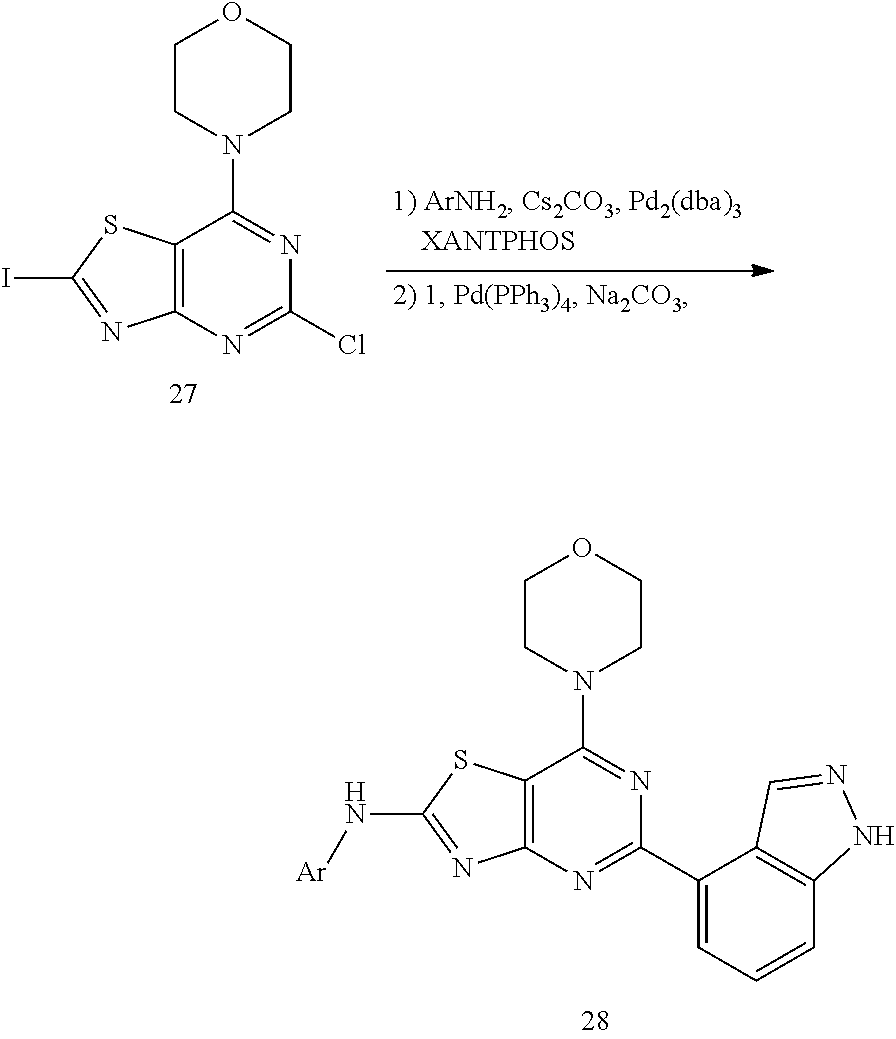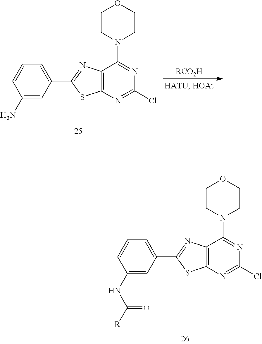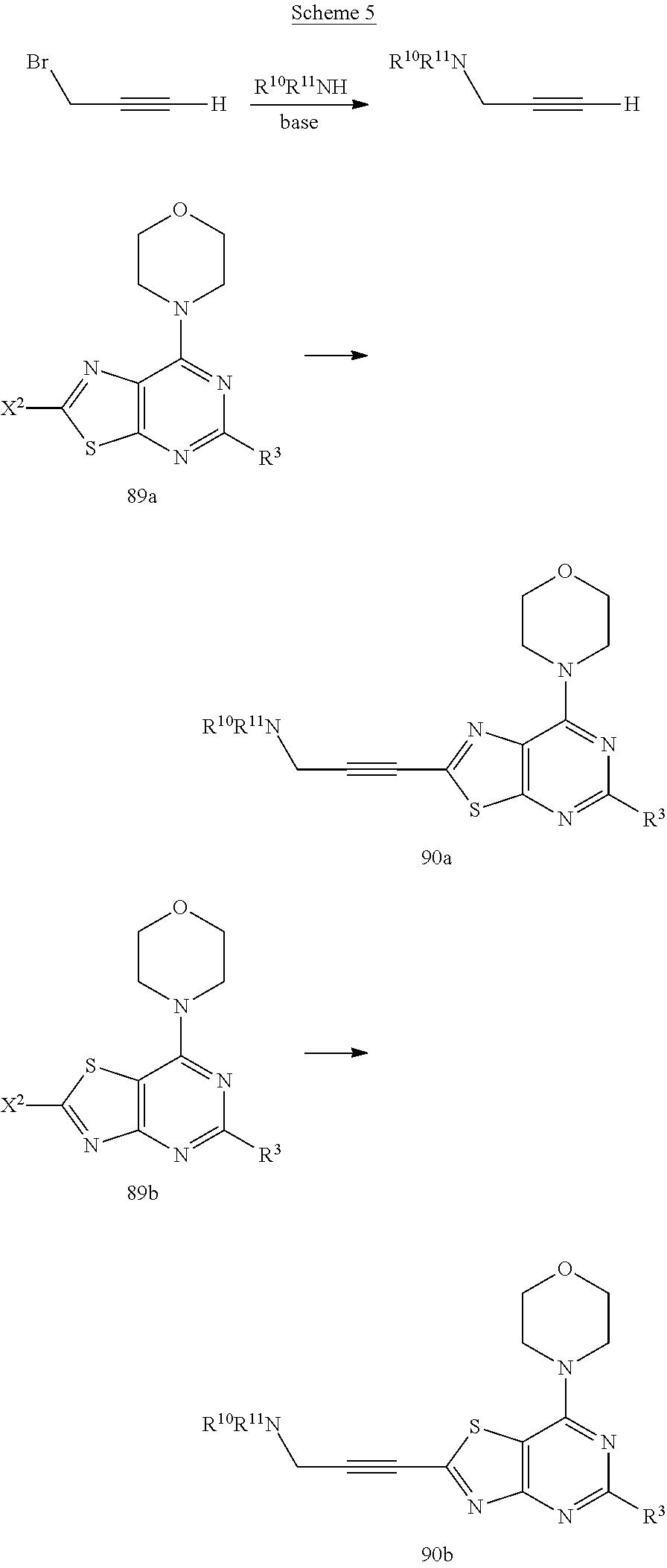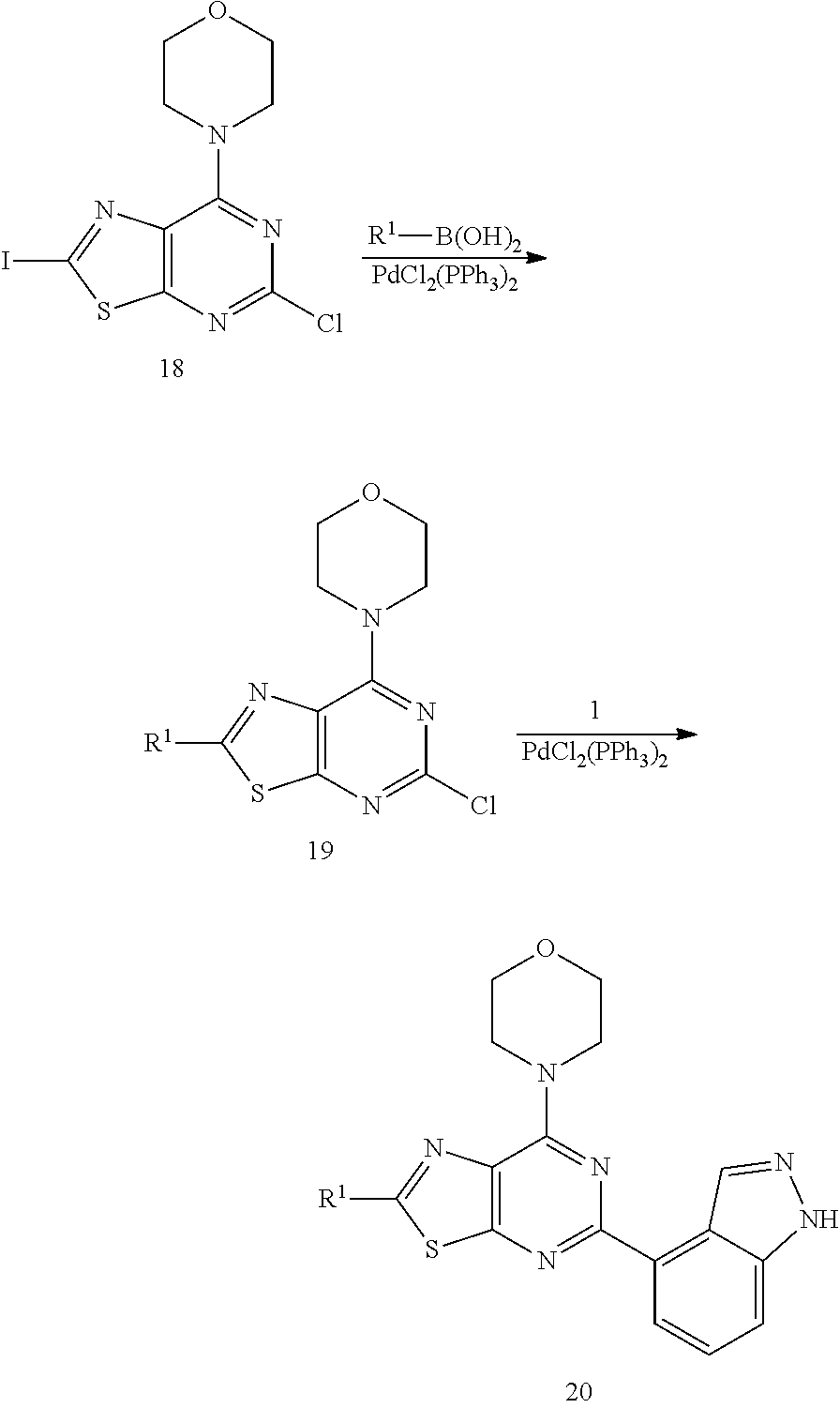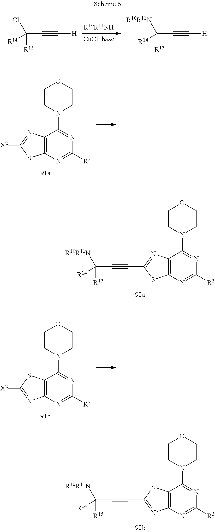 101. N-methyl-5-(2-((4- (methylsulfonyl)piperazin-1- yl)methyl)-7-morpholinothiazolo[5,4- d]pyrimidin-5-yl)pyridin-2-amine 102. 5-(2-(2-methoxypropan-2-yl)-7- morpholinothiazolo[5,4-d]pyrimidin- 5-yl)-N-methylpyridin-2-amine 103. 5-(2-(2-methoxypropan-2-yl)-7- morpholinothiazolo[5,4-d]pyrimidin- 5-yl)-N-methylpyrimidin-2-amine 104. 5-(2-(2-methoxypropan-2-yl)-7- morpholinothiazolo[5,4-d]pyrimidin- 5-yl)pyrimidin-2-amine 105. N-methyl-5-(2-(3- (methylsulfonyl)phenyl)-7- morpholinothiazolo[5,4-d]pyrimidin- 5-yl)pyridin-2-amine 106. (S)-2-hydroxy-1-(4-((7-morpholino- 5-(quinolin-3-ypthiazolo[5,4- d]pyrimidin-2-yl)methyl)piperazin-1- yl)propan-1-one 107. (S)-2-hydroxy-1-(4-((5-(2- (methylamino)pyrimidin-5-yl)-7- morpholinothiazolo[5,4-d]pyrimidin- 2-yl)methyl)piperazin-1-yl)propan-1- one 108. (S)-1-(4-((5-(2-aminopyrimidin-5- yl)-7-morpholinothiazolo[5,4- d]pyrimidin-2-yl)methyl)piperazin-1- yl)-2-hydroxypropan-1-one 109. 4-(2-(3-(methylsulfonyl)phenyl)-5- (1H-pyrrolo[2,3-b]pyridin-5- yl)thiazolo[5,4-d]pyrimidin-7- yl)morpholine 110. N,N-dimethyl-5-(2-((4- (methylsulfonyl)piperazin-1- yl)methyl)-7-morpholinothiazolo[5,4- d]pyrimidin-5-yl)pyrimidin-2-amine 111. 5-(2-((4-(methylsulfonyl)piperazin-1- yl)methyl)-7-morpholinothiazolo[5,4- d]pyrimidin-5-yl)pyridin-2-amine 112. 4-(2-((4-(methylsulfonyl)piperazin-1- yl)methyl)-5-(quinolin-3- yl)thiazolo [5,4-d]pyrimidin-7- yl)morpholine 113. N-methyl-5-(2-((4- (methylsulfonyl)piperazin-1- yl)methyl)-7-morpholinothiazolo[5,4- d]pyrimidin-5-yl)pyrimidin-2-amine 114. N-(3-(5-(2-(methylamino)pyrimidin- 5-yl)-7-morpholinothiazolo[5,4- d]pyrimidin-2- yl)benzyl)methanesulfonamide 115. N-(3-(7-morpholino-5-(1H- pyrrolo[2,3-b]pyridin-5- yl)thiazolo[5,4-d]pyrimidin-2- yl)benzyl)methanesulfonamide 116. 4-(2-((4-(methylsulfonyl)piperazin-1- yl)methyl)-5-(1H-pyrrolo[2,3- b]pyridin-5-yl)thiazolo[5,4- d]pyrimidin-7-yl)morpholine 117. 5-(2-aminopyrimidin-5-yl)-7- morpholino-N-(4- morpholinophenyl)thiazolo[5,4- d]pyrimidin-2-amine 118. 5-(2-aminopyrimidin-5-yl)-N-(4- (methylsulfonyl)phenyl)-7- morpholinothiazolo[5,4-d]pyrimidin- 2-amine 119. 5-(2-aminopyrimidin-5-yl)-7- morpholino-N-phenylthiazolo[5,4- d]pyrimidin-2-amine 120. 5-(2-(5-(methylsulfonyl)pyridin-3- yl)-7-morpholinothiazolo[5,4- d]pyrimidin-5-yl)pyrimidin-2-amine 121. N-(3-(5-(2-aminopyrimidin-5-yl)-7- morpholinothiazolo[5,4-d]pyrimidin- 2-yl)phenyl)methanesulfonamide 122. 5-(2-((4-(methylsulfonyl)piperazin-1- yl)methyl)-7-morpholinothiazolo[5,4- d]pyrimidin-5-yl)pyrimidin-2-amine 123. 5-(7-morpholino-2-(6- morpholinopyridin-3-yl)thiazolo[5,4- d]pyrimidin-5-yl)pyrimidin-2-amine 124. N-(3-(5-(2-aminopyrimidin-5-yl)-7- morpholinothiazolo[5,4-d]pyrimidin- 2-yl)phenyl)acetamide 125. N-(4-(5-(2-aminopyrimidin-5-yl)-7- morpholinothiazolo[5,4-d]pyrimidin- 2-yl)phenyl)methanesulfonamide 126. N-(3-(5-(2-aminopyrimidin-5-yl)-7- morpholinothiazolo[5,4-d]pyrimidin- 2-yl)benzyl)methanesulfonamide 127. 5-(2-(6-aminopyridin-3-yl)-7- morpholinothiazolo[5,4-d]pyrimidin- 5-yl)pyrimidin-2-amine 128. 5-(2-(4-methoxypyridin-3-yl)-7- morpholinothiazolo[5,4-d]pyrimidin- 5-yl)pyrimidin-2-amine 129. 4-(5-(1H-indazol-4-yl)-2-((4 (methylsulfonyl)piperazin-1- yl)methyl)thiazolo[5,4-d]pyrimidin- 7-yl)morpholine 130. 2-(5-(2-aminopyrimidin-5-yl)-7- morpholinothiazolo[5,4-d]pyrimidin- 2-yl)propan-2-ol 131. 5-(7-morpholinothiazolo[5,4- d]pyrimidin-5-yl)pyrimidin-2-amine 132. 5-(2-(3-(methylsulfonyl)phenyl)-7- morpholinothiazolo[5,4-d]pyrimidin- 5-yl)pyrimidin-2-amine 133. 5-(2-aminopyrimidin-5-yl)-N-(2- (methylsulfonyl)ethyl)-7- morpholinothiazolo[4,5-d]pyrimidin- 2-amine 134. 2-(4-(5-(2-aminopyrimidin-5-yl)-7- morpholinothiazolo[4,5-d]pyrimidin- 2-yl)piperazin-1-yl)ethanol 135. 5-(2-(4-(methylsulfonyl)piperazin-1- yl)-7-morpholinothiazolo[4,5- d]pyrimidin-5-yl)pyrimidin-2-amine 136. 5-(2-aminopyrimidin-5-yl)-7- morpholino-N-(2- morpholinoethypthiazolo[4,5- d]pyrimidin-2-amine 137. 2-(5-(2-aminopyrimidin-5-yl)-7- morpholinothiazolo[4,5-d]pyrimidin- 2-yl)propan-2-ol 138. 5-(7-morpholino-2-(thiazol-4- yl)thiazolo[4,5-d]pyrimidin-5- yl)pyrimidin-2-amine 139. 5-(2,7-dimorpholinothiazolo[4,5- d]pyrimidin-5-yl)pyrimidin-2-amine 140. N-(3-(5-(2-aminopyrimidin-5-yl)-7- morpholinothiazolo[4,5-d]pyrimidin- 2-yl)phenyl)acetamide 141. (5-(1H-indazol-4-yl)-7- morpholinothiazolo[4,5-d]pyrimidin- 2-yl)(4-(methylsulfonyl)piperazin-1- yl)methanone 142. 5-(2-(3-(methylsulfonyl)phenyl)-7- morpholinothiazolo[4,5-d]pyrimidin- 5-yl)pyrimidin-2-amine 143. 5-(2-(4-methoxypyridin-3-yl)-7- morpholinothiazolo[4,5-d]pyrimidin- 5-yl)pyridin-2-amine 144. 5-(6-aminopyridin-3-yl)-N-methyl-N- (1-methylpiperidin-4-yl)-7- morpholinothiazolo[4,5-d]pyrimidin- 2-amine 145. 5-(2-(4-(methylsulfonyl)piperazin-1- yl)-7-morpholinothiazolo[4,5- d]pyrimidin-5-yl)pyridin-2-amine 146. 5-(6-aminopyridin-3-yl)-7- morpholino-N-phenylthiazolo[4,5- d]pyrimidin-2-amine 147. 4-(5-(1H-indazol-4-yl)-2- (methylthio)thiazolo[4,5- d]pyrimidin-7-yl)morpholine EXAMPLES