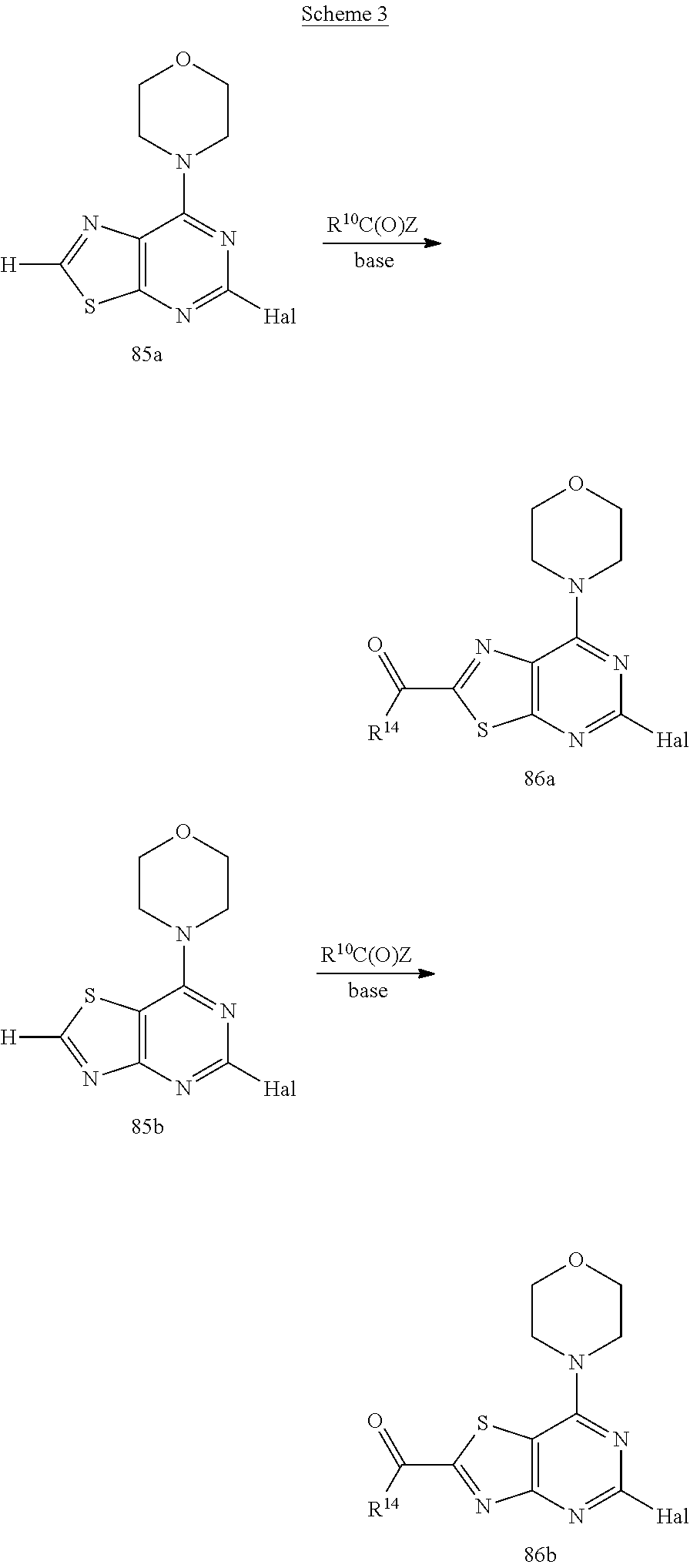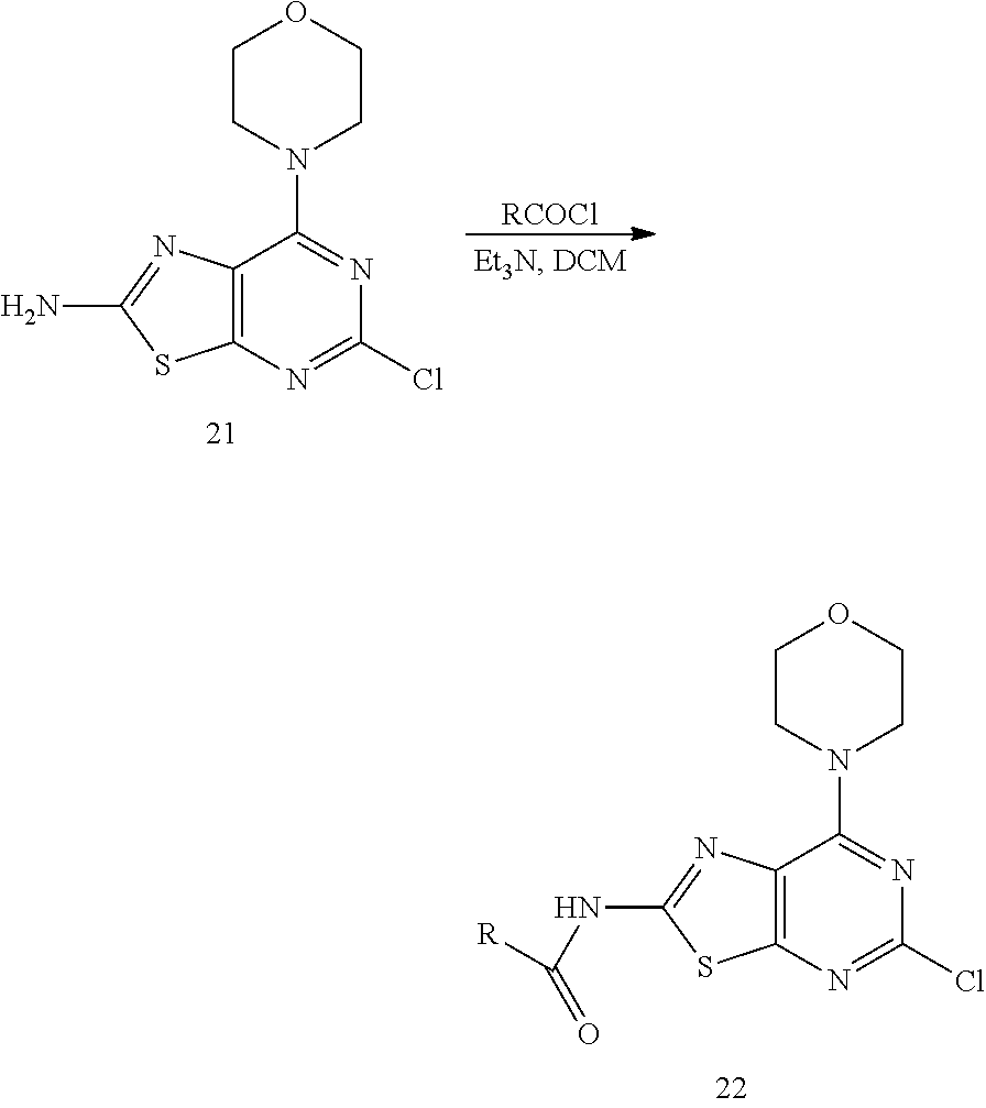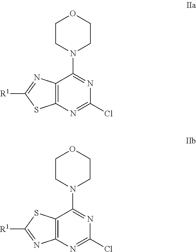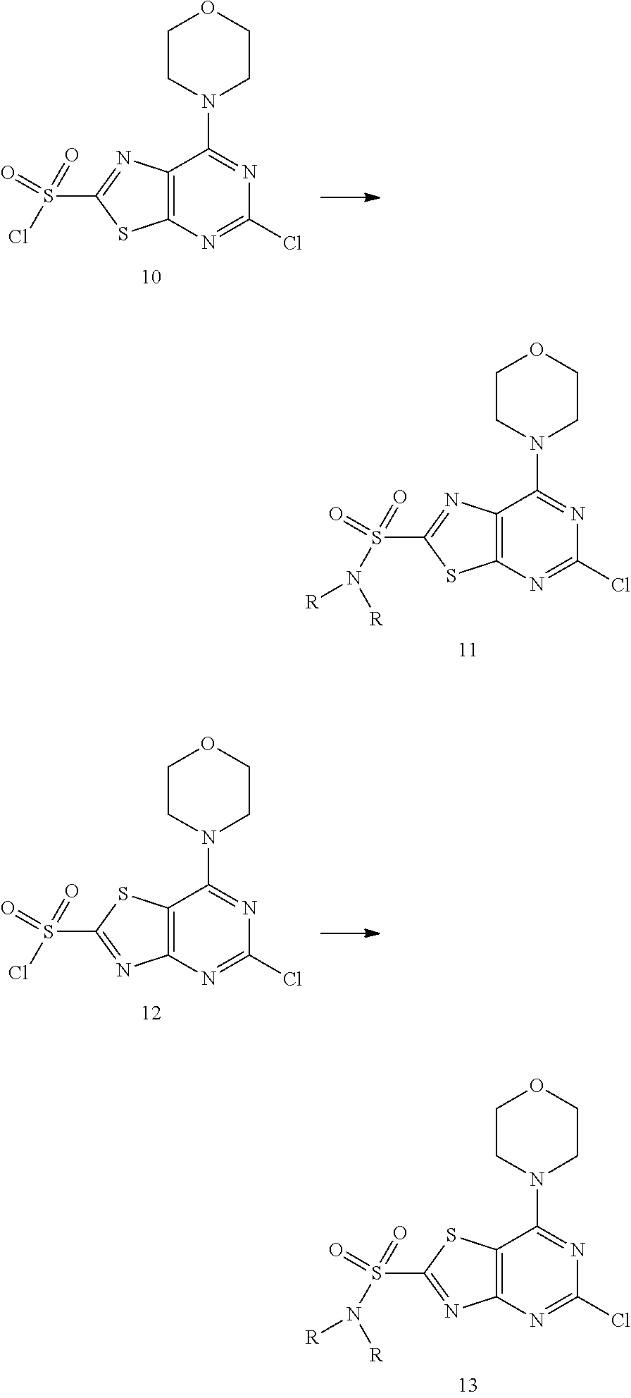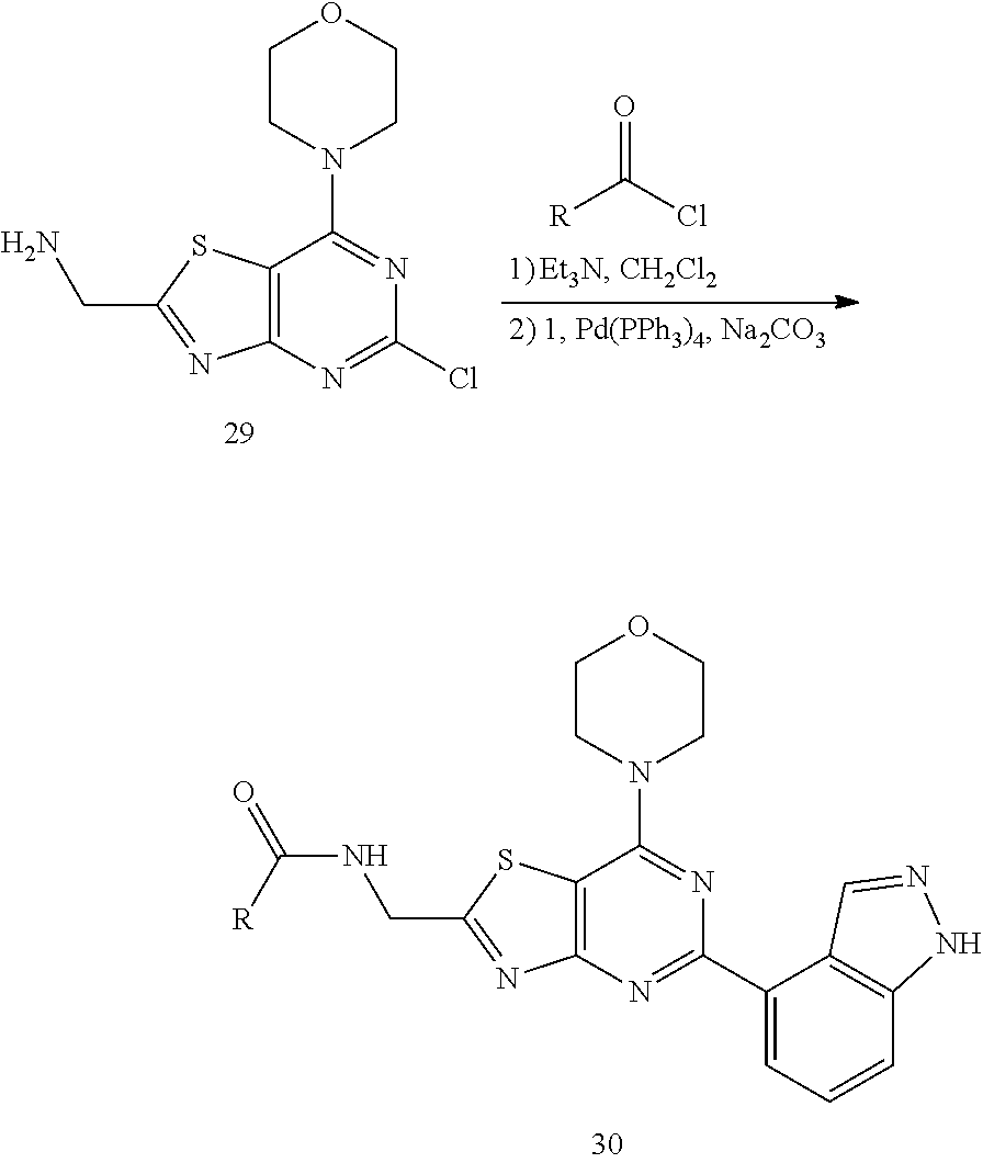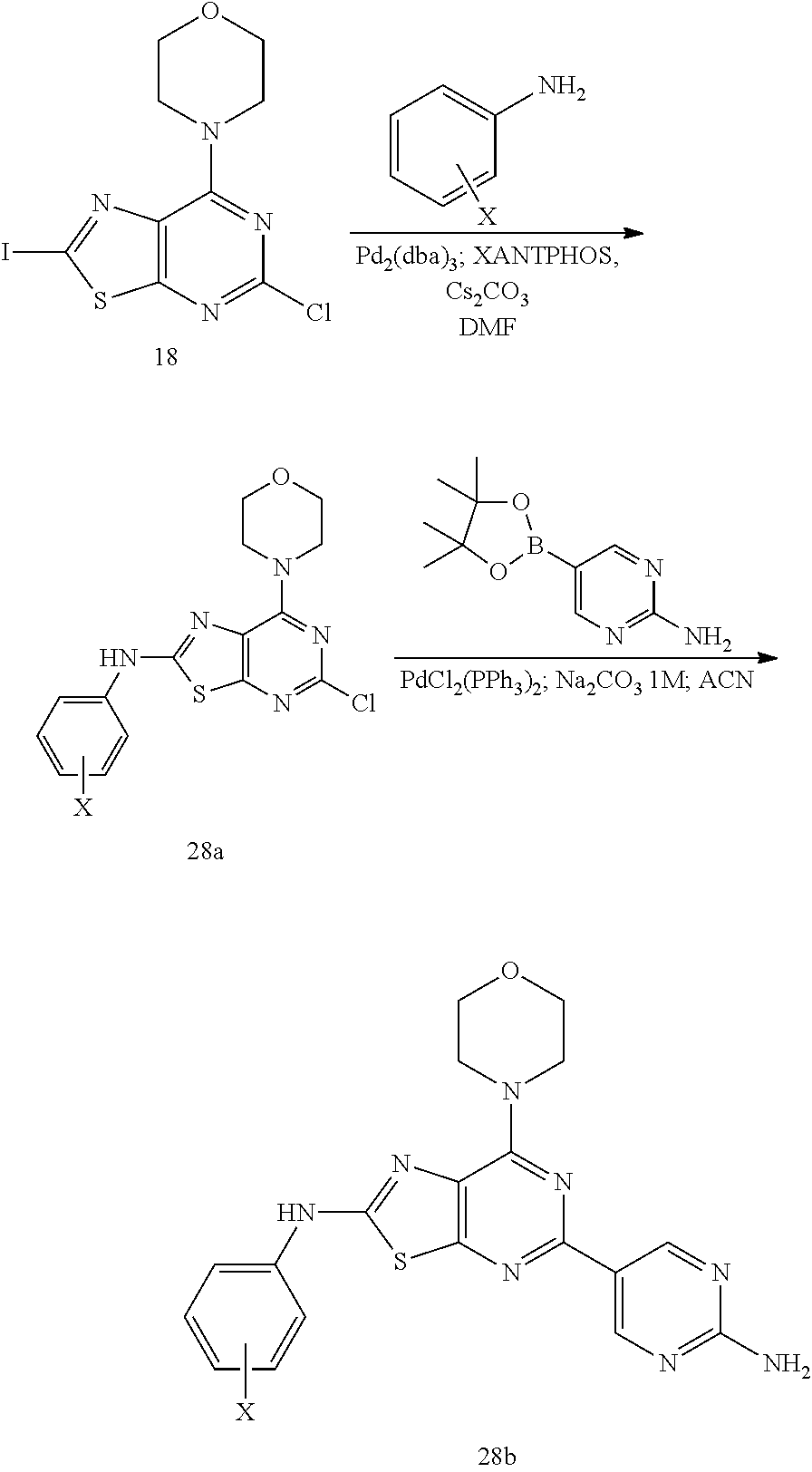 101. N-methyl-5-(2-((4- (methylsulfonyl)piperazin-1- yl)methyl)-7-morpholinothiazolo[5,4- d]pyrimidin-5-yl)pyridin-2-amine 102. 5-(2-(2-methoxypropan-2-yl)-7- morpholinothiazolo[5,4-d]pyrimidin- 5-yl)-N-methylpyridin-2-amine 103. 5-(2-(2-methoxypropan-2-yl)-7- morpholinothiazolo[5,4-d]pyrimidin- 5-yl)-N-methylpyrimidin-2-amine 104. 5-(2-(2-methoxypropan-2-yl)-7- morpholinothiazolo[5,4-d]pyrimidin- 5-yl)pyrimidin-2-amine 105. N-methyl-5-(2-(3- (methylsulfonyl)phenyl)-7- morpholinothiazolo[5,4-d]pyrimidin- 5-yl)pyridin-2-amine 106. (S)-2-hydroxy-1-(4-((7-morpholino- 5-(quinolin-3-ypthiazolo[5,4- d]pyrimidin-2-yl)methyl)piperazin-1- yl)propan-1-one 107. (S)-2-hydroxy-1-(4-((5-(2- (methylamino)pyrimidin-5-yl)-7- morpholinothiazolo[5,4-d]pyrimidin- 2-yl)methyl)piperazin-1-yl)propan-1- one 108. (S)-1-(4-((5-(2-aminopyrimidin-5- yl)-7-morpholinothiazolo[5,4- d]pyrimidin-2-yl)methyl)piperazin-1- yl)-2-hydroxypropan-1-one 109. 4-(2-(3-(methylsulfonyl)phenyl)-5- (1H-pyrrolo[2,3-b]pyridin-5- yl)thiazolo[5,4-d]pyrimidin-7- yl)morpholine 110. N,N-dimethyl-5-(2-((4- (methylsulfonyl)piperazin-1- yl)methyl)-7-morpholinothiazolo[5,4- d]pyrimidin-5-yl)pyrimidin-2-amine 111. 5-(2-((4-(methylsulfonyl)piperazin-1- yl)methyl)-7-morpholinothiazolo[5,4- d]pyrimidin-5-yl)pyridin-2-amine 112. 4-(2-((4-(methylsulfonyl)piperazin-1- yl)methyl)-5-(quinolin-3- yl)thiazolo [5,4-d]pyrimidin-7- yl)morpholine 113. N-methyl-5-(2-((4- (methylsulfonyl)piperazin-1- yl)methyl)-7-morpholinothiazolo[5,4- d]pyrimidin-5-yl)pyrimidin-2-amine 114. N-(3-(5-(2-(methylamino)pyrimidin- 5-yl)-7-morpholinothiazolo[5,4- d]pyrimidin-2- yl)benzyl)methanesulfonamide 115. N-(3-(7-morpholino-5-(1H- pyrrolo[2,3-b]pyridin-5- yl)thiazolo[5,4-d]pyrimidin-2- yl)benzyl)methanesulfonamide 116. 4-(2-((4-(methylsulfonyl)piperazin-1- yl)methyl)-5-(1H-pyrrolo[2,3- b]pyridin-5-yl)thiazolo[5,4- d]pyrimidin-7-yl)morpholine 117. 5-(2-aminopyrimidin-5-yl)-7- morpholino-N-(4- morpholinophenyl)thiazolo[5,4- d]pyrimidin-2-amine 118. 5-(2-aminopyrimidin-5-yl)-N-(4- (methylsulfonyl)phenyl)-7- morpholinothiazolo[5,4-d]pyrimidin- 2-amine 119. 5-(2-aminopyrimidin-5-yl)-7- morpholino-N-phenylthiazolo[5,4- d]pyrimidin-2-amine 120. 5-(2-(5-(methylsulfonyl)pyridin-3- yl)-7-morpholinothiazolo[5,4- d]pyrimidin-5-yl)pyrimidin-2-amine 121. N-(3-(5-(2-aminopyrimidin-5-yl)-7- morpholinothiazolo[5,4-d]pyrimidin- 2-yl)phenyl)methanesulfonamide 122. 5-(2-((4-(methylsulfonyl)piperazin-1- yl)methyl)-7-morpholinothiazolo[5,4- d]pyrimidin-5-yl)pyrimidin-2-amine 123. 5-(7-morpholino-2-(6- morpholinopyridin-3-yl)thiazolo[5,4- d]pyrimidin-5-yl)pyrimidin-2-amine 124. N-(3-(5-(2-aminopyrimidin-5-yl)-7- morpholinothiazolo[5,4-d]pyrimidin- 2-yl)phenyl)acetamide 125. N-(4-(5-(2-aminopyrimidin-5-yl)-7- morpholinothiazolo[5,4-d]pyrimidin- 2-yl)phenyl)methanesulfonamide 126. N-(3-(5-(2-aminopyrimidin-5-yl)-7- morpholinothiazolo[5,4-d]pyrimidin- 2-yl)benzyl)methanesulfonamide 127. 5-(2-(6-aminopyridin-3-yl)-7- morpholinothiazolo[5,4-d]pyrimidin- 5-yl)pyrimidin-2-amine 128. 5-(2-(4-methoxypyridin-3-yl)-7- morpholinothiazolo[5,4-d]pyrimidin- 5-yl)pyrimidin-2-amine 129. 4-(5-(1H-indazol-4-yl)-2-((4 (methylsulfonyl)piperazin-1- yl)methyl)thiazolo[5,4-d]pyrimidin- 7-yl)morpholine 130. 2-(5-(2-aminopyrimidin-5-yl)-7- morpholinothiazolo[5,4-d]pyrimidin- 2-yl)propan-2-ol 131. 5-(7-morpholinothiazolo[5,4- d]pyrimidin-5-yl)pyrimidin-2-amine 132. 5-(2-(3-(methylsulfonyl)phenyl)-7- morpholinothiazolo[5,4-d]pyrimidin- 5-yl)pyrimidin-2-amine 133. 5-(2-aminopyrimidin-5-yl)-N-(2- (methylsulfonyl)ethyl)-7- morpholinothiazolo[4,5-d]pyrimidin- 2-amine 134. 2-(4-(5-(2-aminopyrimidin-5-yl)-7- morpholinothiazolo[4,5-d]pyrimidin- 2-yl)piperazin-1-yl)ethanol 135. 5-(2-(4-(methylsulfonyl)piperazin-1- yl)-7-morpholinothiazolo[4,5- d]pyrimidin-5-yl)pyrimidin-2-amine 136. 5-(2-aminopyrimidin-5-yl)-7- morpholino-N-(2- morpholinoethypthiazolo[4,5- d]pyrimidin-2-amine 137. 2-(5-(2-aminopyrimidin-5-yl)-7- morpholinothiazolo[4,5-d]pyrimidin- 2-yl)propan-2-ol 138. 5-(7-morpholino-2-(thiazol-4- yl)thiazolo[4,5-d]pyrimidin-5- yl)pyrimidin-2-amine 139. 5-(2,7-dimorpholinothiazolo[4,5- d]pyrimidin-5-yl)pyrimidin-2-amine 140. N-(3-(5-(2-aminopyrimidin-5-yl)-7- morpholinothiazolo[4,5-d]pyrimidin- 2-yl)phenyl)acetamide 141. (5-(1H-indazol-4-yl)-7- morpholinothiazolo[4,5-d]pyrimidin- 2-yl)(4-(methylsulfonyl)piperazin-1- yl)methanone 142. 5-(2-(3-(methylsulfonyl)phenyl)-7- morpholinothiazolo[4,5-d]pyrimidin- 5-yl)pyrimidin-2-amine 143. 5-(2-(4-methoxypyridin-3-yl)-7- morpholinothiazolo[4,5-d]pyrimidin- 5-yl)pyridin-2-amine 144. 5-(6-aminopyridin-3-yl)-N-methyl-N- (1-methylpiperidin-4-yl)-7- morpholinothiazolo[4,5-d]pyrimidin- 2-amine 145. 5-(2-(4-(methylsulfonyl)piperazin-1- yl)-7-morpholinothiazolo[4,5- d]pyrimidin-5-yl)pyridin-2-amine 146. 5-(6-aminopyridin-3-yl)-7- morpholino-N-phenylthiazolo[4,5- d]pyrimidin-2-amine 147. 4-(5-(1H-indazol-4-yl)-2- (methylthio)thiazolo[4,5- d]pyrimidin-7-yl)morpholine EXAMPLES