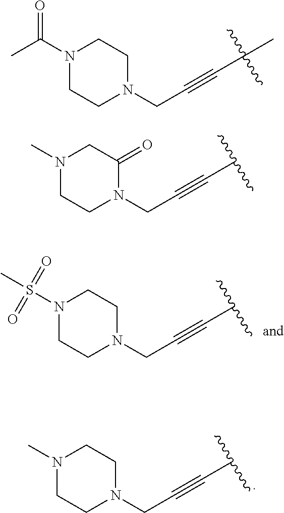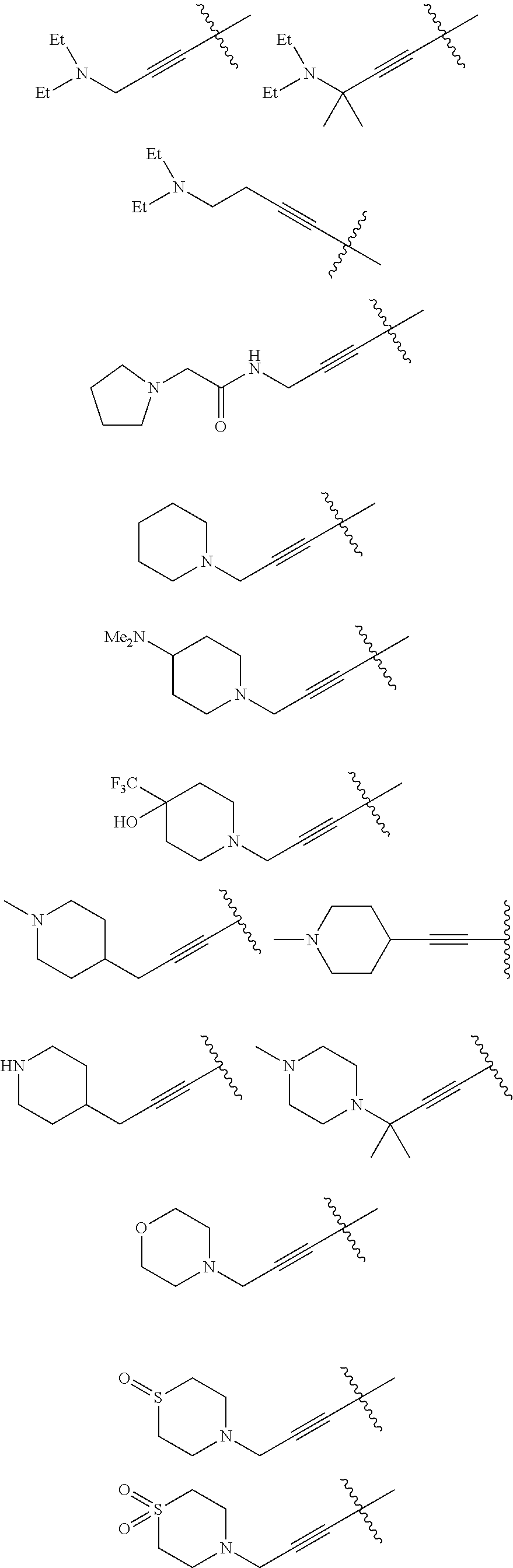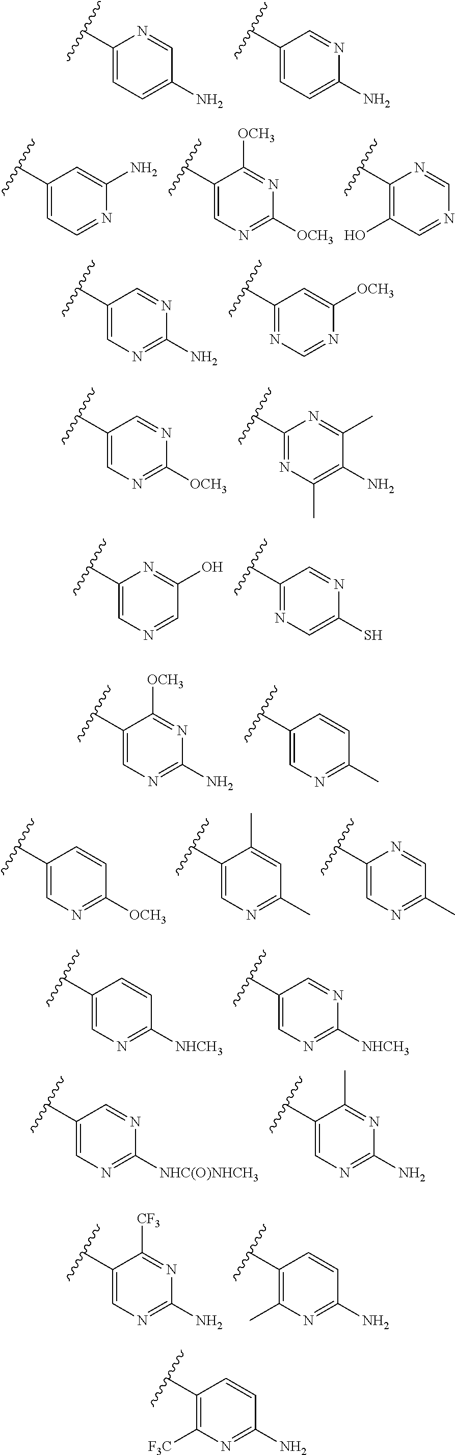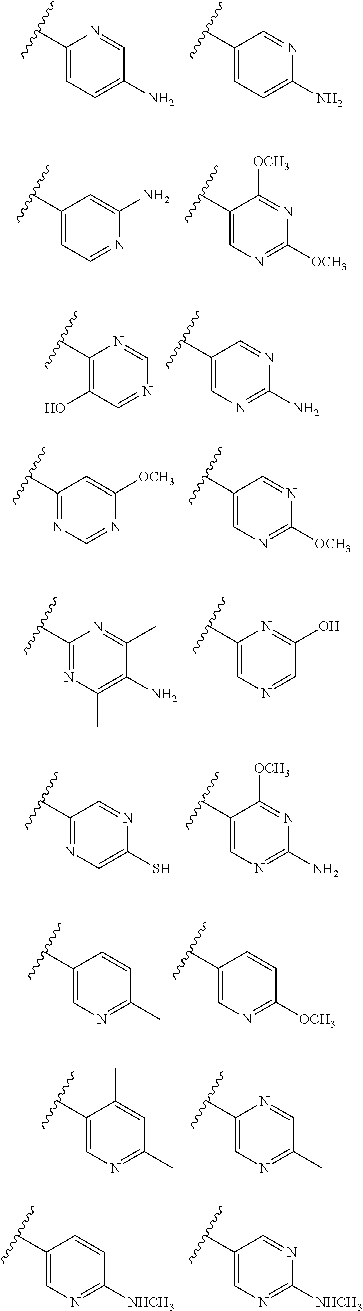 Alternatively, cells are seeded at optimal density in a 96 well plate and incubated for 4 days in the presence of test compound. Alamar Blue™ was subsequently added to the assay medium, and cells were incubated for 6 h before reading at 544 nm excitation, 590 nm emission. EC50 values were calculated using a sigmoidal dose response curve fit. Caco-2 cells are seeded onto Millipore Multiscreen plates at 1×105 cells/cm2, and cultured for 20 days. Assessment of compound permeability is subsequently conducted. The compounds are applied to the apical surface (A) of cell monolayers and compound permeation into the basolateral (B) compartment was measured. This is performed in the reverse direction (B-A) to investigate active transport. A permeability coefficient value, Papp, for each compound, a measure of the rate of permeation of the compound across the membrane, is calculated. Compounds are grouped into low (Papp<1=1.0×106cm/s) or high (Papp>/=1.0×106cm/s) absorption potential based on comparison with control compounds with established human absorption. Suspensions of cryopreserved human hepatocytes are used. Incubations are performed at compound concentration of 1 mM or 3 μM at a cell density of 0.5×106 viable cells/mL. The final DMSO concentration in the incubation is about 0.25%. Control incubations are also performed in the absence of cells to reveal any non-enzymatic degradation. Duplicate samples (50 μL) are removed from the incubation mixture at 0, 5, 10, 20, 40 and 60 minutes (control sample at 60 minutes only) and added to methanol-containing internal standard (100 μL) to terminate the reaction. Tolbutamide, 7-hydroxycoumarin, and testosterone may be used as control compounds. Samples are centrifuged and the supernatants at each time point pooled for analysis by LC-MSMS. From a plot of ln peak area ratio (parent compound peak area/internal standard peak area) against time, intrinsic clearance (CLint) is calculated as follows: CLint(μl/min/million cells)=V×k, where k is the elimination rate constant, obtained from the gradient of ln concentration plotted against time; V is a volume term derived from the incubation volume and is expressed as μL 106 cells−1. Compounds of the invention may be screened against CYP450 targets (e.g. 1A2, 2C9, 2C19, 2D6, 3A4) at 10 concentrations in duplicate, with a top concentration of 100 uM being used. Standard inhibitors (furafylline, sulfaphenazole, tranylcypromine, quinidine, ketoconazole) are used as controls. Plates are read using a BMG LabTechnologies PolarStar in fluorescence mode. Freshly isolated human hepatocytes from a single donor may be cultured for 48 h prior to addition of test compound at three concentrations and incubated for 72 h. Probe substrates for CYP3A4 and CYP1A2 are added for 30 minutes and 1 h before the end of the incubation. At 72 h, cells and media are removed and the extent of metabolism of each probe substrate quantified by LC-MS/MS. The experiment is controlled by using inducers of the individual P450s incubated at one concentration in triplicate to determine the extent of induction of cytochrome P450 enzymes. Solutions of test compound (5 um, 0.5% final DMSO concentration) are prepared in buffer and 10% plasma (v/v in buffer). A 96 well HT dialysis plate is assembled so that each well is divided in two by a semi-permeable cellulose membrane. The buffer solution is added to one side of the membrane and the plasma solution to the other side; incubations are then conducted at 37° C. over 2 h in triplicate. The cells are subsequently emptied, and the solutions for each batch of compounds are combined into two groups (plasma-free and plasma-containing) then analyzed by LC-MSMS using two sets of calibration standards for plasma-free (6 points) and plasma-containing solutions (7 points). The fraction unbound value for the compounds of Table 1 is calculated as: highly protein bound compounds (>1=90% bound) had an Fu<=0.1. The compounds of Tables 1 may be evaluated for modulation of rubidium efflux from HEK-294 cells stably expressing hERG potassium channels using established flux methodology. Cells are prepared in medium containing RbCl and plated into 96-well plates and grown overnight to form monolayers. The efflux experiment is initiated by aspirating the media and washing each well with 3×100 pt of pre-incubation buffer (containing low [K+]) at room temperature. Following the final aspiration, 50 μL of working stock (2×) compound is added to each well and incubated at room temperature for 10 minutes. 50 μL of stimulation buffer (containing high [K+]) is then added to each well giving the final test compound concentrations. Cell plates are then incubated at room temperature for a further 10 minutes and 80 μL of supernatant from each well is then transferred to equivalent wells of a 96-well plate and analyzed via atomic emission spectroscopy. The compound is screened as 10 pt duplicate IC50 curves, n=2, from a top concentration of 100 μM. The foregoing description is considered as illustrative only of the principles of the invention. Further, since numerous modifications and changes will be readily apparent to those skilled in the art, it is not desired to limit the invention to the exact construction and process shown as described above. Accordingly, all suitable modifications and equivalents may be considered to fall within the scope of the invention as defined by the claims that follow. The words “comprise,” “comprising,” “include,” “including,” and “includes” when used in this specification and in the following claims are intended to specify the presence of stated features, integers, components, or steps, but they do not preclude the presence or addition of one or more other features, integers, components, steps, or groups thereof.CROSS REFERENCE TO RELATED APPLICATIONS