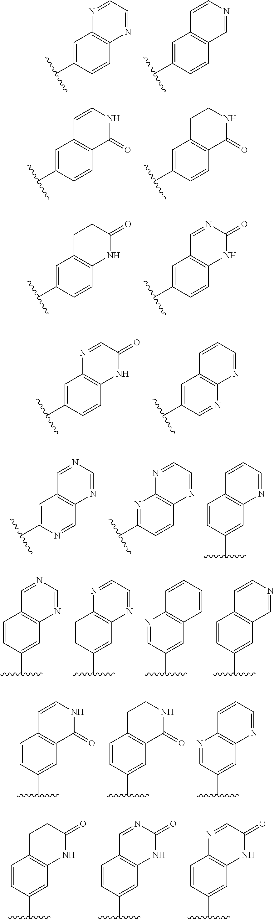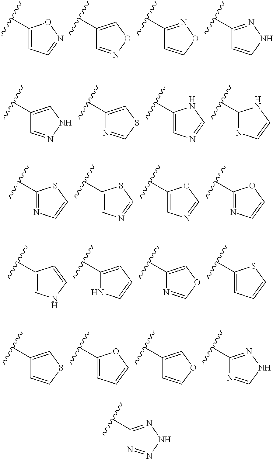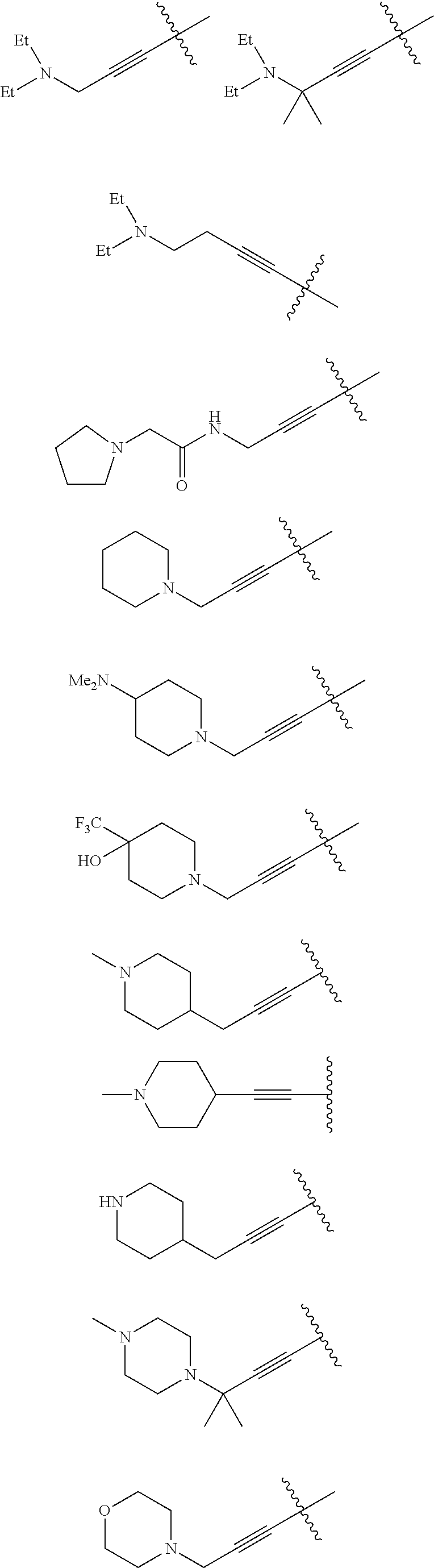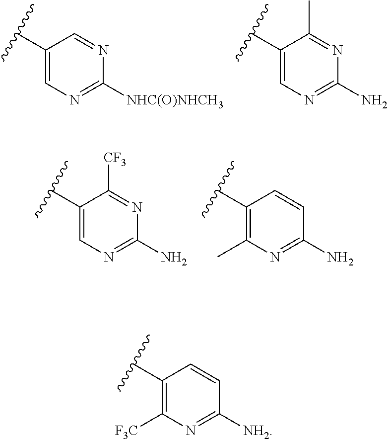 Alternatively, cells are seeded at optimal density in a 96 well plate and incubated for 4 days in the presence of test compound. Alamar Blue™ was subsequently added to the assay medium, and cells were incubated for 6 h before reading at 544 nm excitation, 590 nm emission. EC50 values were calculated using a sigmoidal dose response curve fit. Caco-2 cells are seeded onto Millipore Multiscreen plates at 1×105 cells/cm2, and cultured for 20 days. Assessment of compound permeability is subsequently conducted. The compounds are applied to the apical surface (A) of cell monolayers and compound permeation into the basolateral (B) compartment was measured. This is performed in the reverse direction (B-A) to investigate active transport. A permeability coefficient value, Papp, for each compound, a measure of the rate of permeation of the compound across the membrane, is calculated. Compounds are grouped into low (Papp<1=1.0×106cm/s) or high (Papp>/=1.0×106cm/s) absorption potential based on comparison with control compounds with established human absorption. Suspensions of cryopreserved human hepatocytes are used. Incubations are performed at compound concentration of 1 mM or 3 μM at a cell density of 0.5×106 viable cells/mL. The final DMSO concentration in the incubation is about 0.25%. Control incubations are also performed in the absence of cells to reveal any non-enzymatic degradation. Duplicate samples (50 μL) are removed from the incubation mixture at 0, 5, 10, 20, 40 and 60 minutes (control sample at 60 minutes only) and added to methanol-containing internal standard (100 μL) to terminate the reaction. Tolbutamide, 7-hydroxycoumarin, and testosterone may be used as control compounds. Samples are centrifuged and the supernatants at each time point pooled for analysis by LC-MSMS. From a plot of ln peak area ratio (parent compound peak area/internal standard peak area) against time, intrinsic clearance (CLint) is calculated as follows: CLint(μl/min/million cells)=V×k, where k is the elimination rate constant, obtained from the gradient of ln concentration plotted against time; V is a volume term derived from the incubation volume and is expressed as μL 106 cells−1. Compounds of the invention may be screened against CYP450 targets (e.g. 1A2, 2C9, 2C19, 2D6, 3A4) at 10 concentrations in duplicate, with a top concentration of 100 uM being used. Standard inhibitors (furafylline, sulfaphenazole, tranylcypromine, quinidine, ketoconazole) are used as controls. Plates are read using a BMG LabTechnologies PolarStar in fluorescence mode. Freshly isolated human hepatocytes from a single donor may be cultured for 48 h prior to addition of test compound at three concentrations and incubated for 72 h. Probe substrates for CYP3A4 and CYP1A2 are added for 30 minutes and 1 h before the end of the incubation. At 72 h, cells and media are removed and the extent of metabolism of each probe substrate quantified by LC-MS/MS. The experiment is controlled by using inducers of the individual P450s incubated at one concentration in triplicate to determine the extent of induction of cytochrome P450 enzymes. Solutions of test compound (5 um, 0.5% final DMSO concentration) are prepared in buffer and 10% plasma (v/v in buffer). A 96 well HT dialysis plate is assembled so that each well is divided in two by a semi-permeable cellulose membrane. The buffer solution is added to one side of the membrane and the plasma solution to the other side; incubations are then conducted at 37° C. over 2 h in triplicate. The cells are subsequently emptied, and the solutions for each batch of compounds are combined into two groups (plasma-free and plasma-containing) then analyzed by LC-MSMS using two sets of calibration standards for plasma-free (6 points) and plasma-containing solutions (7 points). The fraction unbound value for the compounds of Table 1 is calculated as: highly protein bound compounds (>1=90% bound) had an Fu<=0.1. The compounds of Tables 1 may be evaluated for modulation of rubidium efflux from HEK-294 cells stably expressing hERG potassium channels using established flux methodology. Cells are prepared in medium containing RbCl and plated into 96-well plates and grown overnight to form monolayers. The efflux experiment is initiated by aspirating the media and washing each well with 3×100 pt of pre-incubation buffer (containing low [K+]) at room temperature. Following the final aspiration, 50 μL of working stock (2×) compound is added to each well and incubated at room temperature for 10 minutes. 50 μL of stimulation buffer (containing high [K+]) is then added to each well giving the final test compound concentrations. Cell plates are then incubated at room temperature for a further 10 minutes and 80 μL of supernatant from each well is then transferred to equivalent wells of a 96-well plate and analyzed via atomic emission spectroscopy. The compound is screened as 10 pt duplicate IC50 curves, n=2, from a top concentration of 100 μM. The foregoing description is considered as illustrative only of the principles of the invention. Further, since numerous modifications and changes will be readily apparent to those skilled in the art, it is not desired to limit the invention to the exact construction and process shown as described above. Accordingly, all suitable modifications and equivalents may be considered to fall within the scope of the invention as defined by the claims that follow. The words “comprise,” “comprising,” “include,” “including,” and “includes” when used in this specification and in the following claims are intended to specify the presence of stated features, integers, components, or steps, but they do not preclude the presence or addition of one or more other features, integers, components, steps, or groups thereof.CROSS REFERENCE TO RELATED APPLICATIONS