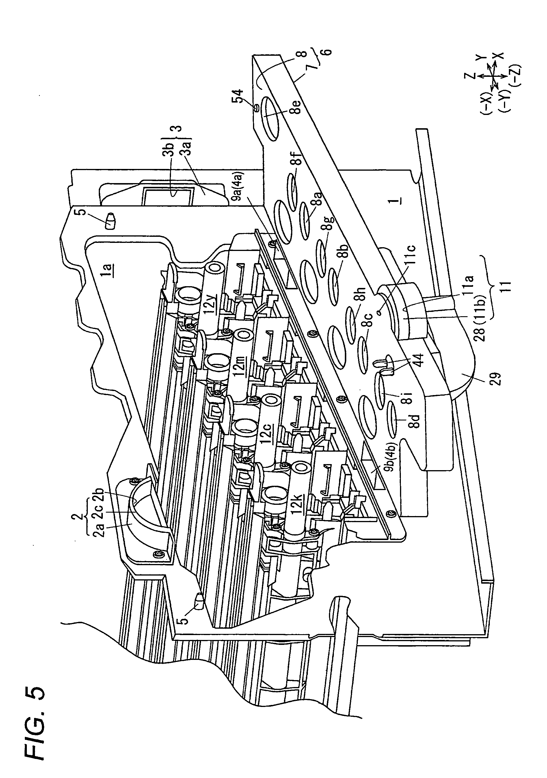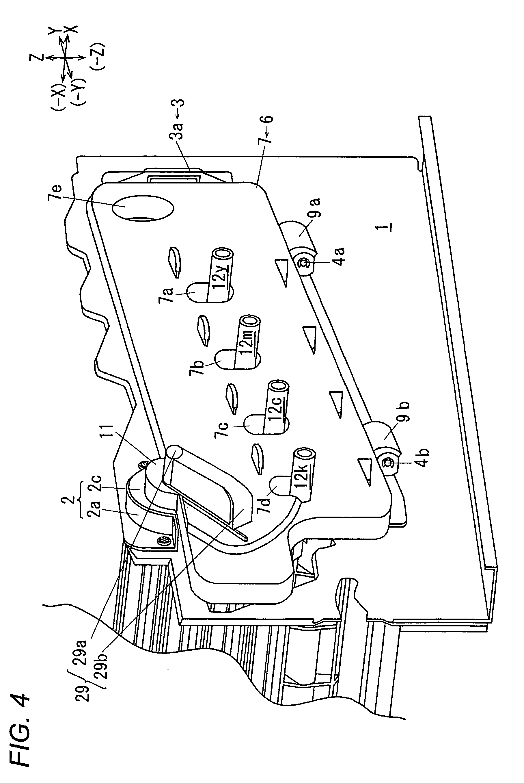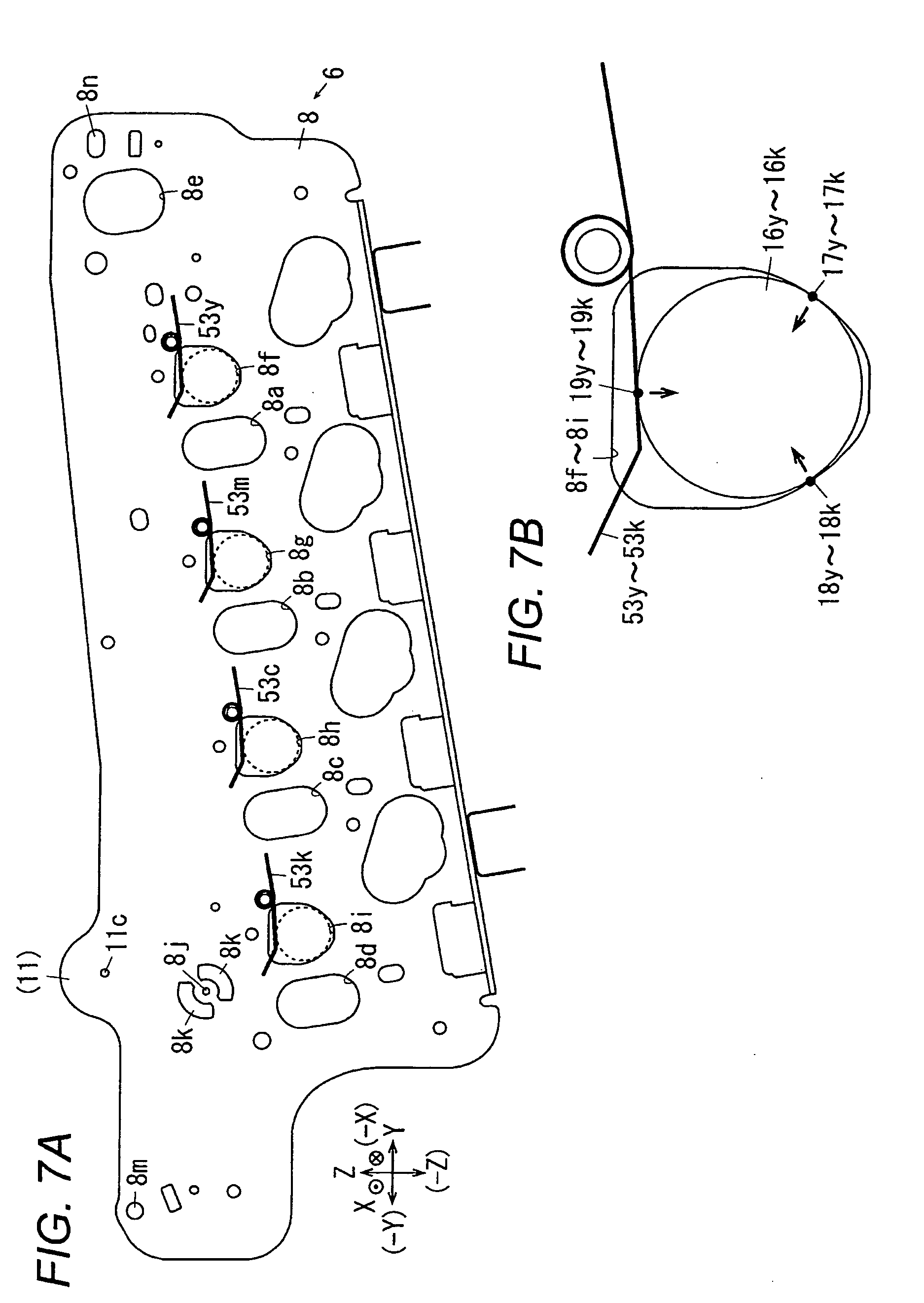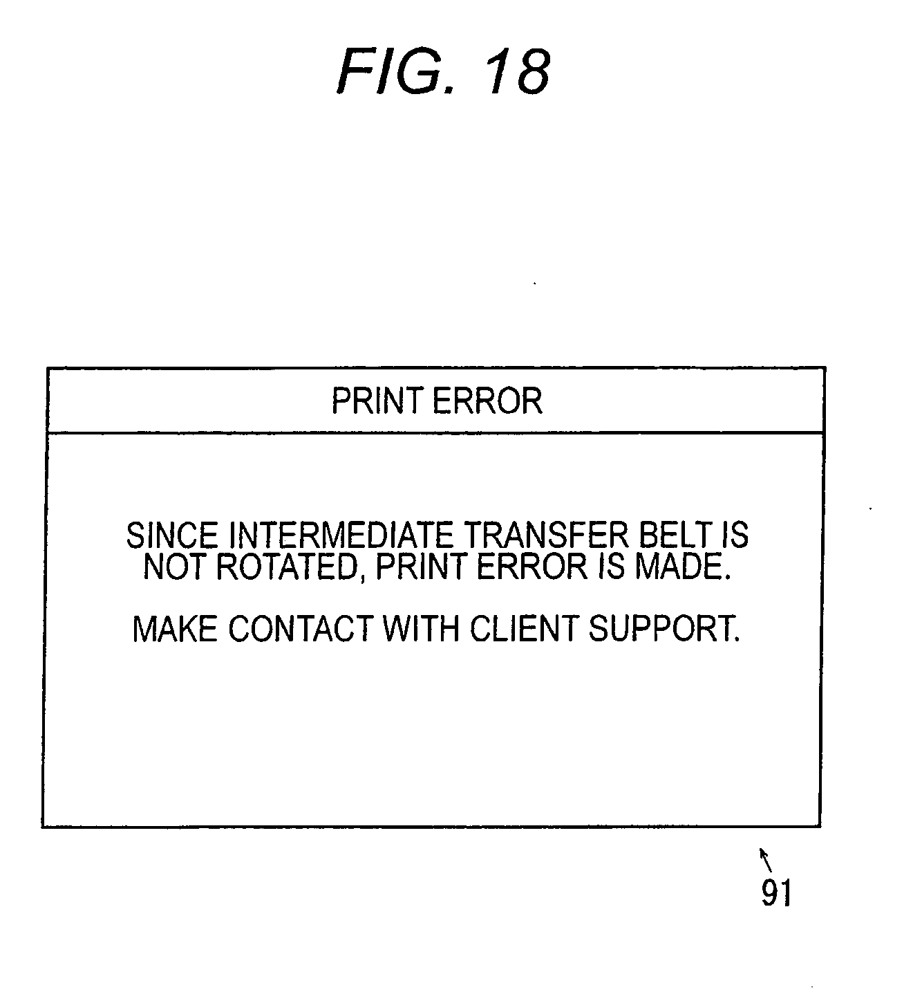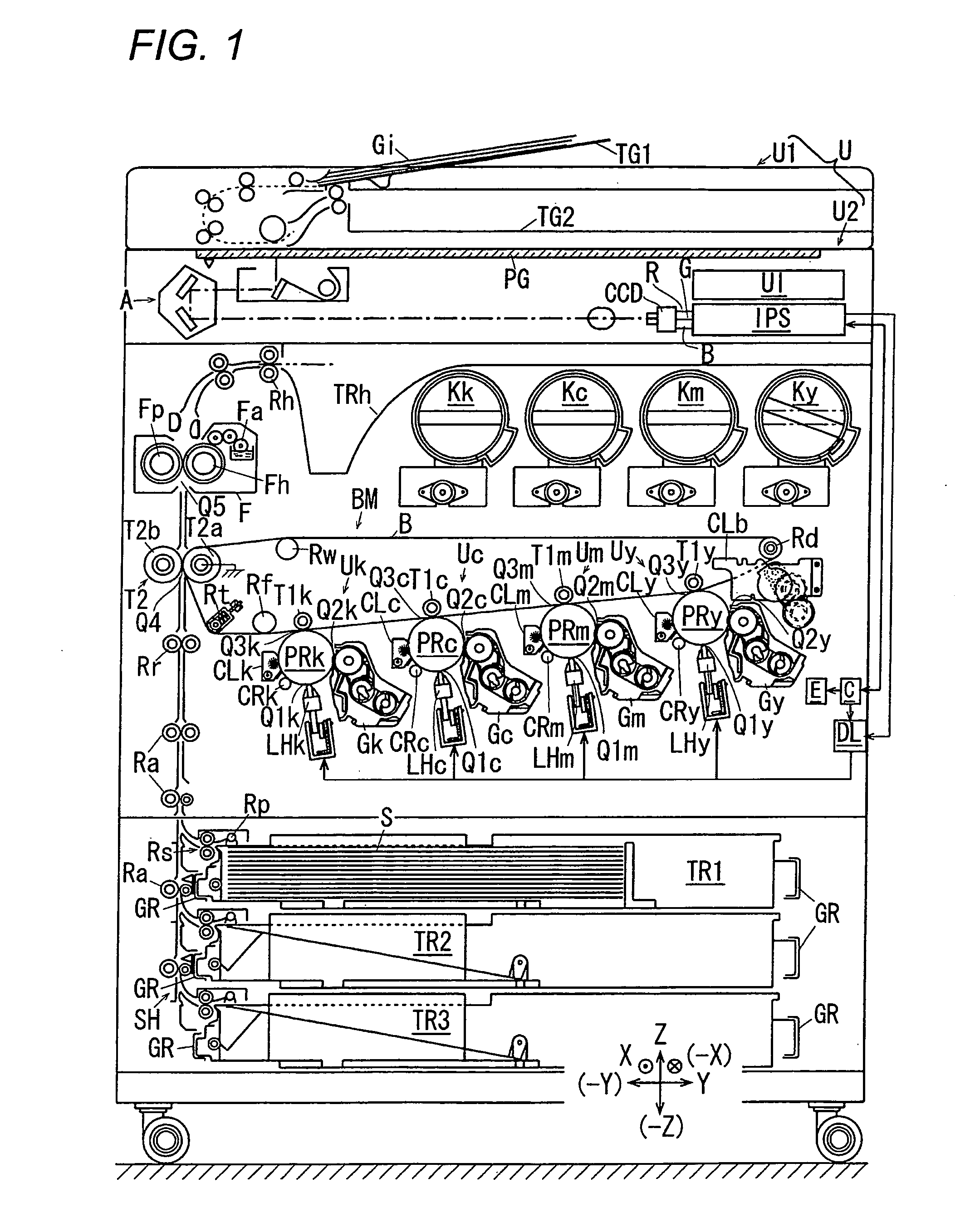 Exemplary embodiments of the invention will be described in detail based on the following figures, wherein: Next, examples to be specific examples according to an exemplary embodiment of the invention will be described with reference to the drawings, and the invention is not restricted to the following examples. For easy understanding of the following description, in the drawings, a longitudinal direction is set to be an X-axis direction, a transverse direction is set to be a Y-axis direction, a vertical direction is set to be a Z-axis direction, and directions or sides indicated as arrows X, −X, Y, −Y, Z and −Z are set to be forward, rearward, rightward, leftward, upward and downward directions or front, rear, right, left, upper and lower sides, respectively. In the drawings, moreover, it is assumed that a circle having “•” described therein implies an arrow turned from a back side of a paper toward a right side thereof, and a circle having “X” described therein implies an arrow turned from the right side of the paper to the back side thereof. In the following description using the drawings, an illustration of members other than necessary members for explanation will be properly omitted for easy understanding. In The automatic document feeder device U1 has a document feeding portion TG1 in which plural of documents Gi to be copied is stacked and accommodated, and a document discharging portion TG2 for discharging the document Gi fed from the document feeding portion TG1 and passing through a document reading position on the document reading surface PG. The device body U2 has a user interface UI according to an example of an input operating portion for inputting a working command signal for starting an image forming operation by a user, and an exposing optical system A. A light reflected by the document delivered over the document reading surface PG by the automatic document feeder device U1 or a document put on the document reading surface PG manually is converted into electric signals of red: R, green: G and blue: B by a solid state imaging device CCD through the exposing optical system A. An information converting portion IPS converts the electric signals of the R, G, and B input from the solid state imaging device CCD into image information about black: K, yellow: Y, magenta: M, and cyan: C and temporarily stores them, and outputs the image information as image information for forming a latent image at a preset time to a latent image forming circuit DL. In the case in which a document image is a monochromatic image, the image information about only the black: K is input to the latent image forming circuit DL. The latent image forming circuit DL has driving circuits for the respective colors of Y, M, C and K which are not shown, and outputs signals corresponding to the input image information to latent image forming devices LHy, LHm, LHc and LHk disposed for the respective colors at a preset time. Visible image forming devices Uy, Urn, Uc and Uk disposed in a central part in a direction of a gravity of the copying machine U serve to form visible images for the colors of Y, M, C and K, respectively. Latent image writing lights for Y, M, C and K emitted from light sources of the latent image forming devices LHy, LHm, LHc and LIR are incident on photosensitive members PRy, PRm, PRc and PRk according to an example of a second positioned member and an example of an image holding member, respectively. In the first example, the latent image forming devices LHy to LHk are constituted by devices in which LEDs: Light Emission Diodes to be writing elements are arranged and disposed in a straight line, that is, an LED array. The visible image forming device Uy for the Y color has the photosensitive member PRy to be rotated, a charger CRy, the latent image forming device LHy, a developing device Gy, a primary transfer unit T1 All of the visible image forming devices Um, Uc and Uk are constituted in the same manner as the visible image forming device Uy for the Y color. In The toner images thus developed are transported to primary transfer regions Q3 The toner images on the photosensitive members PRy to PRk are primarily transferred onto the intermediate transfer belt B according to an example of the intermediate transfer member through the primary transfer units T1 A belt module BM according to an example of an intermediate transfer device is disposed above the photosensitive members PRy to PRk. The belt module BM has the intermediate transfer belt B, a belt driving roll Rd according to an example of an intermediate transfer member driving member, a tension roll Rt according to an example of a tension applying member, a walking roll Rw according to an example of a meander preventing member, an idler roll Rf according to an example of a driven member, a backup roll T2 Moreover, the rotation detecting member SN1 is disposed in the belt module BM. The rotation detecting member SN1 serves to detect a rotation of the intermediate transfer belt B. The rotation detecting member SN1 according to the first example detects a detected portion (not shown) disposed on one of ends of the intermediate transfer belt B within a preset rotating time, thereby detecting the rotation of the intermediate transfer belt B. In the first example, a time required for the intermediate transfer belt B to take a rotation is set to be the rotating time. Moreover, a secondary transfer roll T2 Monochromatic or multicolored toner images superimposed and transferred sequentially onto the intermediate transfer belt B by the primary transfer units T1 A transfer device (T1+T2+B) according to the first example is constituted by the primary transfer units T1 A pair of left and right guide rails GR according to an example of a guiding member is provided in three stages below the visible image forming devices Uy to Uk, and paper supplying trays TR1 to TR3 according to an example of a paper supplying portion are supported t