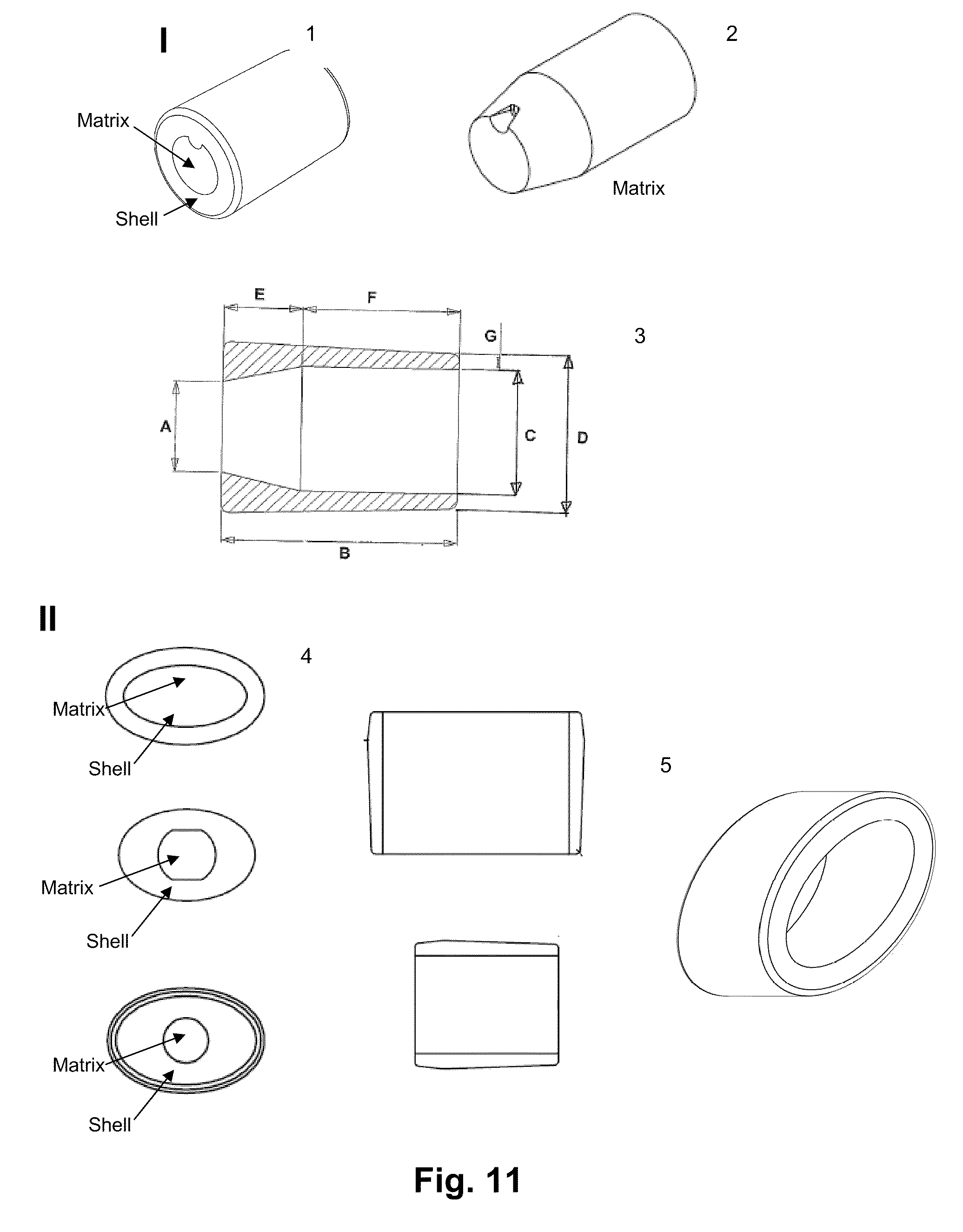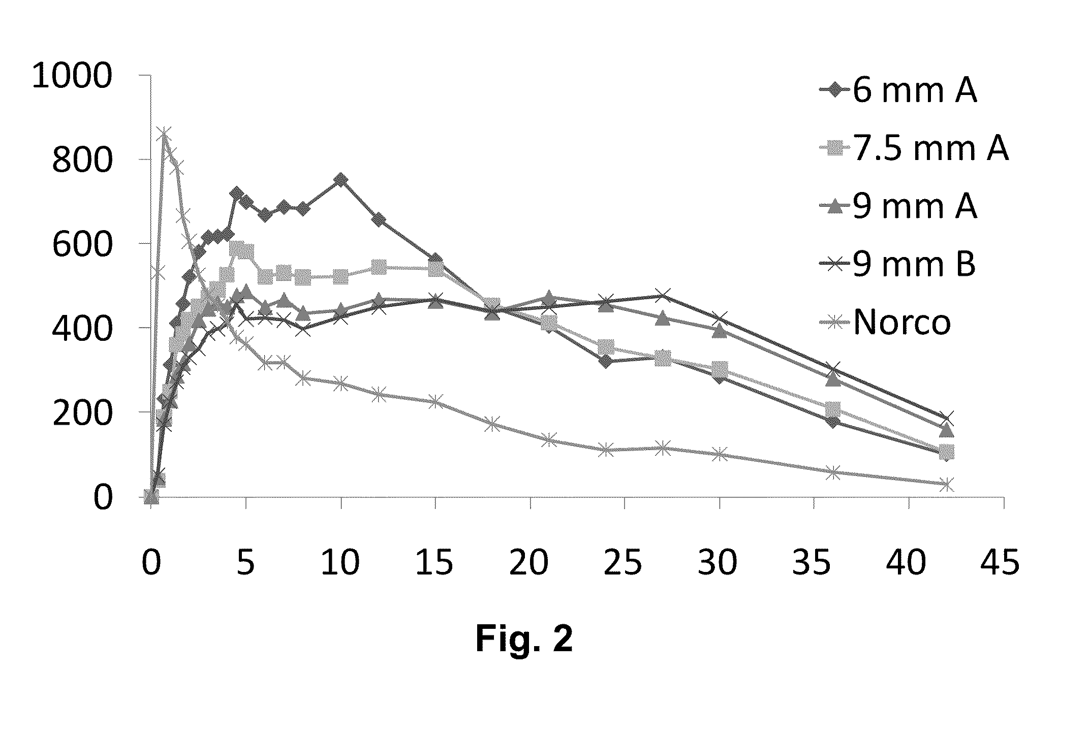Matrix Oxycodone hydrochloride Active ingredient 40.0 26.8 Polyethylene oxide 200,000 Carrier 38.4 25.7 Polyethylene oxide 300,000 Carrier 29.9 20.0 Poloxamer 188 Co-carrier, 14.9 10.0 Plasticizer Poloxamer 407 Co-carrier, 20.9 14.0 Plasticizer Butylhydroxytoluene Antioxidant, 0.07 0.5 Stabilizer Eudragit L100-55 Carrier, Stabilizer 4.48 3.0 Total, matrix 148.7 100.0 Shell (coating) Ethylcellulose Coat material 84.2 87.0 Cetostearyl alcohol Plasticizer 10.1 12.0 Titanium dioxide Colorant 0.97 1.0 Total, shell (coating) 96.8 100.0 Total 245.4 6 mm length (batch no. 08-0088-114) 405 min (94%) 7.5 mm length (batch no. 08-0089-114) 510 min (88%) 9 mm length (batch no. 08-0090-114) 600 min (88%) Amount per tablet (% w/w) Function Components Form. A Form. B — Matrix 100 100 Morphine sulfate 16.0 51.5 Active ingredient pentahydrate Polyethylene 71.4 — Carrier, release oxide 200 000 modifier Polyethylene 32.0 Carrier, release oxide 300 000 modifier Poloxamer 188 13.4 Co-carrier, Plasticizer Mannitol 10.0 3.0 Release modifier and stabilizer Butylated 0.1 Antioxidant, Stabilizer hydroxytoluene (BHT) Vitamin E 2.6 — Stabilizer Polyethylene Glycol Succinate (TPGS) Shell (coating) 100 100 Ethylcellulose 87.0 87.0 Coat material Cetostearyl 12.0 12.0 Plasticizer alcohol Titanium dioxide 1.0 1.0 Coloring agent, UV stabiliser Round 08-0141-066 9 150 16.67 30 Ellipse 08-0140-066 7.5 42.08 5.61 30 ellipse 08-0138-066 7.5 89.94 11.99 60 ellipse 08-0137-066 7.5 150.2 20 100 Ellipse 08-0139-066 7.5 300.02 40 200 Formulation A1-A3 Formulation A1 Formulation A2 Formulation A3 20 mg medium load 20 mg medium load 20 mg medium load 6.0 mm, length 7.5 mm, length 9 mm, length Quantity per unit Quantity per unit Quantity per unit Component Function (mg) (% w/w) (mg) (% w/w) (mg) (% w/w) Matrix Hydrocodone Active 20 13.6 20 13.6 20 13.6 bitartrate ingredient Polyethylene oxide Carrier 77.8 52.9 77.8 52.9 77.8 52.9 200,000 Polyethylene oxide Carrier 14.7 10.0 14.7 10.0 14.7 10.0 300,000 Poloxamer 188 Co-carrier, 23.5 16.0 23.5 16.0 23.5 16.0 Plasticizer Poloxamer 407 Co-carrier, 5.9 4.0 5.9 4.0 5.9 4.0 Plasticizer Butylhydroxytoluene Antioxidant, 0.7 0.5 0.7 0.5 0.7 0.5 Stabilizer Mannitol Carrier, 4.4 3 4.4 3 4.4 3 Stabilizer Total, matrix 147 100 147 100 147 100 Shell (coating) Ethylcellulose Coat 80.9 87 95.7 87 145.3 87 Cetostearyl alcohol Plasticizer 11.2 12 13.2 12 20.0 12 Titanium dioxide Colorant 0.93 1 1.1 1 1.7 1 Total, shell (coating) 93 100 110 100 167 100 Total 240 200 257 200 314 200 Formulation B1 20 mg high load (9.0 mm length) Quantity per unit Component Function (mg) % w/w Matrix Hydrocodone bitartrate Active 20.0 26.2 ingredient Polyethylene oxide 200,000 Carrier 40.7 53.3 Polyethylene oxide 300,000 Carrier 7.6 10.0 Poloxamer 188 Co-carrier, 7.6 10.0 Plasticizer Butylhydroxytoluene Antioxidant, 0.4 0.5 Stabilizer Total, matrix 76.3 100.0 Shell (coating) Ethylcellulose Coat material 79.8 87.0 Cetostearyl alcohol Plasticizer 11.0 12.0 Titanium dioxide Colorant 0.9 1.0 Total, shell (coating) 91.7 100 Total 168 200 Formulation A1 A2 A3 B1 6.0 mm 7.5 mm 9.0 mm 9.0 mm length length length length Parameter 08-0188-113 08-0189-113 08-0190-113 08-0191-113 Release area 20.8 16.6 13.8 7 (mm2) Dimensions (mm) Length 6.0 7.5 9.0 9.0 Short 4.7 4.3 4.4 3.4 diameter Long 9.4 8.5 8.3 5.6 diameter Example 4