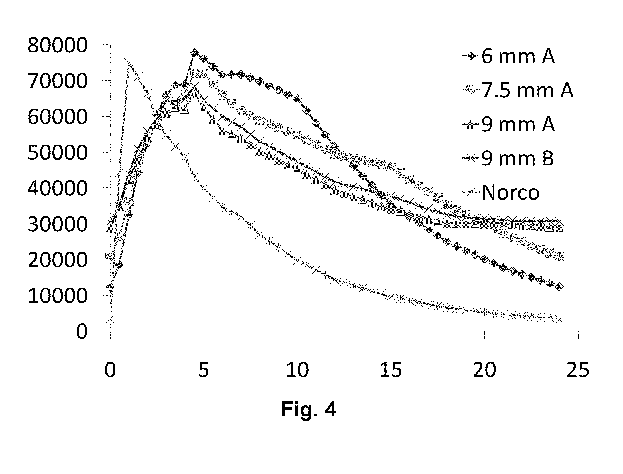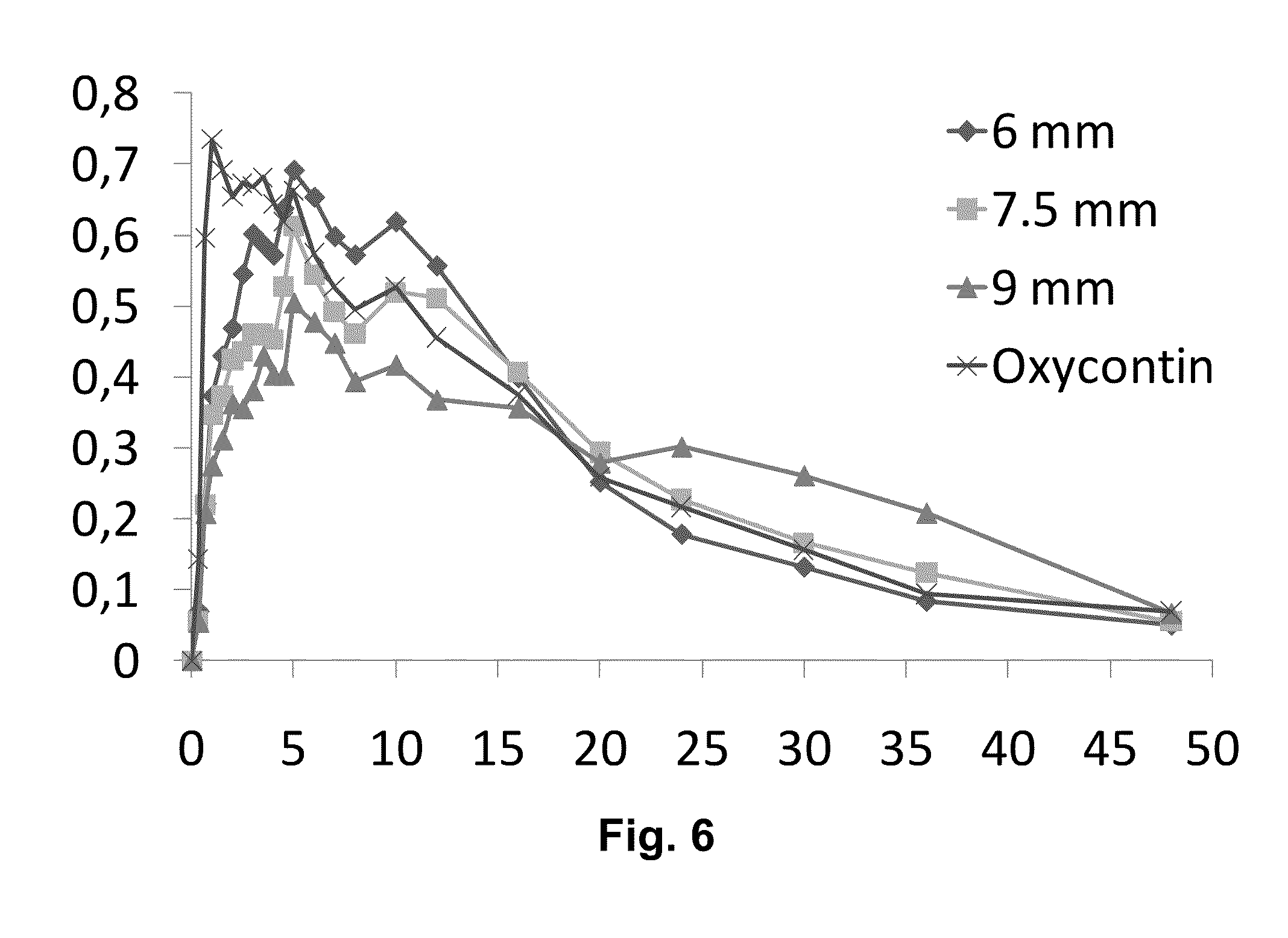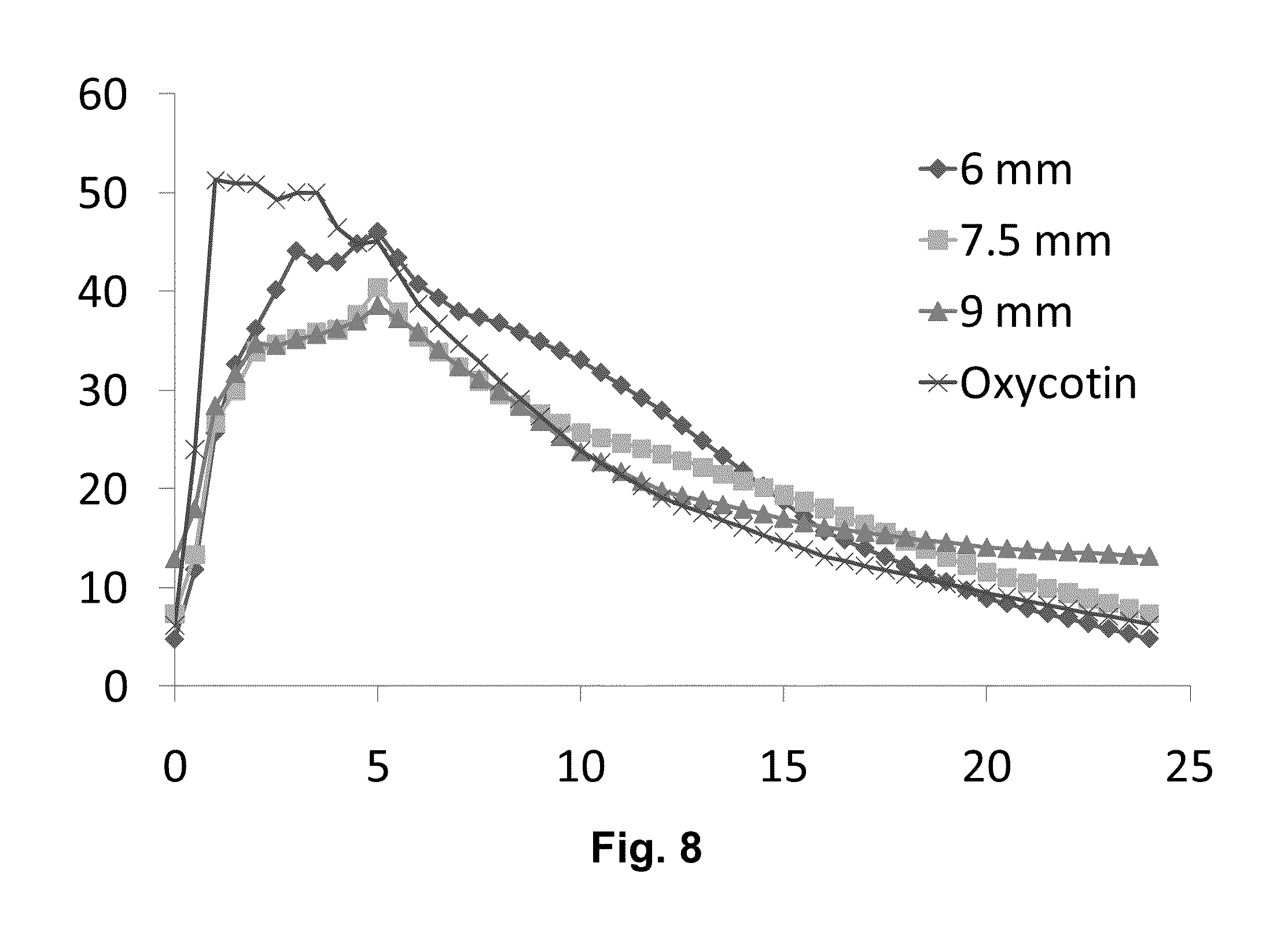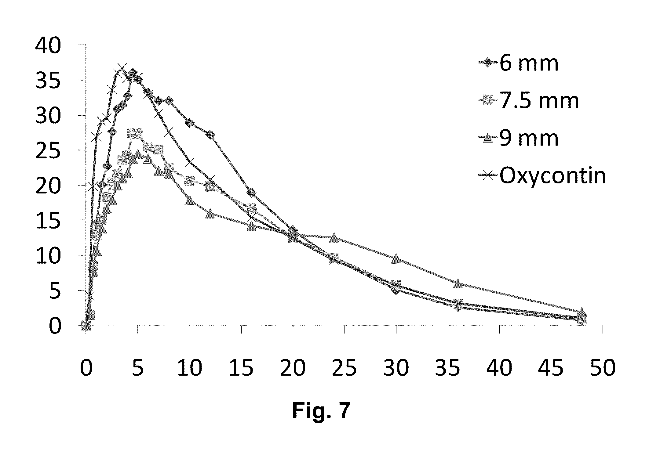 Summery of Steady State parameters Peak Trough Trough/Peak Tmax Analyte Treatment (ng/mL) (ng/mL) Ratio (Hours) Oxycodone Reference N 11 11 11 11 Mean 58.78 6.39 0.11 2.20 Median 60.29 5.89 0.11 2.50 Range 41.31-85.57 4.35-9.81 0.09-0.14 0.67-4.0 Test 6.0 mm N 13 13 13 13 Mean 48.04 4.44 0.09 4.89 Median 43.57 3.92 0.08 5.00 Range 33.80-60.94 1.56-7.91 0.04-0.17 2.50-10.0 Test 7.5 mm N 12 12 12 12 Mean 42.22 6.95 0.17 4.38 Median 40.47 6.30 0.16 4.75 Range 34.22-58.74 2.62-11.08 0.07-0.32 2.00-6.0 Test 9.0 mm N 11 11 11 11 Mean 42.42 13.86 0.33 4.23 Median 39.73 12.30 0.31 4.50 Range 31.38-58.58 9.31-19.84 0.25-0.43 1.00-6.0 Conclusions