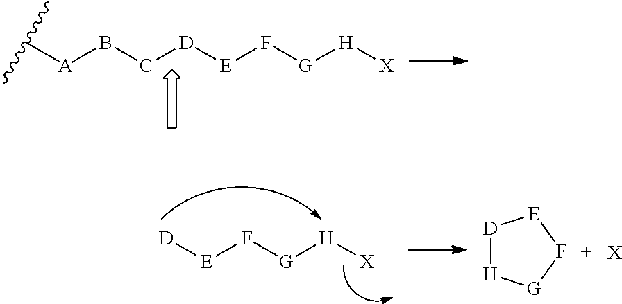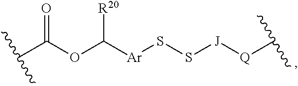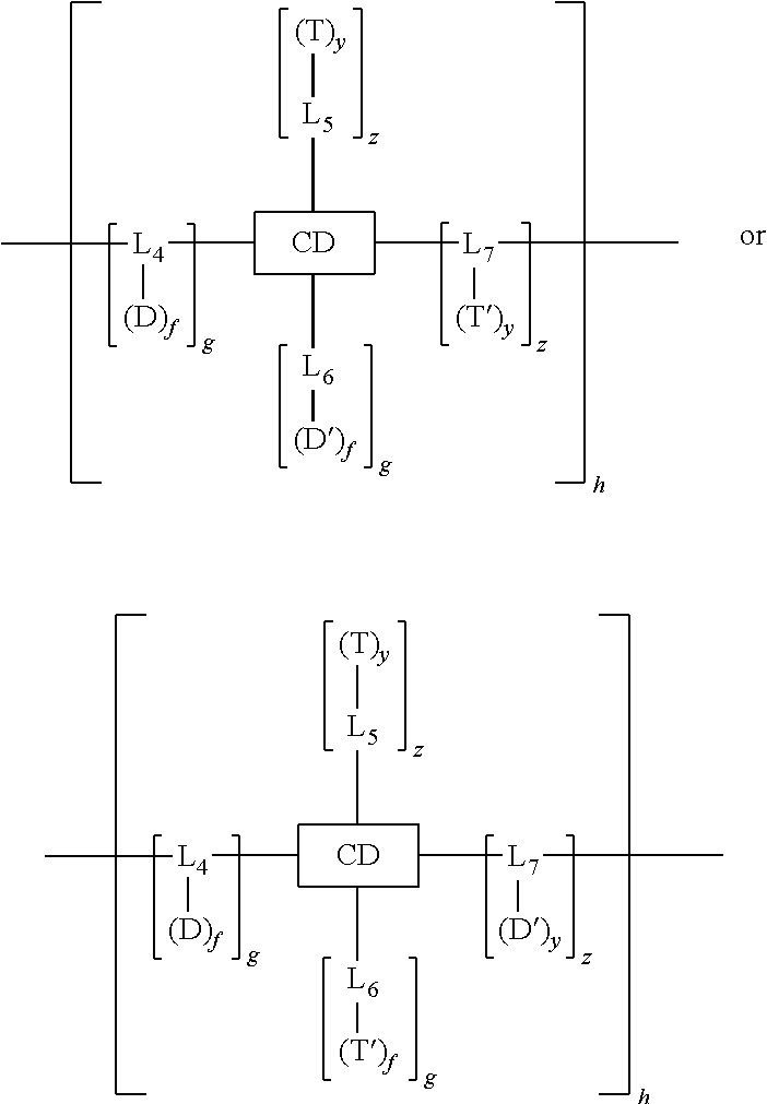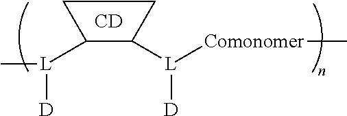 While Scheme VI shows that the drug is attached at all available positions, not all positions may be reacted. Therefore, a particle comprising conjugates described above may include a conjugate reacted at all positions available for attachment and particles that have less than all of the positions available for attachment containing the drug, e.g., the particle can include CPD reacted at one or none of the positions available for attachment. Thus, while Scheme VI depicts CPT at every point of attachment of each polymer subunit, the CDP-CPT conjugate can have less than 2 CPT molecules attached to any given polymer subunit of the CDP. For example, in one embodiment, the CDP-CPT conjugate includes several polymer subunits and each of the polymer subunits can independently include two, one or no CPT attached at each point of attachment of the polymer subunit. In addition, the particles and compositions can include CDP-CPT conjugates having two, one or no CPT attached to each polymer subunit of the CDP-CPT conjugate and the conjugates can also include a mixture of CDP-CPT conjugates that can vary as to the number of CPTs attached at each point of attachment of the polymer subunits of the conjugates in the particle or composition.