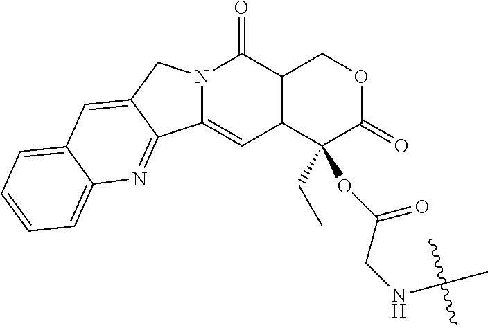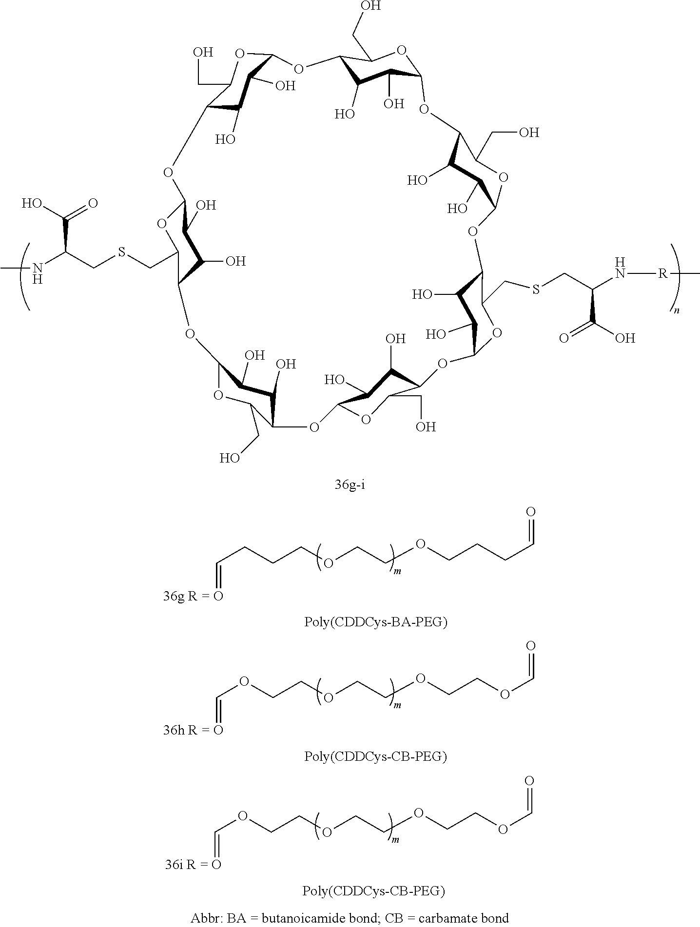 While Scheme IX shows that the drug is attached at all available positions in the subunit, not all positions may be reacted. Therefore, a particle comprising conjugates described above may include a conjugate reacted at all positions available for attachment and particles that have less than all of the positions available for attachment containing the drug, e.g., the particle can include CPD reacted at one or none of the positions available for attachment. Thus, while Scheme IX depicts SN-38 at every point of attachment of each polymer subunit, the CDP-SN-38 conjugate can have less than 2 SN-38 molecules attached to any given polymer subunit of the CDP. For example, in one embodiment, the CDP-SN-38 conjugate includes several polymer subunits and each of the polymer subunits can independently include two, one or no Sn-38 attached at each point of attachment of the polymer subunit. In addition, the particles and compositions can include CDP-SN-38 conjugates having two, one or no Sn-38 attached to each polymer subunit of the CDP-Sn-38 conjugate and the conjugates can also include a mixture of CDP-Sn-38 conjugates that can vary as to the number of Sn-38s attached at each point of attachment of the polymer subunits of the conjugates in the particle or composition.
