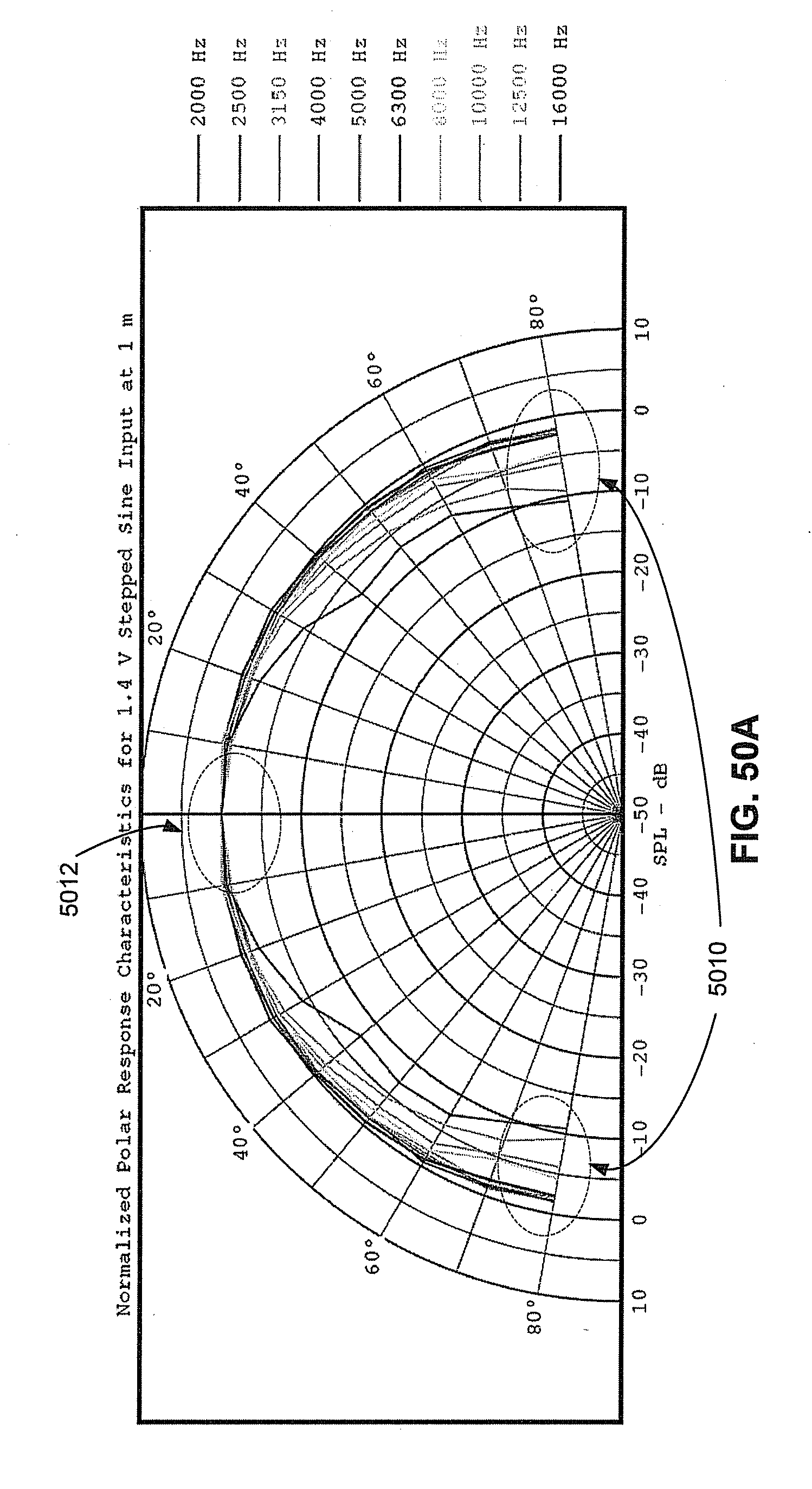 As another example of improved directivity performance, in 51A, the off-axis sound pressure level (SPL) data from a speaker without an acoustic lens has relatively tight groupings 5110, 5112, and 5114, of response curves. In contrast, in FIG. B, the off-axis sound pressure level data has groupings 5120 and 5122. The relatively tight groupings 5110, 5112, and 5114, correspond to improved directivity. In contrast, in FIG. 51B, the grouping o 5110 and 5112 of the SLP for each off-axis position diverges substantially and non-uniformly.