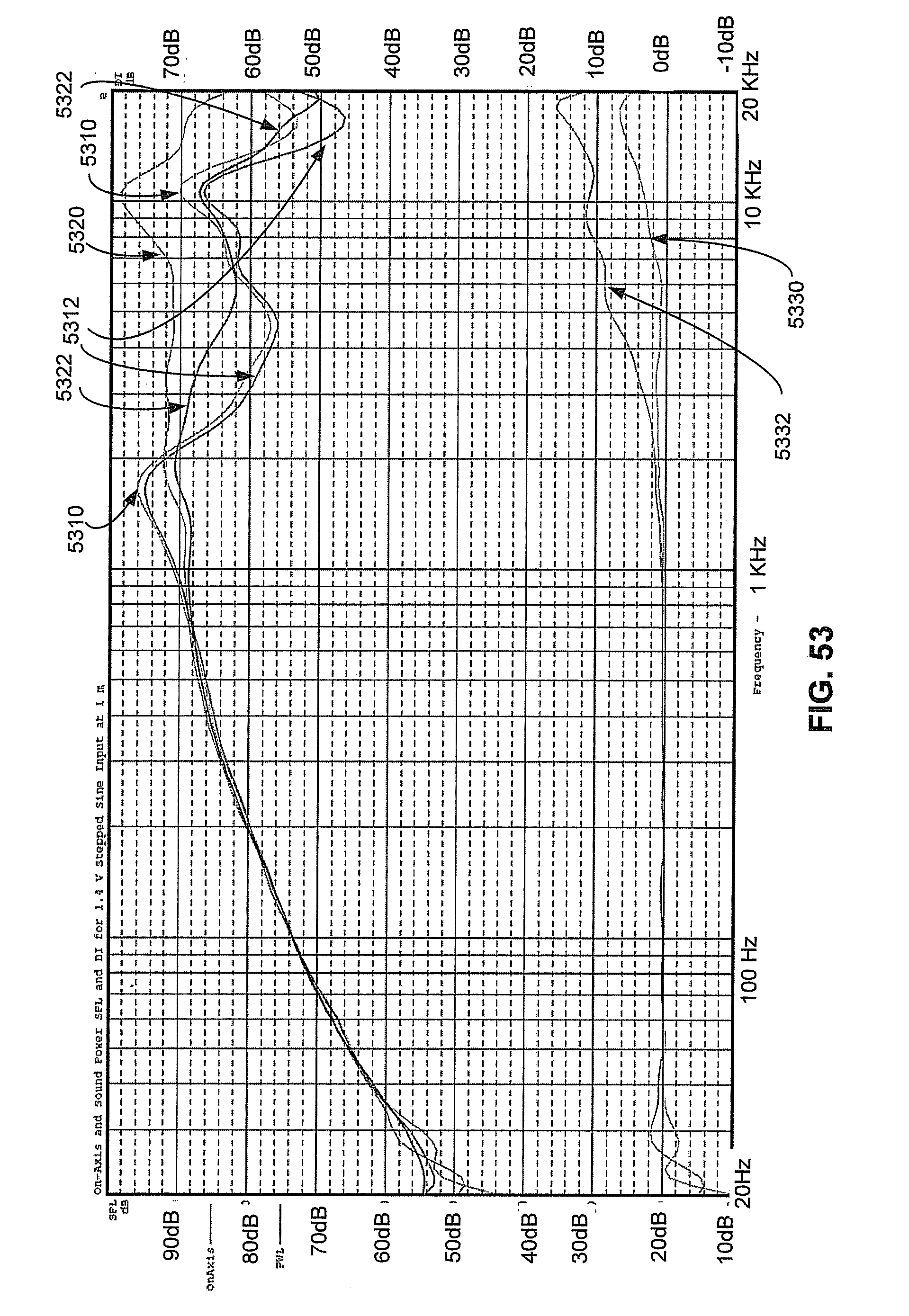 FIG. 53 depicts data representative of a sound pressure level (SPL), a power watt level (PWL), and a directivity index (DI) for a speaker without an acoustic lens). In FIG. 53, sound pressure level (SPL) 5310, power watt level (PWL) 5312, and the directivity index (DI) 5330 correspond to the performance of an assembly having a speaker and an acoustic lens. In contrast, sound pressure level (SPL) 5320, power watt level (PWL) 5322, and the directivity index (DI) 5332 correspond to the performance of the same speaker without an acoustic lens.
