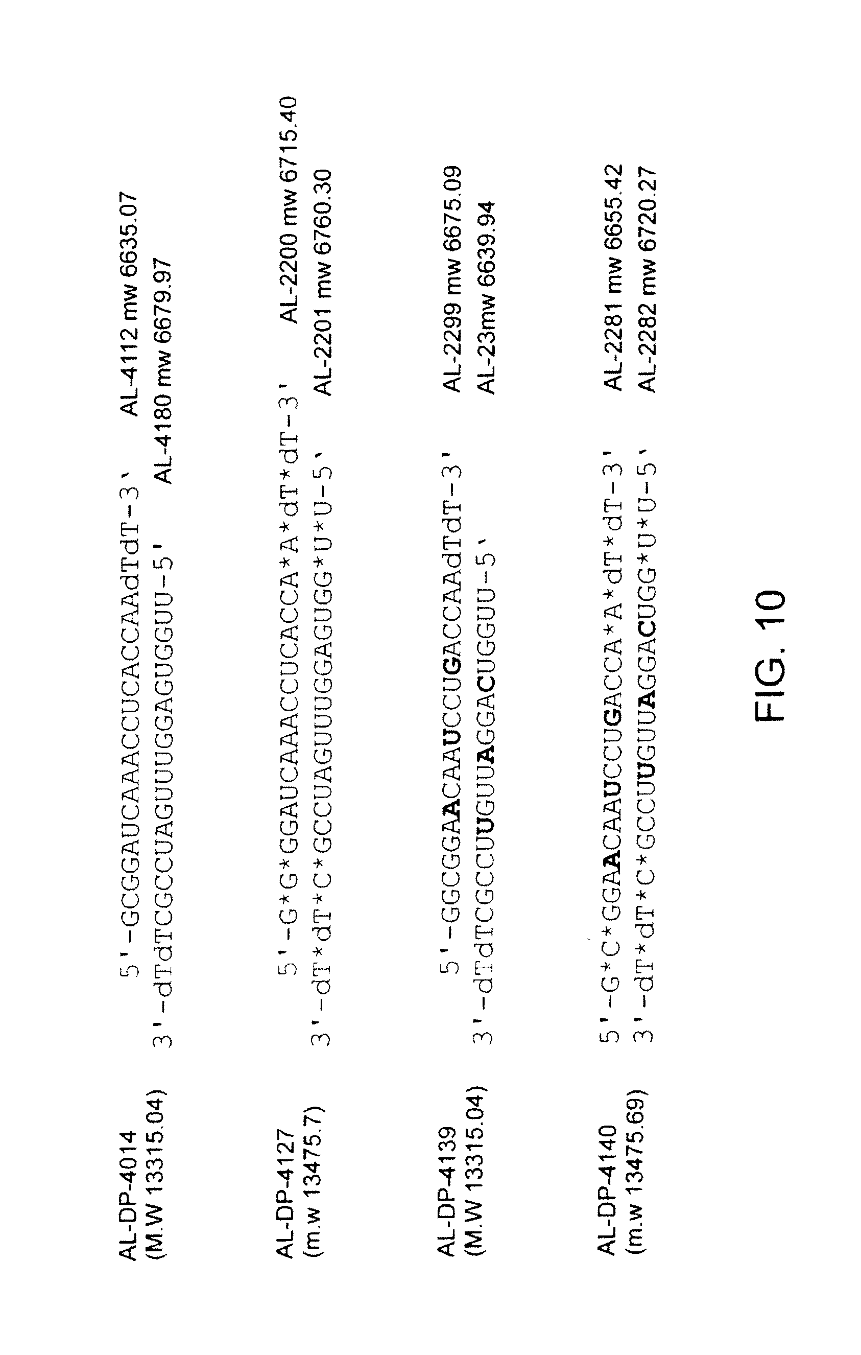 The strands are shown written 5′ to 3′. Lower case “s” indicates a phosphorothioate linkage. The lower case “d” indicates a deoxy residue. “HP—NH2” or “NH2-HP” indicates a hydroxyprolinol amine conjugate. “Chol-” indicates a hydroxyprolinol cholesterol conjugate. Subscript “OMe” indicates a 2′-O-methyl sugar and subscript “F” indicates a 2′-fluoro modified sugar. Purity was determined by CGE except where indicated by an asterisk (in these two cases, purity was determined by ion-exchange chromatography).
