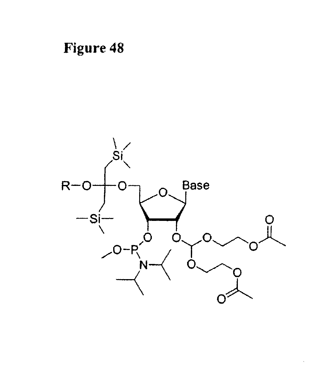 Microwave deprotection RNA and its MS Analysis 2′-silyl Com- deprotection cal. found pound Sequence condition mass mass 50 5′ ACGUCGAUAT 3′ TBAF 2 min 3142.95 3142.57 (SEQ ID NO: 16) 50 5′ ACGUCGAUAT 3′ Py.HF 2 min 3142.95 nd (SEQ ID NO: 16) 50 5′ ACGUCGAUAT 3′ Py.HF 4 min 3142.95 nd (SEQ ID NO: 16) 51 5′ CGUCAAGGCGAT 3′ TBAF 2 min 3832.37 3831.34 (SEQ ID NO: 17) 51 5′ CGUCAAGGCGAT 3′ TEA.3HF 2 min 3832.37 3831.34 (SEQ ID NO: 17) 51 5′ CGUCAAGGCGAT 3′ TEA.3HF 4 min 3832.37 3831.34 (SEQ ID NO: 17) nd: not determined Example 7