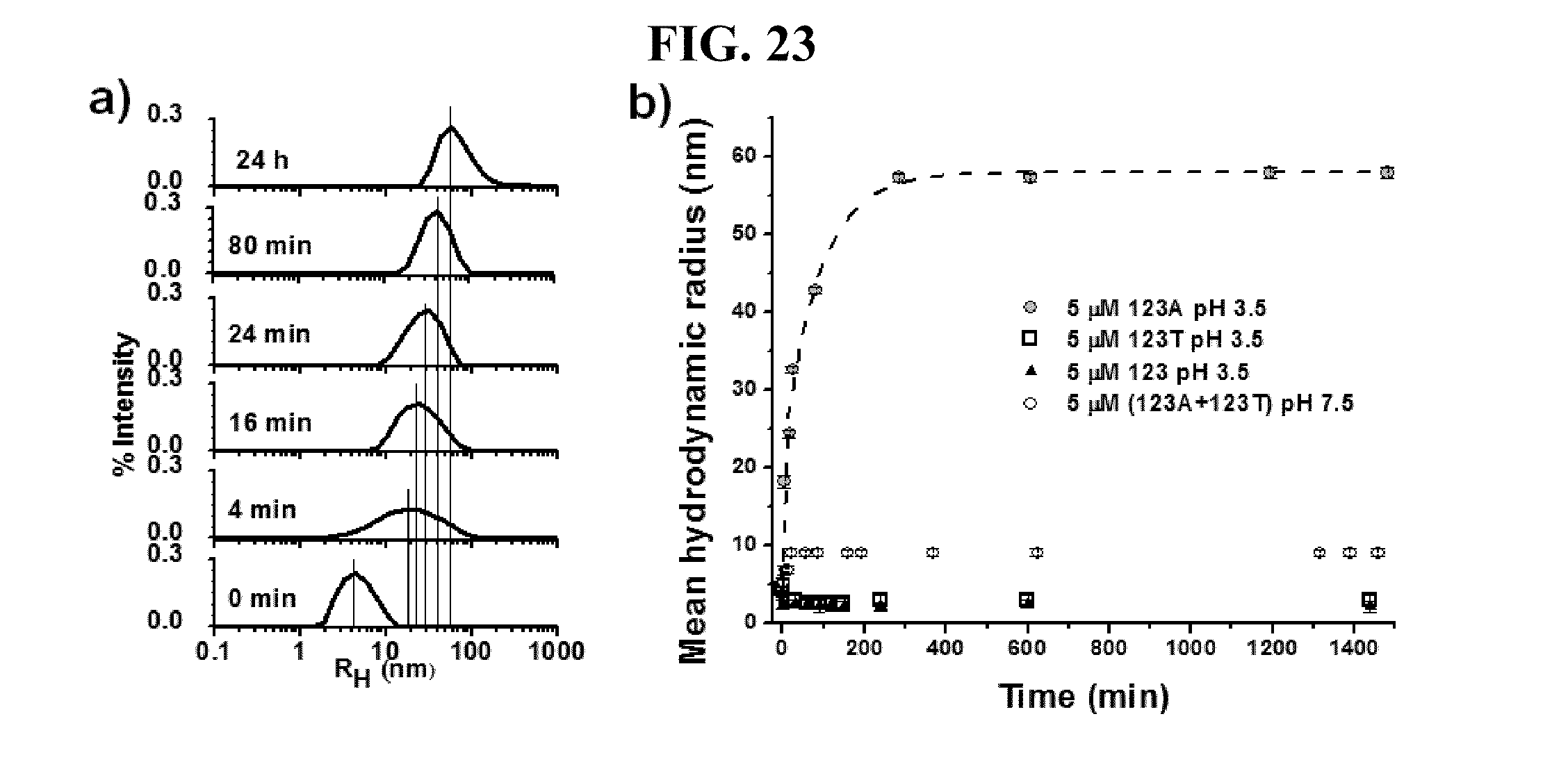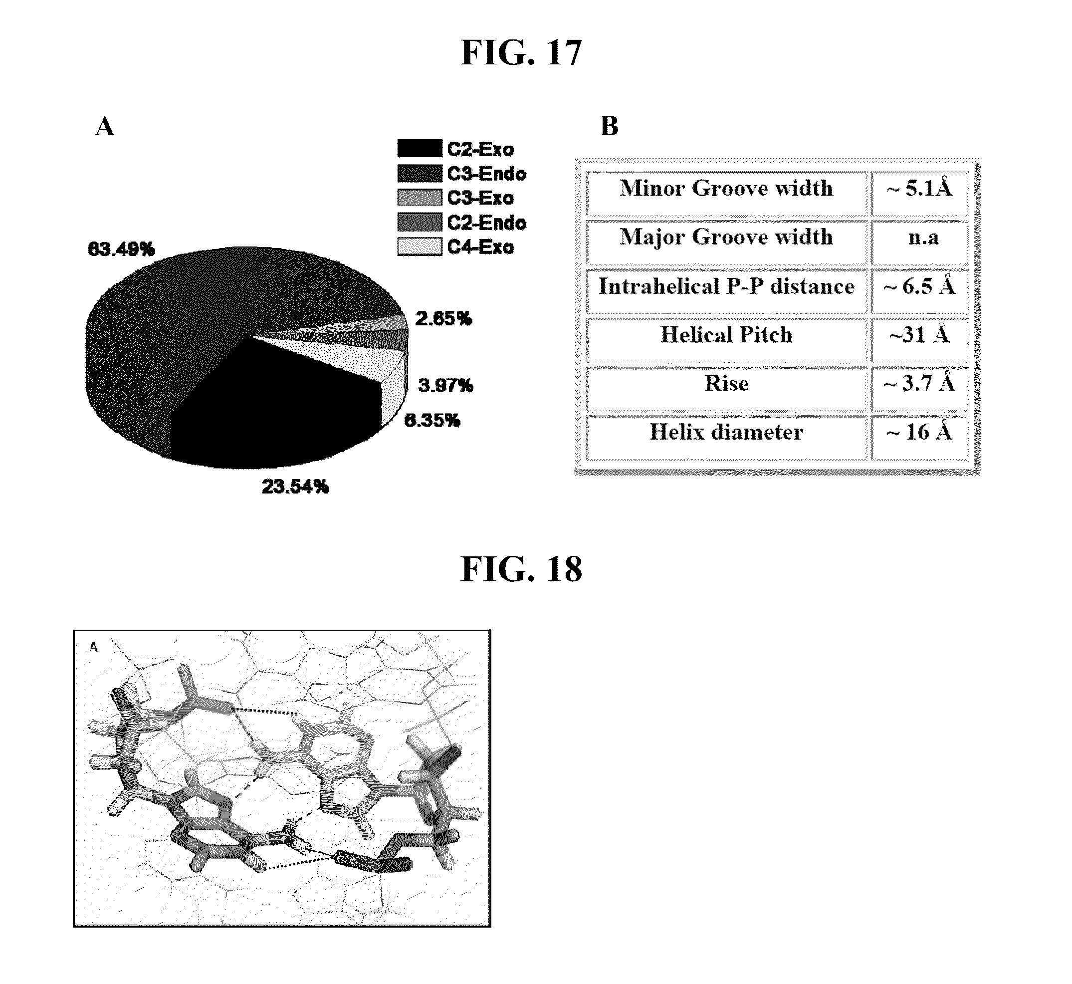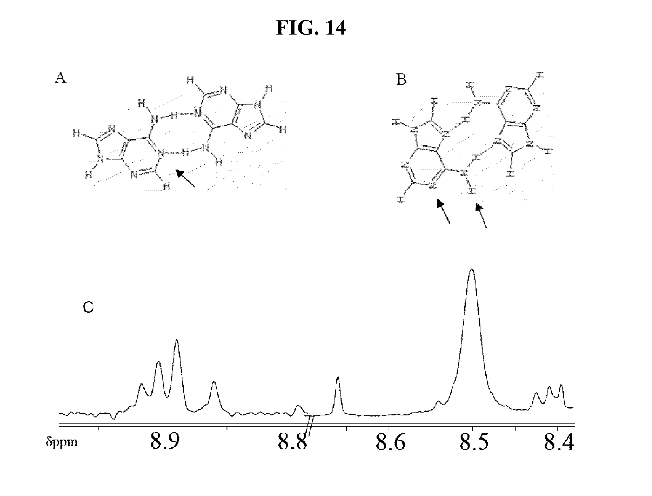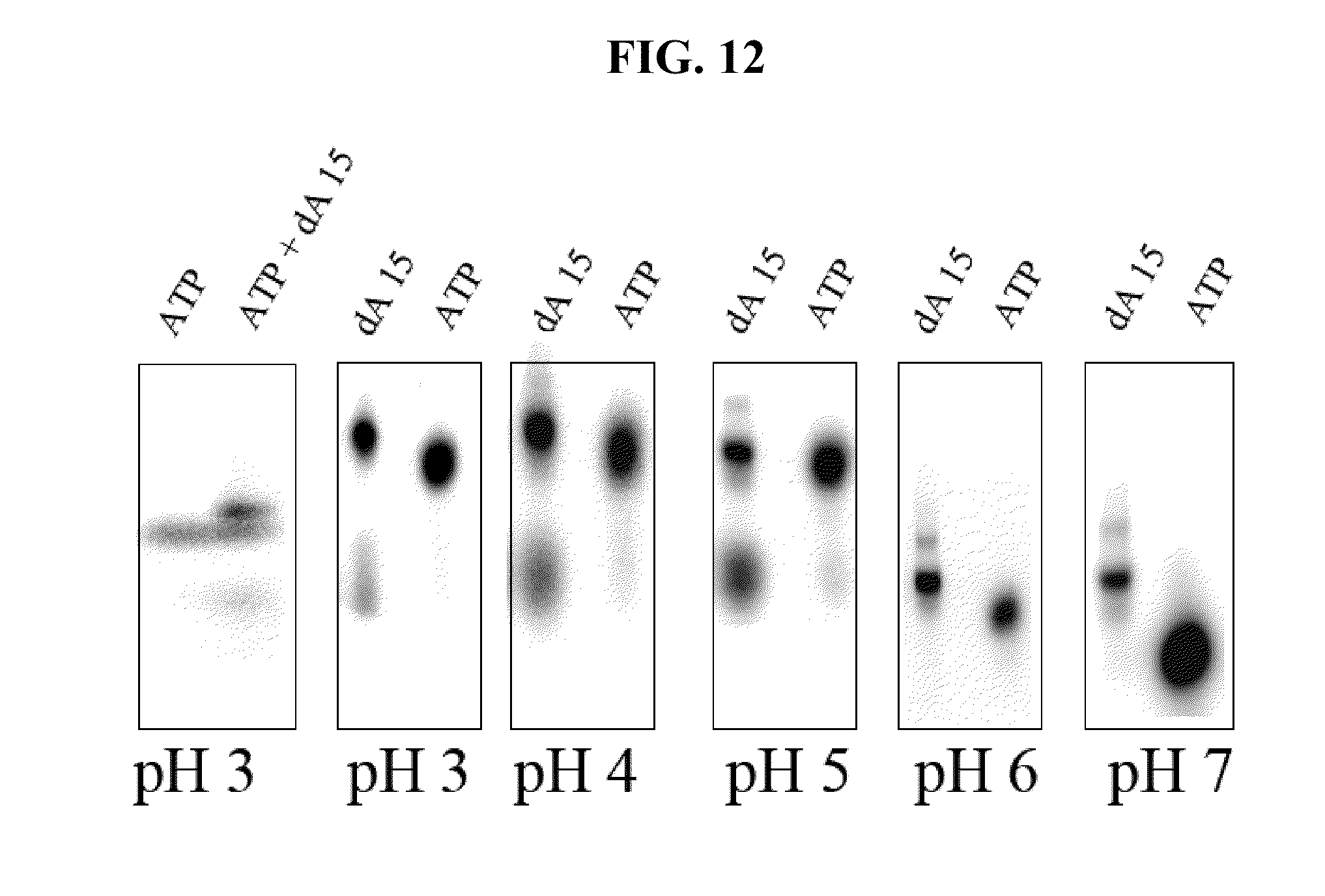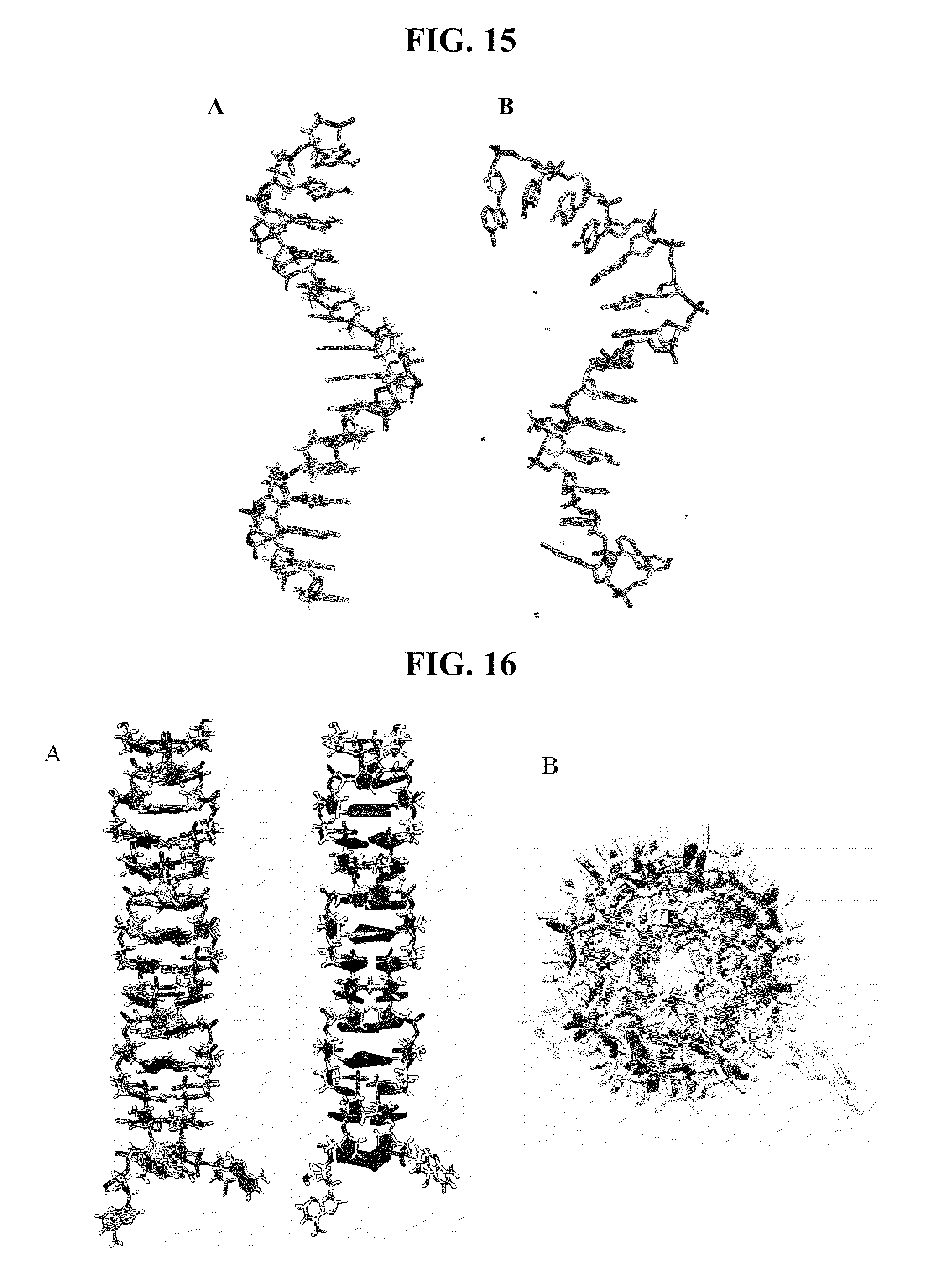 Exemplary Poly dA Sequences Name Sequence SEQ ID NO: Poly dA15 5′-d(AAAAAAAAAAAAAAA)-3′ SEQ ID NO: 1 dTA6 5′-d(TAAAAAA)-3′ 3′-Dabcyl-dA15 5′-d(AAAAAAAAAAAAAAA)- SEQ ID NO: 2 Dabcy1-3′ 3′-TMR-dA15 5′-d(AAAAAAAAAAAAAAA)- SEQ ID NO: 3 TMR-3′ 5′-TAMRA-dA15 5′-TAMRA-d SEQ ID NO: 4 (AAAAAAAAAAAAAAA)-3′ Concentration dependence of the duplex thermal stability as probed by CD. Concentration (μM) T1/2(in ° C.) 2 83 5 88 10 90 Chi Gamma Delta Epsilon Zeta Alpha Beta −173.1 57.8 83.1 −153 −62.4 −69.2 −172.53 Shift Slide Rise Tilt Roll Twist 0.03 −2.83 3.9 −13 −2.9 44.3 Length dependence kinetics of poly dA segments Association Length of rate constant Poly dA (kon(M−1s−1)) 10 1.3 × 107 15 5.3 × 107 20 9.5 × 107 Example 2