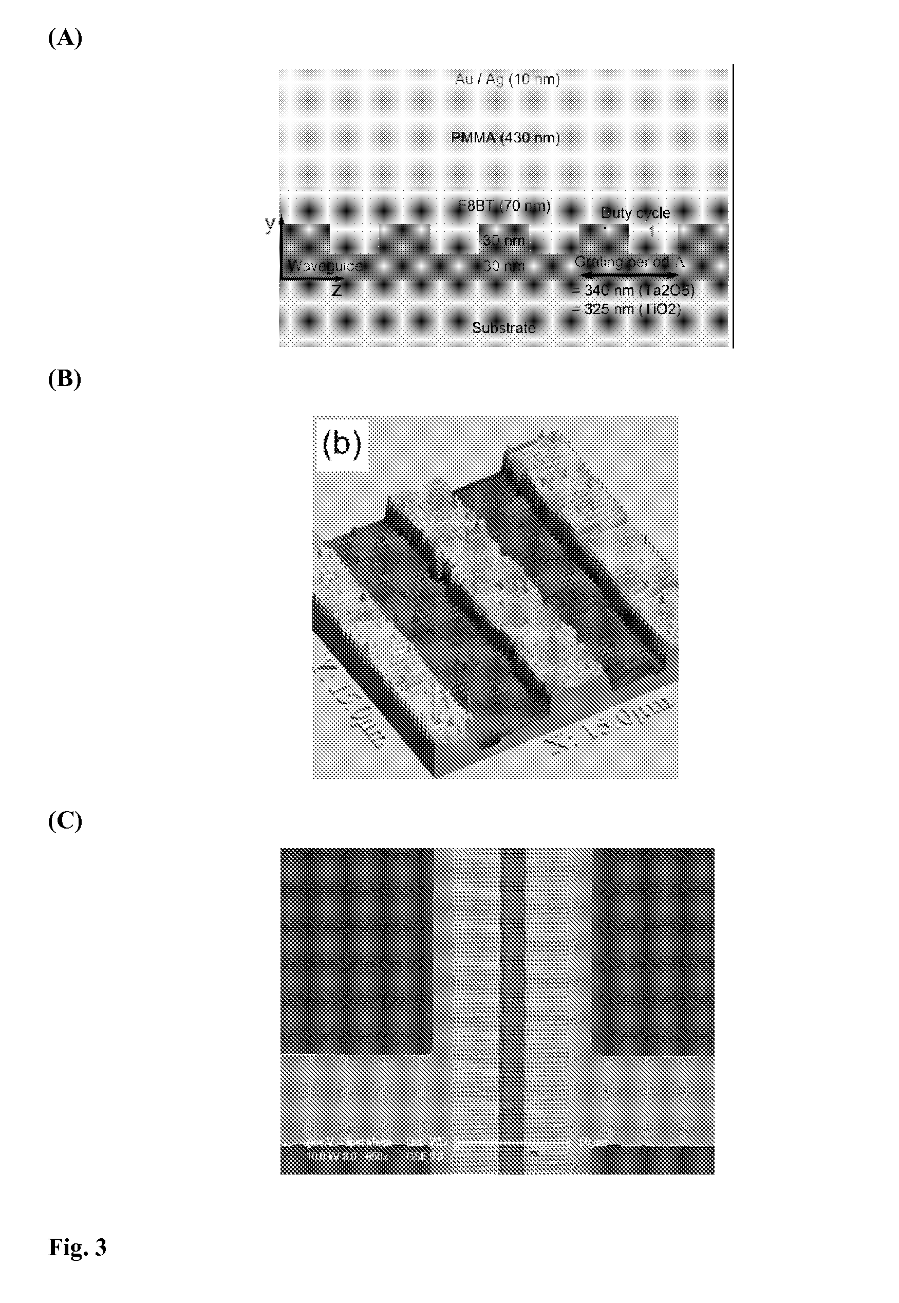 This application is the United States national stage filing of PCT/GB2009/051601 entitled “Optoelectronic Devices” and filed Nov. 26 2009; which claims priority to Great Britain Patent Application GB0821980.0 filed Dec. 2, 2008. Each of the aforementioned applications are incorporated herein by reference for all purposes. This invention relates to integrated optoelectronic devices comprising light-emitting field-effect transistors. Organic electronic devices, such as light-emitting diodes, solar cells and field-effect transistors have become of interest for a range of applications in displays and electronics. Organic LEDs have advanced to become one of the most efficient light sources available, organic photodetectors and organic solar cells are capable of near 100% quantum efficiencies, organic-based biological, chemical and mechanical sensors and memory devices are being developed for a range of different applications. A recognized strength of organic devices is the ease with which different device functionalities can be integrated in a common materials platform. All these functionalities can in principle be realized using similar materials than can be processed using a common set of manufacturing technologies. Therefore, integration of multifunctional devices on a common substrate is simpler than, for example, for silicon based devices. There is particular interest in integration of information processing functions realized used transistor devices and optical function with light generated by LEDs and detected by photodetectors. Integration of optical and electronic functions could be used in optoelectronic integrated circuits, in which a light signal that is generated in response to the outcome of some computations is coupled into a waveguide structure and send to a spatially separate part of the system in which it is detected and initiates another information processing function. Similarly, electrically pumped lasing devices are of interest in which an electrically stimulated gain medium is incorporated into an optical feedback structure to achieve coherent light generation of well-defined wavelength by stimulating the emission of the gain medium. Electrically pumped lasers using organic semiconductors have not been realized yet, although optically pumped lasing has been achieved in a number of systems (Samuel, Chem. Rev. 107, 1272 (2007)). The reasons for this are related to additional optical losses that arc present when electrical pumping is used, due to presence of electrodes (losses due to absorption of light in electrodes), charge-carrier induced absorptions as well as presence of triplet states. At present no device architecture has been proven to be suitable realization of an electrically pumped organic semiconductor laser. A common architecture for optically pumped organic lasers are distributed feedback (DFB) structures (Samuel, Chem. Rev. 107, 1272 (2007)), in which a 1-D or 2D periodic grating structure is integrated together with a film of an organic gain medium. Most DFB lasers reported in the literature so far are mostly etched into the glass substrate, and their feedback thus relies on the index contrast between the glass and the organic gain material deposited on top. A promising alternative approach is to include a thin layer of a material with a large refractive index (e.g, tantalum pentoxide Ta2O5, n=2.07) comprising the required feedback pattern, onto which the organic material is deposited (Harbers, Appl. Phys. Letters 87, 151 121 (2005)). However, the aforementioned are limited and there exists a need in the art for additional improvements. These and other aspects of the invention will now be further described, by way of example only, with reference to the accompanying figures in which: This invention relates to integrated optoelectronic devices comprising light-emitting field-effect transistors. In one or more embodiments of the present invention, there is provided a light-emitting organic field transistor integrated with a ridge or rib waveguide incorporated within the channel of the LFET. In preferred embodiments the recombination zone in the LFET is placed on top of the waveguide using suitable voltage conditions and the light emitted from the recombination zone of the LFET is coupled into the waveguide. Then in embodiments the light is waveguided along the waveguide, either to a spatially separate part of the device where, for example, it is detected by a photodetector, or say to a suitable structure for outcoupling of the light into free space. The light emitted in tile waveguide can be modulated by either turning ON and OFF the LFET or by moving the recombination zone, for example positioning the recombination zone away from the waveguide structure in the channel by using an applied bias (source-drain, gate voltages). Some embodiments of the present invention provide a light-emitting organic field transistor integrated with a high refractive index ridge or rib waveguide incorporated within the channel of the LFET, wherein said waveguide also has an optical feedback incorporated. Thus in embodiments the waveguide is configured to provide an optical feedback mechanism. The waveguide structure can be formed, for example, from a high n-material such as TiO2or Ta2O5. The optical Feedback structure may be a 1D or 2D DFB grating to modify the optical transmission of guided modes in the waveguide. The optoelectronic device may, for example, be operated as a lasing device, wherein electrical pumping is provided by the ambipolar current of the LFET. The proposed architecture provides efficient optical feedback, and thus lasing thresholds are lowered. This is because the effective index of the laser mode is raised, as the mode is more tightly confined in the hybrid waveguide formed by the high-index material and the organic gain material. The structure also provides more effective confinement of the light than what would be achievable with the organic semicondu