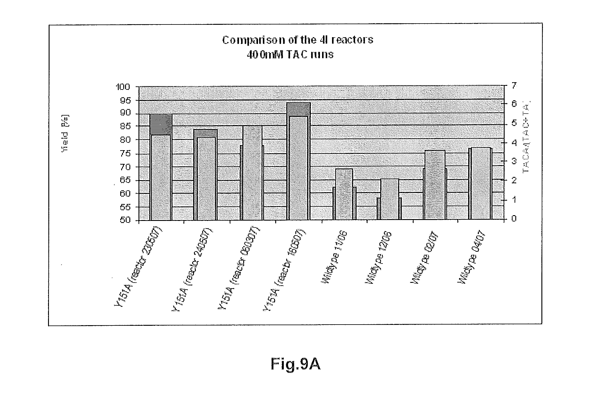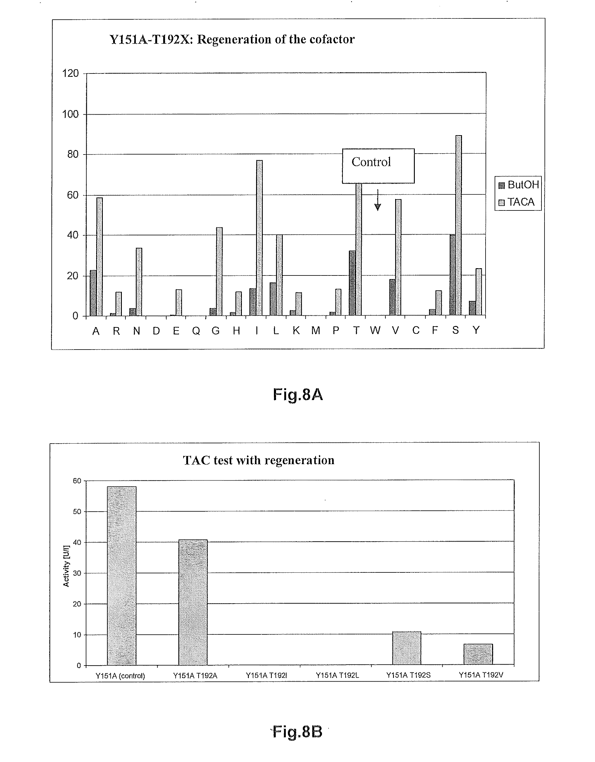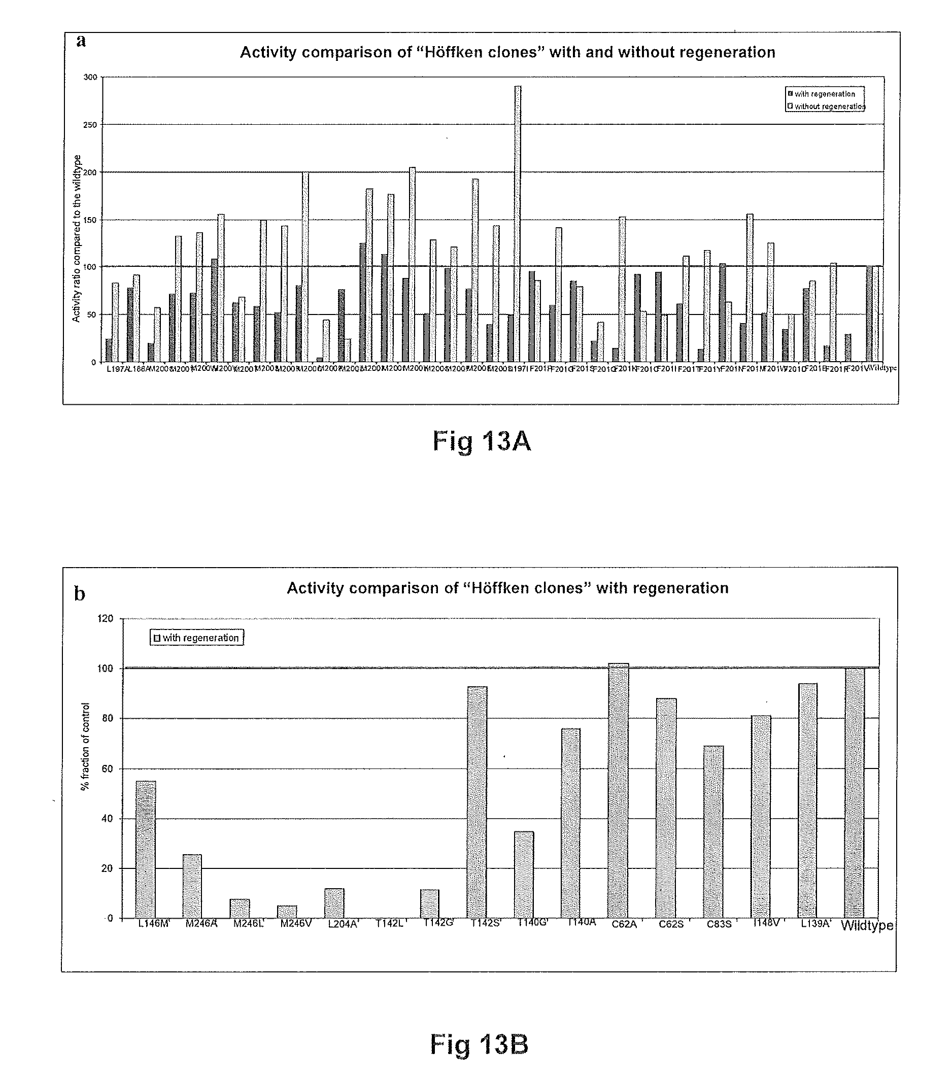 FIG. 13A shows the results from the activity tests in which both the reduction of TAC to TACA with the addition of NADH, and also the overall reaction with regeneration (dark bars) were tested as described in point 2.2. In FIG. 13B, only the total reaction with regeneration has been tested.
