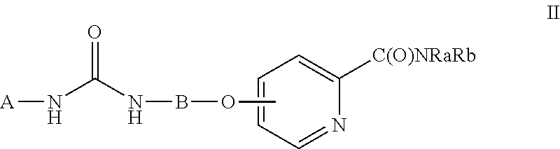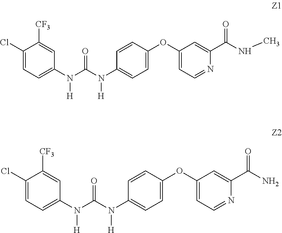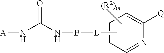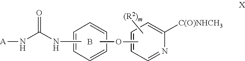 The metabolites of the compounds of this invention include oxidized derivatives of the compounds of formula I, II, X, Z1 and Z2, wherein one or more of the nitrogens are substituted with a hydroxy group; which includes derivatives where the nitrogen atom of the pyridine group is in the oxide form, referred to in the art as 1-oxo-pyridine or has a hydroxy substituent, referred to in the art as 1-hydroxy-pyridine. General Preparative Methods The particular process to be utilized in the preparation of the compounds used in this embodiment of the invention depends upon the specific compound desired. Such factors as the selection of the specific substituents play a role in the path to be followed in the preparation of the specific compounds of this invention. Those factors are readily recognized by one of ordinary skill in the art. The compounds of the invention may be prepared by use of known chemical reactions and procedures as described in the following published international applications WO 00/42012, WO03/047579, WO 2005/009961, WO 2004/078747 and WO05/000284 and European patent applications EP 04023131.8 and EP 04023130.0. The compounds of the invention can be made according to conventional chemical methods, and/or as disclosed below, from starting materials which are either commercially available or producible according to routine, conventional chemical methods. General methods for the preparation of the compounds are given below. The preparation of ureas of formula (I) can be prepared from the condensation of the two arylamine fragments and in the presence of phosgene, di-phosgene, tri-phosgene, carbonyldiimidazole, or equivalents in a solvent that does not react with any of the starting materials, as described in one or more of these published. Alternatively, compounds of formula (I) can be synthesized by reacting amino compounds) with isocyanate compounds as described in one or more of the published international applications described above. The isocyanates are commercially available or can be synthesized from heterocyclic amines according to methods commonly known to those skilled in the art [e.g. from treatment of an amine with phosgene or a phosgene equivalent such as trichloromethyl chloroformate (diphosgene), bis(trichloromethyl)carbonate(triphosgene), or N,N′-carbonyldiimidazole (CDI); or, alternatively by a Curtius-type rearrangement of an amide, or a carboxylic acid derivative, such as an ester, an acid halide or an anhydride]. Aryl amines of formulas are commercially available, or can be synthesized according to methods commonly known to those skilled in the art. Aryl amines are commonly synthesized by reduction of nitroaryls using a metal catalyst, such as Ni, Pd, or Pt, and H2or a hydride transfer agent, such as formate, cyclohexadiene, or a borohydride (Rylander. Pyridine-1-oxides of formula (I) where the pyridine ring carries a hydroxy substituent on its nitrogen atom, and A, B, L are broadly defined as above can be prepared from the corresponding pyridines using oxidation conditions know in the art. Some examples are as follows: