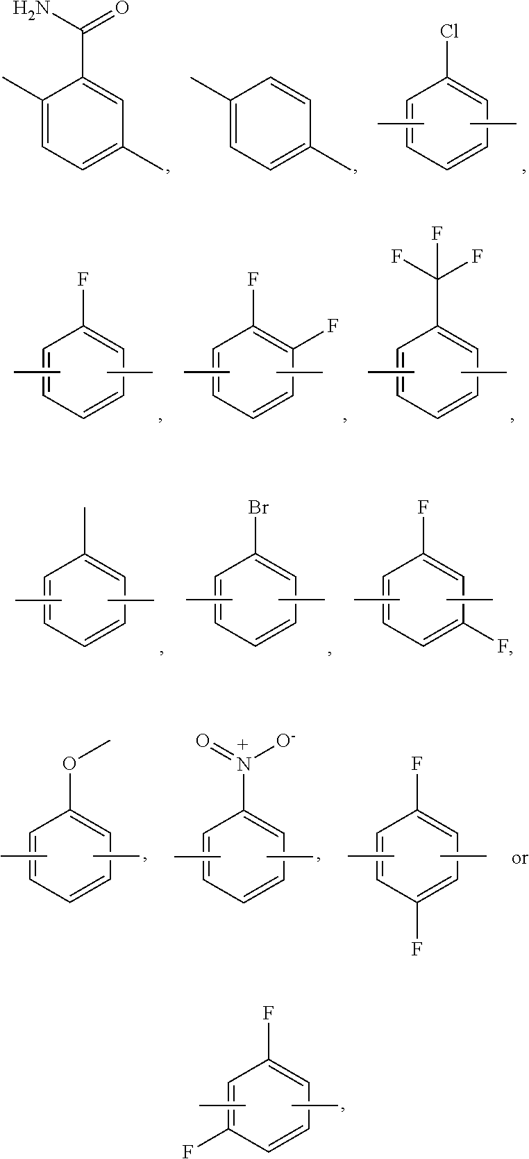 In addition, specific methods for preparing diaryl ureas and intermediate compounds are already described elsewhere in the patent literature, and can be adapted to the compounds of the present invention. For example, Miller S. et al, “Inhibition of p38 Kinase using Symmetrical and Unsymmetrical Diphenyl Ureas” PCT Int. Appl. WO 99 32463, Miller, S et al “Inhibition of raf Kinase using Symmetrical and Unsymmetrical Substituted Diphenyl Ureas” PCT Int. Appl., WO 99 32436, Dumas, J. et al., “Inhibition of p38 Kinase Activity using Substituted Heterocyclic Ureas” PCT Int. Appl., WO 99 32111, Dumas, J. et al., “Method for the Treatment of Neoplasm by Inhibition of raf Kinase using N-Heteroaryl-N′-(hetero)arylureas” PCT Int. Appl., WO 99 32106, Dumas, J. et al., “Inhibition of p38 Kinase Activity using Aryl- and Heteroaryl-Substituted Heterocyclic Ureas” PCT Int. Appl., WO 99 32110, Dumas, J., et al., “Inhibition of raf Kinase using Aryl- and Heteroaryl-Substituted Heterocyclic Ureas” PCT Int. Appl., WO 99 32455, Riedl, B., et al., “O-Carboxy Aryl Substituted Diphenyl Ureas as raf Kinase Inhibitors” PCT Int. Appl., WO 00 42012, Riedl, B., et al., “O-Carboxy Aryl Substituted Diphenyl Ureas as p38 Kinase Inhibitors” PCT Int. Appl., WO 00 41698, Dumas, J. et al. “Heteroaryl ureas containing nitrogen hetero-atoms as p38 kinase inhibitors” U.S. Pat. Appl. Pubi., US 20020065296, Dumas, J. et al. “Preparation of N-aryl-N′-[(acylphenoxy)phenyl]ureas as raf kinase inhibitors” PCT Int. Appl., WO 02 62763, Dumas, J. et al. “Inhibition of raf kinase using quinolyl, isoquinolyl or pyridyl ureas” PCT Int. Appl., WO 02 85857, Dumas, J. et al. “Preparation of quinolyl, isoquinolyl or pyridyl-ureas as inhibitors of raf kinase for the treatment of tumors and/or cancerous cell growth” U.S. Pat. Appl. Publ., US 20020165394. All the preceding patent applications are hereby incorporated by reference. Synthetic transformations that may be employed in the synthesis of compounds of formula (I) and in the synthesis of intermediates involved in the synthesis of compounds of formula (I) are known by or accessible to one skilled in the art. Collections of synthetic transformations may be found in compilations, such as: