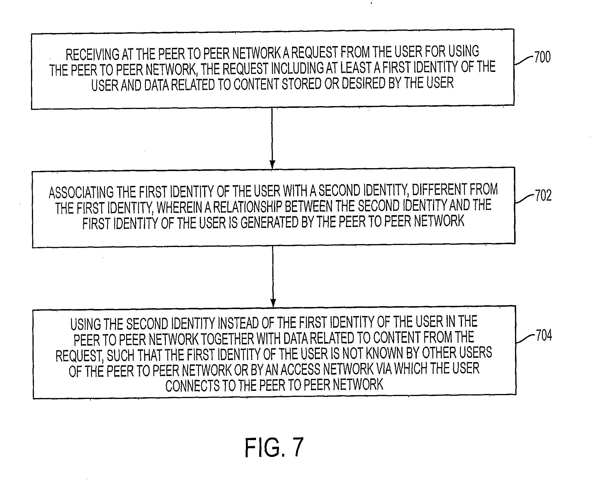 According to this exemplary embodiment, steps to be performed by the peer to peer network for protecting an identity of a user connected to the peer to peer network, from other users of the peer to peer network, are discussed with regard to FIG. 7. In this regard, FIG. 7 shows a step 700 of receiving at the peer to peer network a request from the user for using the peer to peer network, the request including at least a first identity of the user and data related to content stored or desired by the user, a step 702 of associating the first identity of the user with a second identity, different from the first identity, where a relationship between the second identity and the first identity of the user is generated by the peer to peer network, and a step 704 of using the second identity instead of the first identity of the user in the peer to peer network together with data related to content from the request, such that the first identity of the user is not known by other users of the peer to peer network or by an access network via which the user connects to the peer to peer network.
