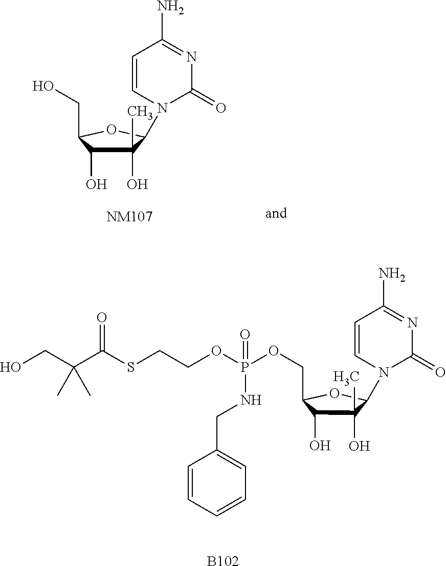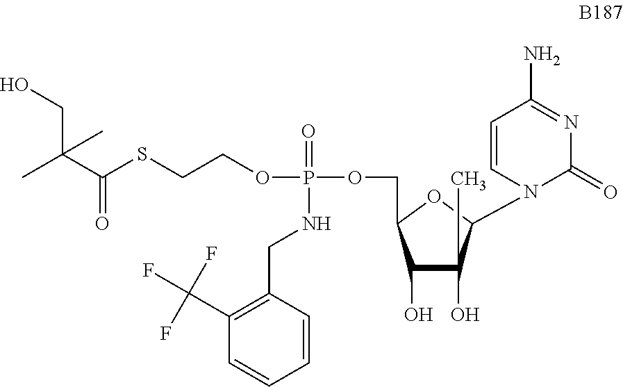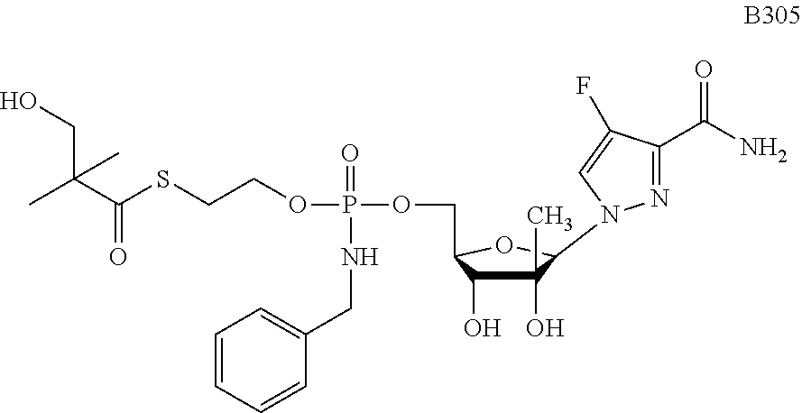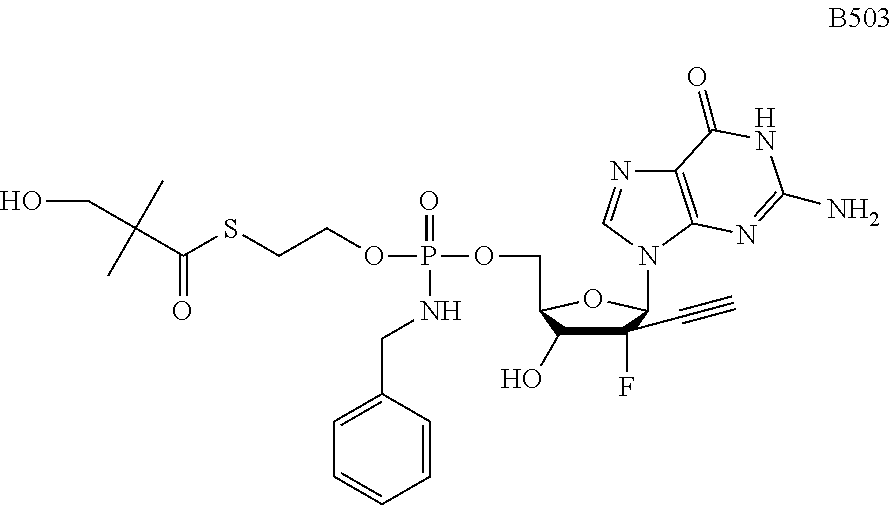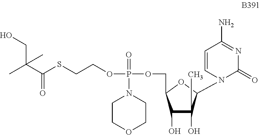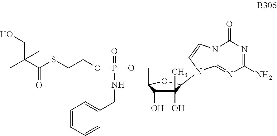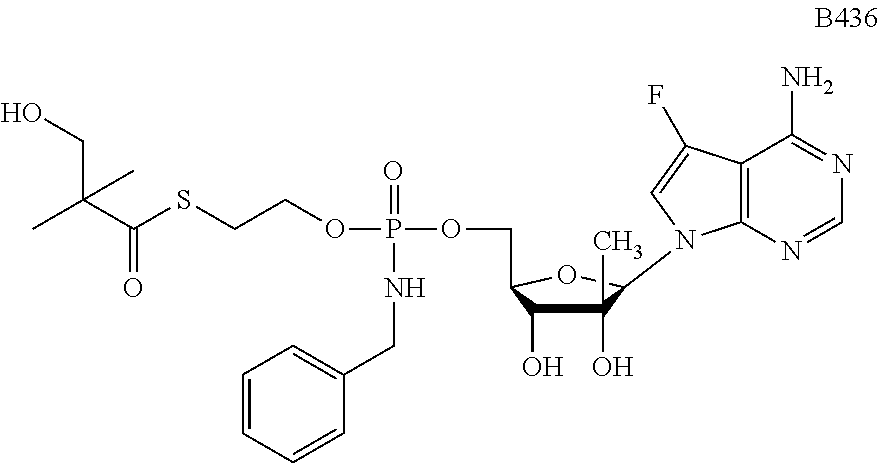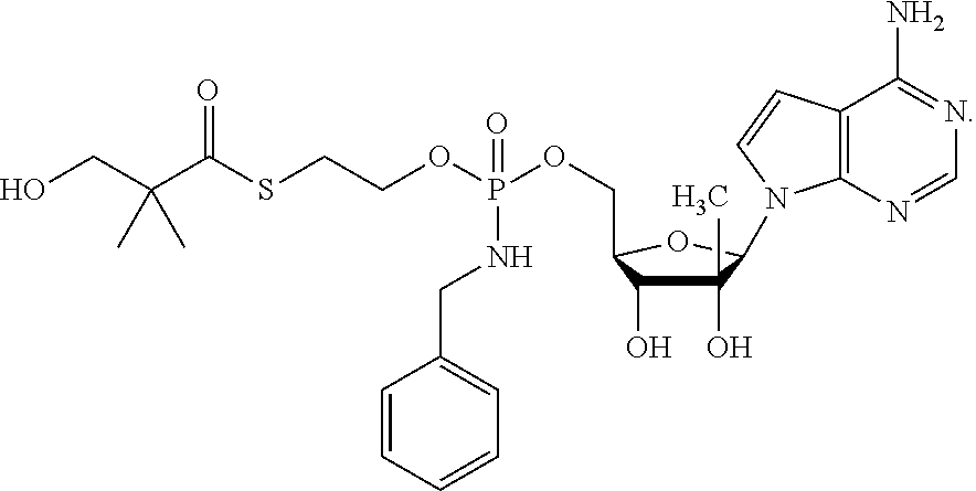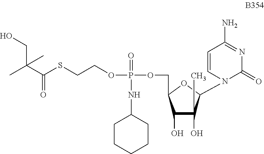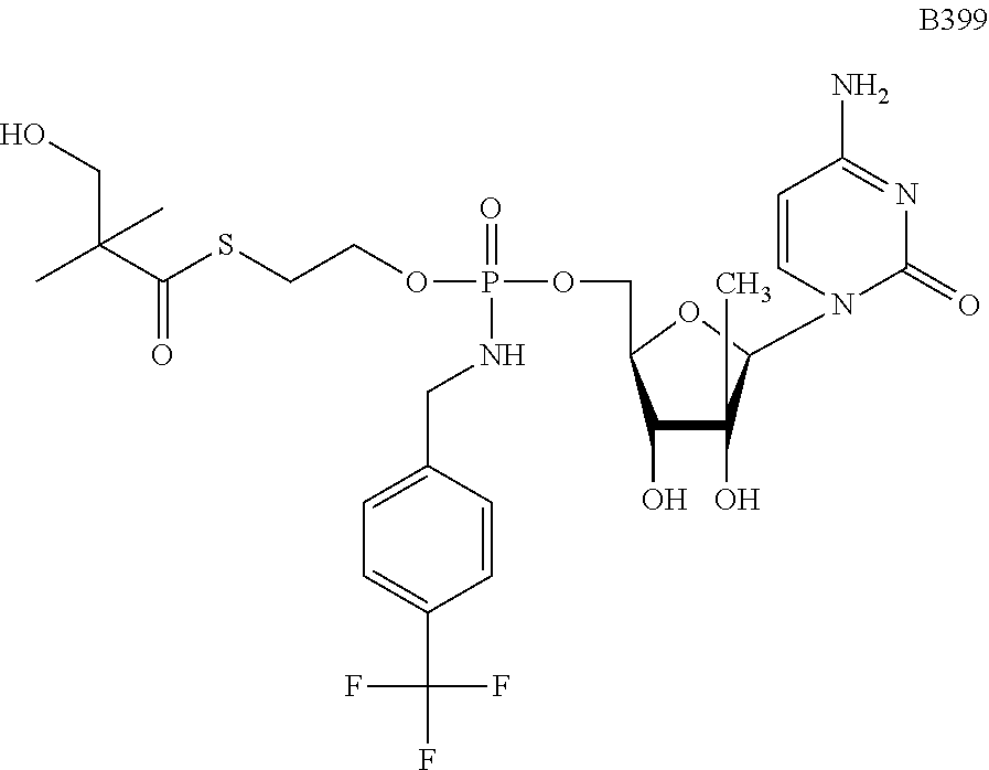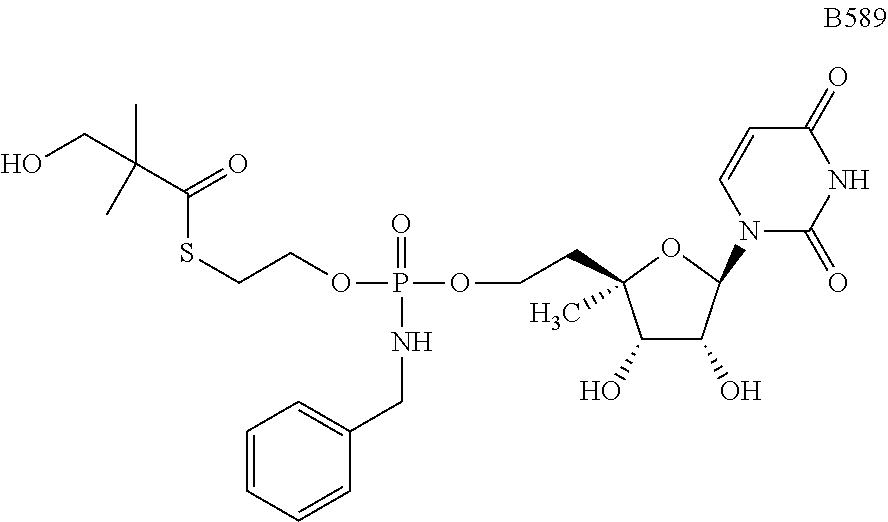 HCV ELISA 2 Compound Reference Structure EC50(μM) CC50(μM) NUCLEOSIDE PARENT: A634 (NM107) ++ + EXAMPLE 2: B102 ++ + EXAMPLE 26: B187 ++ + EXAMPLE 27: B399 ++ + EXAMPLE 28: B204 ++ + EXAMPLE 29: B244 + + EXAMPLE 30: B308 ++ + EXAMPLE 31: B353 + + EXAMPLE 32: B354 ++ + EXAMPLE 33: B391 + + EXAMPLE 34: B395 ++ + EXAMPLE 24: B234 ++ + EXAMPLE 23: B302 ++ + EXAMPLE 22: B390 + + EXAMPLE 25: B183 + + NUCLEOSIDE PARENT: A844 (NM108) ++ + EXAMPLE 3: B299 +++ + EXAMPLE 11: B242 +++ + EXAMPLE 10: B307 +++ + NUCLEOSIDE PARENT: A374 (NM80) +++ ++ EXAMPLE 6: B263 ++ + NUCLEOSIDE PARENT: C809 (NM106) + + EXAMPLE 7: B229 ++ + NUCLEOSIDE PARENT: A608 + + EXAMPLE 8: B186 ++ + NUCLEOSIDE PARENT: A849 +++ + EXAMPLE 9: B396 +++ ++ NUCLEOSIDE PARENT: D961 + + EXAMPLE 12: B503 ++ + NUCLEOSIDE PARENT: E810 +++ + EXAMPLE 18: B436 ++ + EC50in ELISA 2 assay is provided as follows: +++ ≦1 μm, ++ >1-10 μm and + >10 μm CC50is provided as follows: ++ ≦75 μm, + >75 μm Example 40