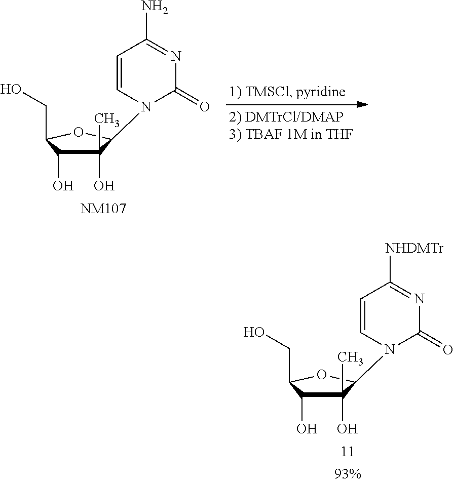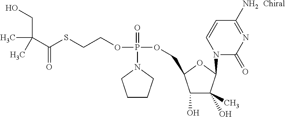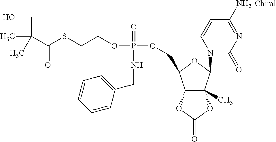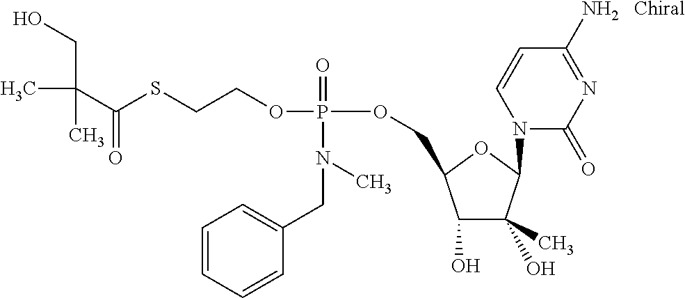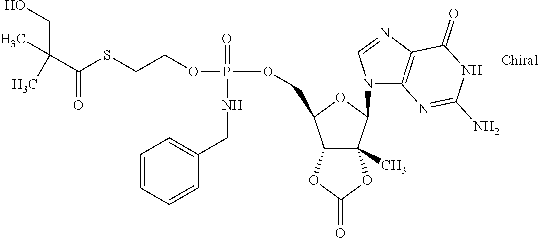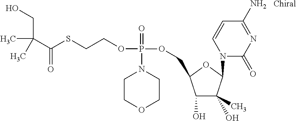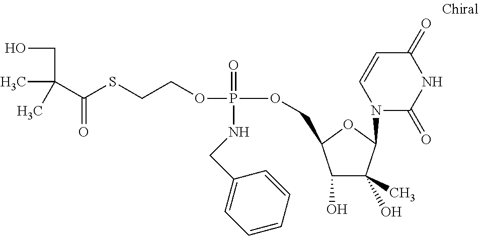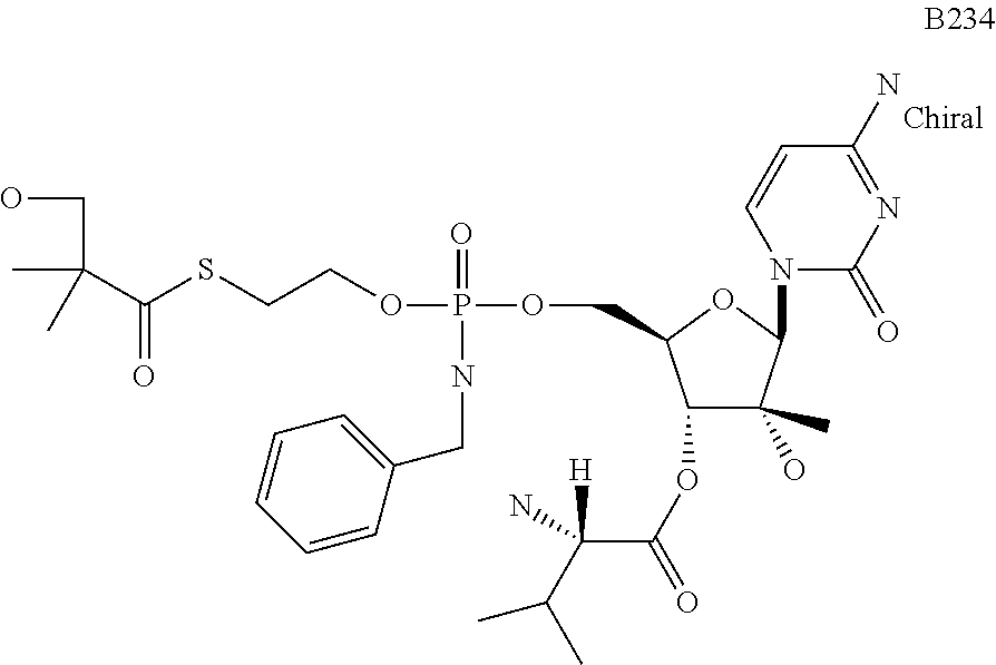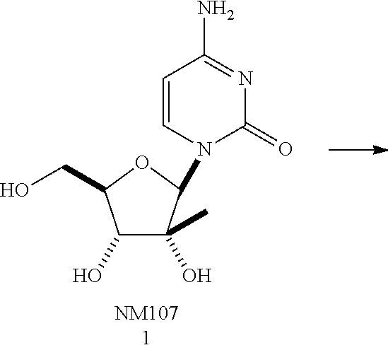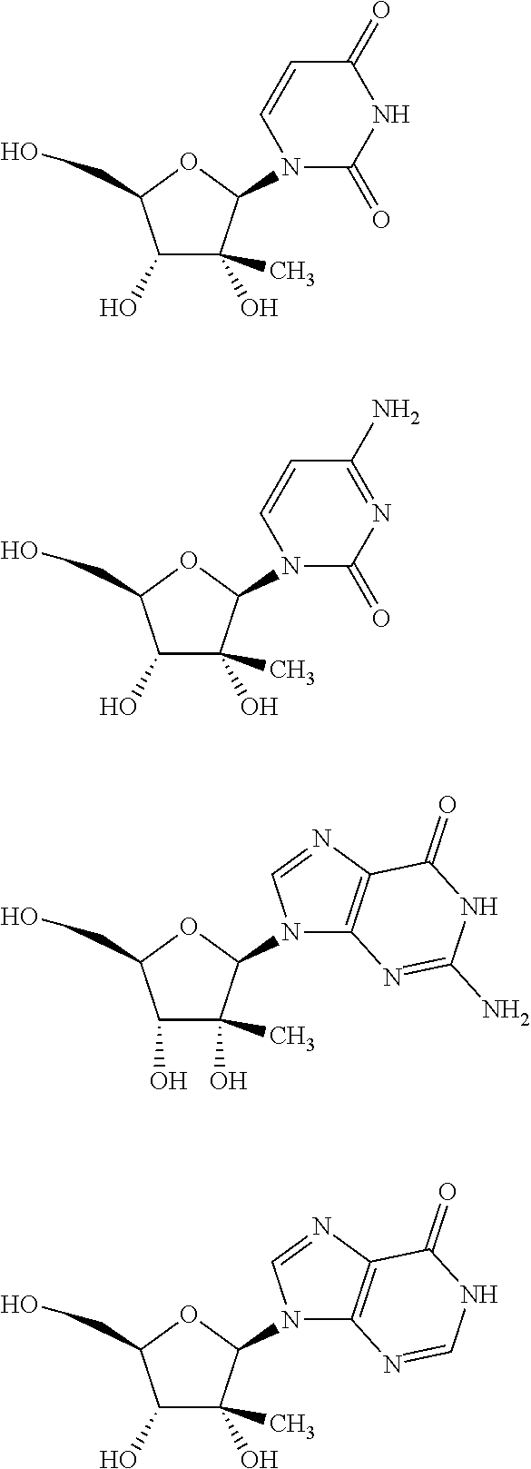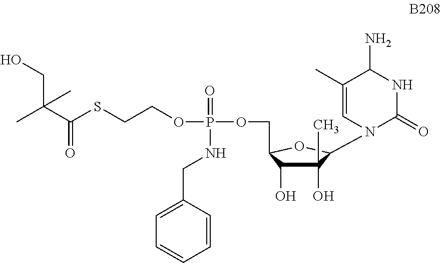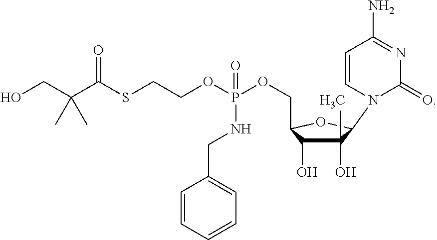 HCV ELISA 2 Compound Reference Structure EC50(μM) CC50(μM) NUCLEOSIDE PARENT: A634 (NM107) ++ + EXAMPLE 2: B102 ++ + EXAMPLE 26: B187 ++ + EXAMPLE 27: B399 ++ + EXAMPLE 28: B204 ++ + EXAMPLE 29: B244 + + EXAMPLE 30: B308 ++ + EXAMPLE 31: B353 + + EXAMPLE 32: B354 ++ + EXAMPLE 33: B391 + + EXAMPLE 34: B395 ++ + EXAMPLE 24: B234 ++ + EXAMPLE 23: B302 ++ + EXAMPLE 22: B390 + + EXAMPLE 25: B183 + + NUCLEOSIDE PARENT: A844 (NM108) ++ + EXAMPLE 3: B299 +++ + EXAMPLE 11: B242 +++ + EXAMPLE 10: B307 +++ + NUCLEOSIDE PARENT: A374 (NM80) +++ ++ EXAMPLE 6: B263 ++ + NUCLEOSIDE PARENT: C809 (NM106) + + EXAMPLE 7: B229 ++ + NUCLEOSIDE PARENT: A608 + + EXAMPLE 8: B186 ++ + NUCLEOSIDE PARENT: A849 +++ + EXAMPLE 9: B396 +++ ++ NUCLEOSIDE PARENT: D961 + + EXAMPLE 12: B503 ++ + NUCLEOSIDE PARENT: E810 +++ + EXAMPLE 18: B436 ++ + EC50in ELISA 2 assay is provided as follows: +++ ≦1 μm, ++ >1-10 μm and + >10 μm CC50is provided as follows: ++ ≦75 μm, + >75 μm Example 40