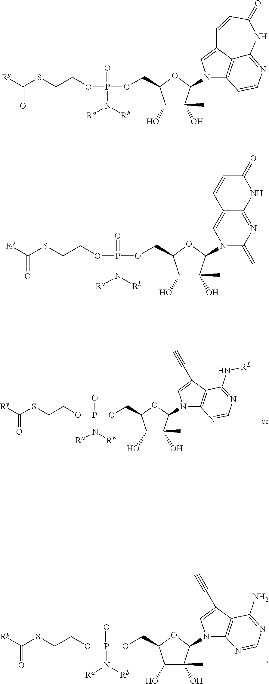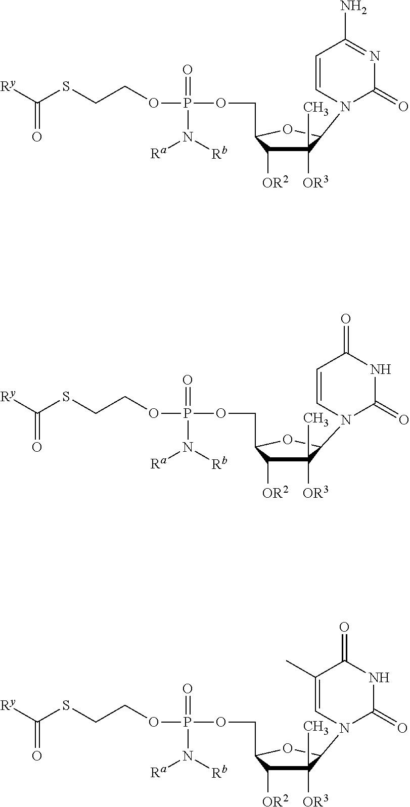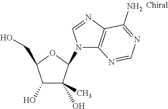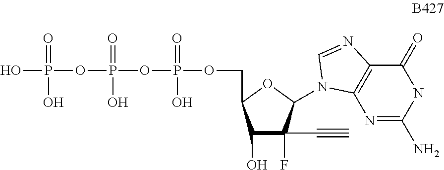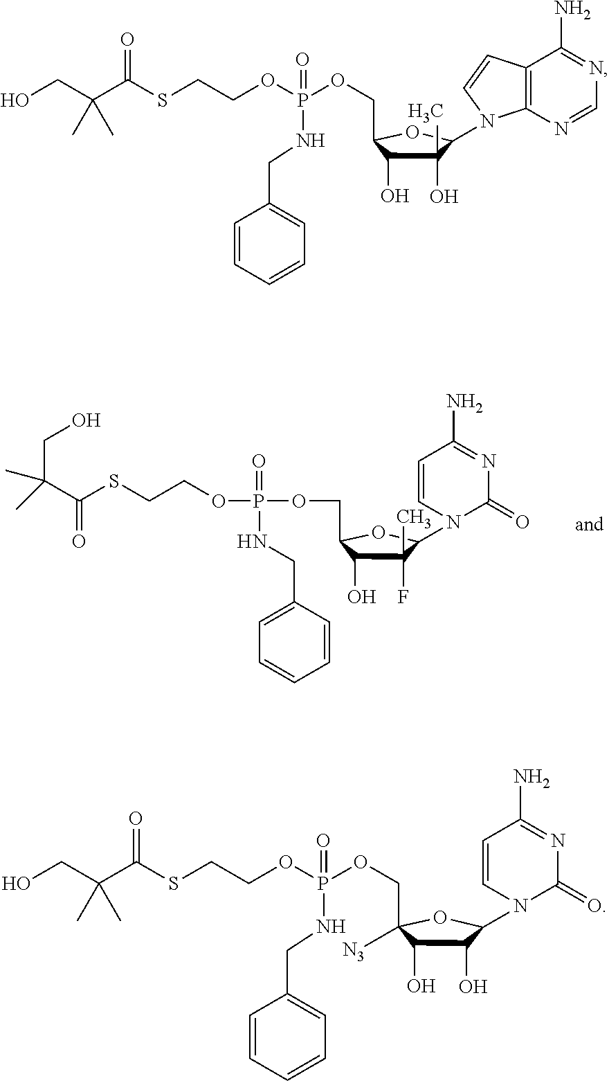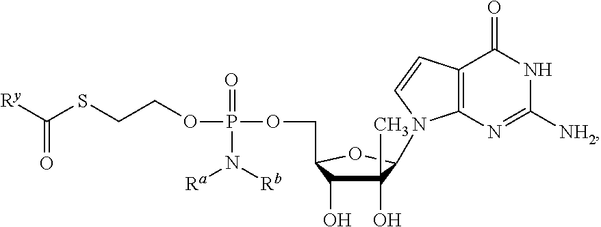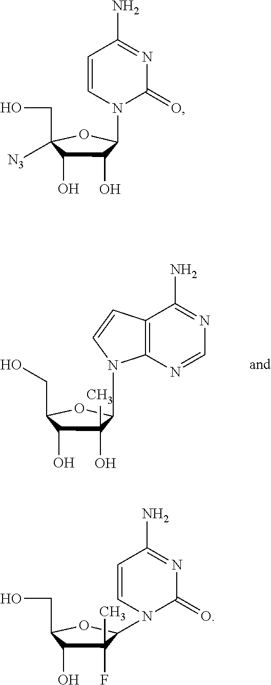 HCV ELISA 2 Compound Reference Structure EC50(μM) CC50(μM) NUCLEOSIDE PARENT: A634 (NM107) ++ + EXAMPLE 2: B102 ++ + EXAMPLE 26: B187 ++ + EXAMPLE 27: B399 ++ + EXAMPLE 28: B204 ++ + EXAMPLE 29: B244 + + EXAMPLE 30: B308 ++ + EXAMPLE 31: B353 + + EXAMPLE 32: B354 ++ + EXAMPLE 33: B391 + + EXAMPLE 34: B395 ++ + EXAMPLE 24: B234 ++ + EXAMPLE 23: B302 ++ + EXAMPLE 22: B390 + + EXAMPLE 25: B183 + + NUCLEOSIDE PARENT: A844 (NM108) ++ + EXAMPLE 3: B299 +++ + EXAMPLE 11: B242 +++ + EXAMPLE 10: B307 +++ + NUCLEOSIDE PARENT: A374 (NM80) +++ ++ EXAMPLE 6: B263 ++ + NUCLEOSIDE PARENT: C809 (NM106) + + EXAMPLE 7: B229 ++ + NUCLEOSIDE PARENT: A608 + + EXAMPLE 8: B186 ++ + NUCLEOSIDE PARENT: A849 +++ + EXAMPLE 9: B396 +++ ++ NUCLEOSIDE PARENT: D961 + + EXAMPLE 12: B503 ++ + NUCLEOSIDE PARENT: E810 +++ + EXAMPLE 18: B436 ++ + EC50in ELISA 2 assay is provided as follows: +++ ≦1 μm, ++ >1-10 μm and + >10 μm CC50is provided as follows: ++ ≦75 μm, + >75 μm Example 40