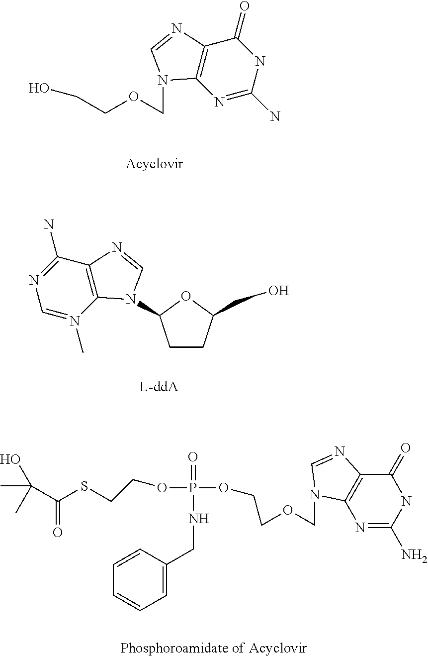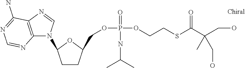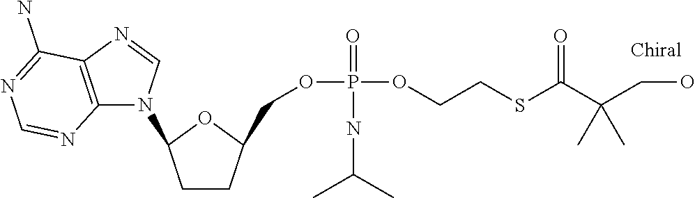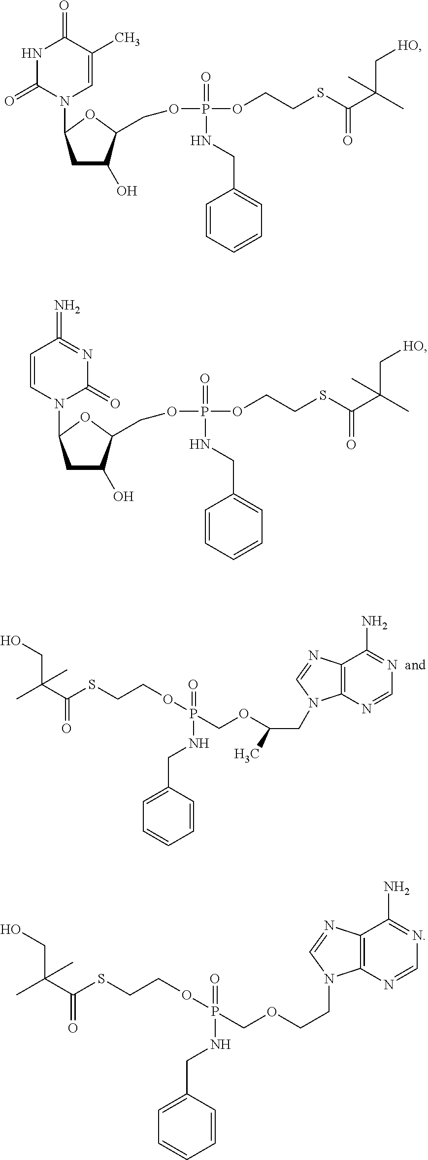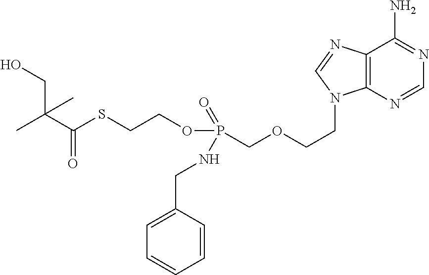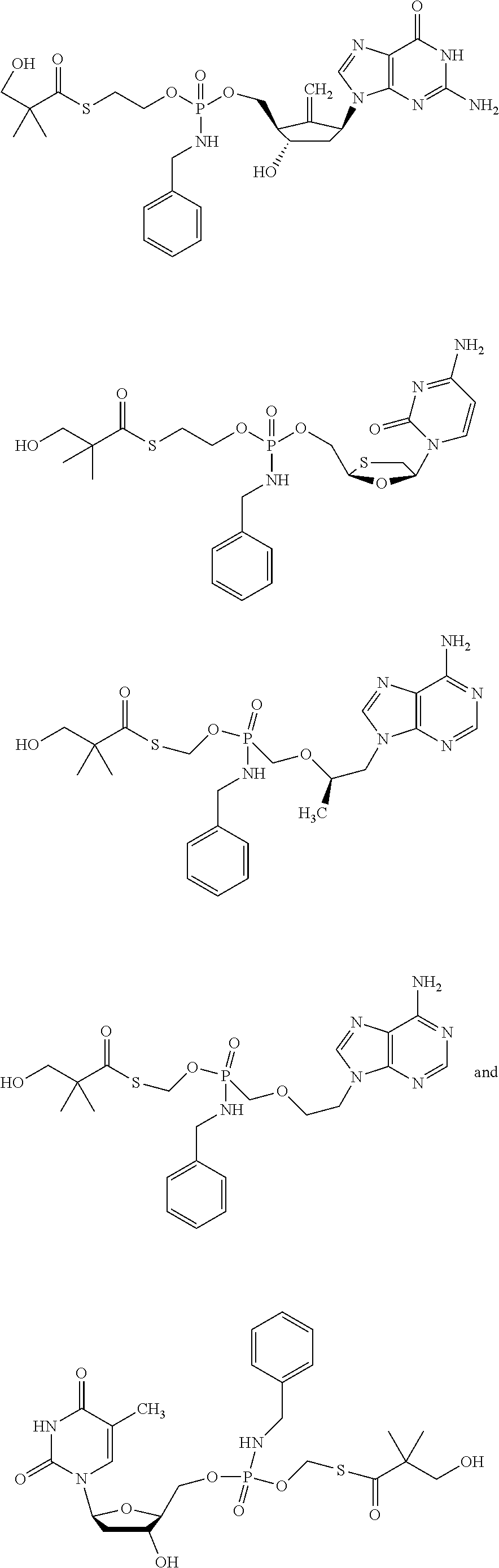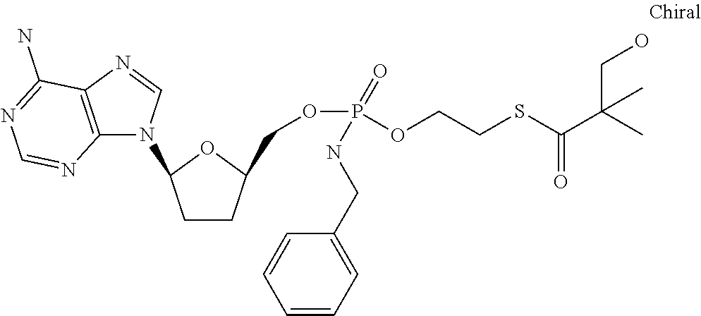 The antiviral in vitro activity of PMEA, B261 (hydroxy-tBuSATE N-benzylphosphoramidate derivative of PMEA as shown in Example 10 Table) along with LdT as control was tested in a total of 4 HBV drug susceptibility assays. The table below provides the results: NADPH Incubations. Microsomal or S9 incubations were conducted in a final volume of 0.5 mL. Pooled liver microsomal or S9 protein (1.0 mg/mL), suspended in incubation buffer (100 mM potassium phosphate, pH 7.4, 5 mM MgCl2, and 0.1 mM EDTA) was preincubated for 5 min at 37° C. with 10-50 μM OHSATE phosphoramidate compound from a stock solution in DMSO (final DMSO concentration was 0.1%); the reaction was initiated by the addition of NADPH (3 mM final concentration). Incubations with no NADPH served as controls. At specific times (0-120 min), 0.1 mL samples were taken and the reaction terminated by the addition of 1 volume of stop solution (acetonitrile). The samples were vortex for 30 sec and then centrifuged at 1500 g for 10 min. The supernatant was transferred to HPLC glass vials and analyzed without further processing by HPLC. Thus, without being limited to any theory, since the metabolism is NADPH dependent, it is possible that the phosphoroamidate compound is preferentially activated by Cytochrome P450 in the liver. Preparation of Primary Hepatocyte Cultures Freshly isolated cells from animal and human liver were obtained in suspension on ice. Following receipt, cells were pelleted by centrifugation at 500 rpm (rat) or 700 rpm (monkey and human) and resuspended at 0.8 million cells per mL of platting medium (HPM). Multi-well collagen-coated plates (12-well) were then seeded by addition of 1 mL of cell suspension (0.8 million cells/mL). The plates were gently shaken to evenly distribute the cells and placed in an incubator at 37° C. for approximately 4 to 6 hours to allow cells to attach. Once cells have attached, the platting medium was removed and replaced with hepatocyte culture medium (HCM). Cells were left overnight in an incubator at 37° C. to acclimatize to culture and the medium. Incubations with Test Article Hepatocyte incubations were conducted in a final volume of 1.0 mL HCM/well (0.8 million cells/mL). HCM from overnight incubation of cells was removed and replaced with fresh HCM, pre-warmed to 37° C., containing 10 μl M test article from a stock solution in DMSO (final DMSO concentration was 0.1%). At specific times (up to 24 hrs), incubation medium was discarded and the cell monolayers were carefully washed two times with ice-cold PBS. Following the last wash, all PBS was carefully removed and 1 mL of extraction buffer (ice-cold 70% methanol) was added. Each well was sealed with parafilm immediately following addition of methanol. Once the entire plate was processed, additional parafilm was placed on entire plate forming a double seal to prevent evaporation during the extraction process. The cover lid was then placed on the plate and sealed with tape. The plates were then stored at −20° C. for a minimum of 24 hrs to allow for extraction of intracellular contents. Preparation of Huh7 or HepG2 Cultures HepG2s or Huh7 cells were plated at 0.4×106cells/well in collagen-coated 12-well plates. Cells were allowed to attach overnight. Culture medium from overnight incubation of cells was removed and replaced with fresh culture medium, pre-warmed to 37° C., containing 10 μM test article from a stock solution in DMSO (final DMSO concentration was 0.1%). After 24-72 hours, incubation medium was discarded and the cell monolayers were carefully washed two times with ice-cold PBS. Following the last wash, all PBS was carefully removed and 1 mL of extraction buffer (ice-cold 70% methanol) was added. Each well was sealed with parafilm immediately following addition of methanol. Once the entire plate was processed, additional parafilm was placed on entire plate forming a double seal to prevent evaporation during the extraction process. The cover lid was then placed on the plate and sealed with tape. The plates were then stored at −20° C. for a minimum of 24 hrs to allow for extraction of intracellular contents. Sample Preparation for Analysis Cellular extracts were prepared by transferring 0.9 mL of extract into 2 mL microfuge tubes followed by centrifugation for 5 min at 14,000 rpm. Approximately 100 μL of the supernatant was transferred to HPLC vials and triphosphate levels determined by LCMS/MS as described below. HPLC Conditions: NM107-Triphosphate Exemplary HPLC Conditions: NM108-Triphosphate NM 107 triphosphate and B102 triphosphate levels in cell extracts were observed as follows: As seen from the data levels of intracellular triphosphate for B102 were higher compared to those for NM107. Nucleoside analogs such as NM107 (2′ methyl cytidine, valopicitabine nucleoside component) have shown efficacy against HCV in the clinical setting and their 5′-triphosphates (TP) can be potent inhibitors of HCV NS5B polymerase. However, their wide systemic distribution and inefficient hepatic conversion to TP may lead to reduced safety and antiviral activity. The in vivo preclinical safety and antiviral activity of the nucleotide prodrugs, B102 were assessed. Methods: For pharmacokinetic (PK) and toxicology studies, B102 were orally administered to rats or monkeys at doses from 20 to 300 mg/kg/day up to 14 days. Hepatic nucleoside TP levels were determined by LC-MS/MS. Compounds (10 mg/kg/day) were administered once daily by oral gavage for 4 days in chimpanzees chronically infected with HCV genotype 1. HCV viral loads were monitored before, during and after treatment by quantitative RT-PCR. Results: PK studies in rat and monkey revealed that B102 and has a first-pass hepatic extraction of >95% with low systemic exposure (<1%). Hepatic TP levels were 10-50-fold higher with nucleotide prodrugs versus a nucleoside counterpart. No toxicity was observed after administration of 50 mg/kg/day of A2 to monkeys for 14 days. No initi