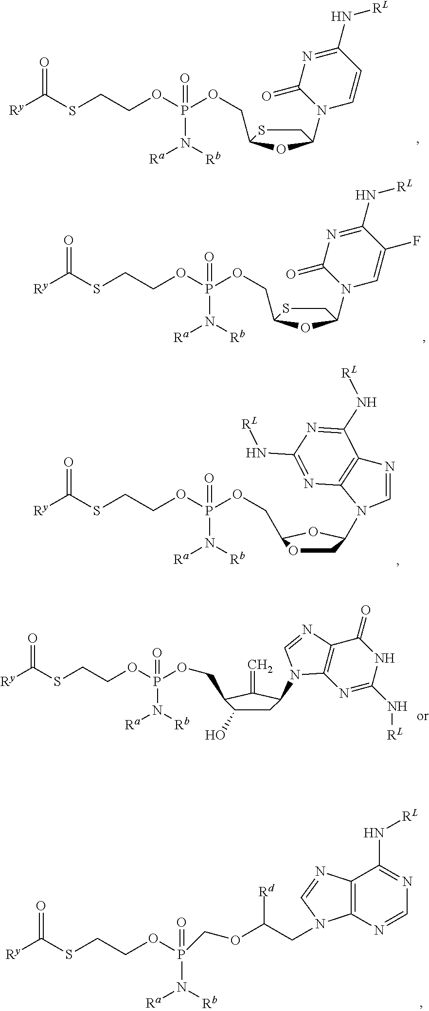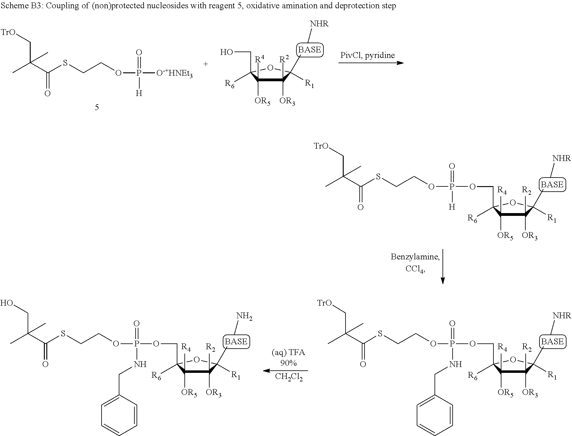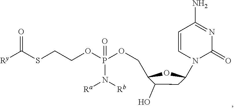 In some embodiments, compositions of phosphonoamidate or phosphoramidate compounds are provided that are substantially free of a designated enantiomer of that nucleoside. In a preferred embodiment, in the methods and compounds of this invention, the compounds are substantially free of enantiomers. In some embodiments, the composition includes that includes a compound that is at least 85, 90%, 95%, 98%, 99% to 100% by weight, of the compound, the remainder comprising other chemical species or enantiomers. Preparation of Compounds The compounds provided herein can be prepared, isolated or obtained by any method apparent to those of skill in the art. Exemplary methods of preparation are described in detail in the examples below. In certain embodiments, compounds provided herein can be prepared by coupling alcohols and H-phosphonate monoesters as illustrated in the reaction scheme below: any reactive function on Ry, R7, R8, R9, R10or on the base may be protected during the coupling reaction. A variety of coupling agents known to one of skill in the art can be used. Exemplary coupling agents for use in the reaction include, but are not limited to HOBt (N-Hydroxybenzotriazole), HBTU (2-(1H-Benzotriazole-1-yl)-1,1,3,3-tetramethylaminium hexafluorophosphate), DCC(N,N′-dicyclohexylcarbodiimide), BOP (Benzotriazole-1-yl-oxy-tris-(dimethylamino)-phosphoniurnhexafluorophosphate), PyBOP (1H-benzotriazol-1-yloxytripyrrolidinophosphonium hexafluorophosphate) and others known to one of skill in the art. A general scheme for the synthesis of hydroxytBuSATE N-benzylphosphoramidate nucleoside derivatives represented by B is provided in Schemes B1-B3 below. where R═H, Tr, MMTr or DMTr in case of reactive amine; R1, R2, R4, R6═H, alkyl or halo and R3/R5are both H or isopropylidene. In addition, certain nucleosides and analogs thereof and prodrugs thereof can be prepared according to methods described in U.S. Pat. Nos. 6,812,219; 7,105,493; 7,101,861; 6,914,054; 6,555,676; 7,202,224; 7,105,499; 6,777,395; 6,914,054; 7,192,936; US publication Nos. 2005203243; 2007087960; 2007060541; 2007060505; 2007060504; 2007060503; 2007060498; 2007042991; 2007042990; 2007042940; 2007042939 and 2007037735; International Publication Nos. WO 04/003000; WO 04/022999; WO 04/002422; WO 01/90121 and WO 01/92282. Other patents/patent applications disclosing nucleoside analogs to treat hepatitis C virus that can be derivatized as described herein include: PCT/CA00/01316 (WO 01/32153; filed Nov. 3, 2000) and PCT/CA01/00197 (WO 01/60315; filed Feb. 19, 2001) filed by BioChem Pharma, Inc. (now Shire Biochem, Inc.); PCT/US02/01531 (WO 02/057425; filed Jan. 18, 2002); PCT/US02/03086 (WO 02/057287; filed Jan. 18, 2002); U.S. Pat. No. 7,202,224; U.S. Pat. No. 7,125,855; U.S. Pat. No. 7,105,499 and U.S. Pat. No. 6,777,395 by Merck & Co., Inc.; PCT/EP01/09633 (WO 02/18404; published Aug. 21, 2001); US 2006/0040890; 2005/0038240; 2004/0121980; U.S. Pat. Nos. 6,846,810; 6,784,166 and 6,660,721 by Roche; PCT Publication Nos. WO 01/79246 (filed Apr. 13, 2001), WO 02/32920 (filed Oct. 18, 2001) and WO 02/48165; US 2005/0009737 and US 2005/0009737; U.S. Pat. Nos. 7,094,770 and 6,927,291 by Pharmasset, Ltd. Contents of these references are hereby incorporated by reference in their entireties. Assay Methods Compounds can be assayed for HBV activity according to any assay known to those of skill in the art. Compounds can be assayed for HCV activity according to any assay known to those of skill in the art. Further, compounds can be assayed for accumulation in liver cells of a subject according to any assay known to those of skill in the art. In certain embodiments, a compound can be administered to the subject, and a liver cell of the subject can be assayed for the compound or a derivative thereof, e.g. a nucleoside, nucleoside phosphate or nucleoside triphosphate derivative thereof. In one embodiment, a phosphoramidate or phosphonoamidate nucleoside compound is administered to cells, such as liver cells, in vivo or in vitro, and the nucleoside triphosphate levels delivered intracellularly are measured, to indicate delivery of the compound and triphosphorylation in the cell. The levels of intracellular nucleoside triphosphate can be measured using analytical techniques known in the art. Methods of detecting ddATP are described herein below by way of example, but other nucleoside triphosphates can be readily detected using the appropriate controls, calibration samples and assay techniques. In one embodiment, ddATP concentrations are measured in a sample by comparison to calibration standards made from control samples. The ddATP concentrations in a sample can be measured using an analytical method such as HPLC LC MS. In one embodiment, a test sample is compared to a calibration curve created with known concentrations of ddATP to thereby obtain the concentration of that sample. In one embodiment, the samples are manipulated to remove impurities such as salts (Na+, K+, etc.) before analysis. In one embodiment, the lower limit of quantitation is about ˜0.2 pmol/mL for hepatocyte cellular extracts particularly where reduced salt is present. In one embodiment, the method allows successfully measuring triphosphate nucleotides formed at levels of 1-10,000 pmol per million cells in e.g. cultured hepatocytes and HepG2 cells. Methods of Use The phosphoramidate and phosphonoamidate compounds of a variety of therapeutic agents can be formed using methods available in the art and those disclosed herein. Such compounds can be used in some embodiments to enhance delivery of the drug to the liver. In one embodiment, the compound comprises a S-acyl-2-thioethyl phosphoramidate or S-acyl-2-thioethyl phosphonoamidate, e.g., a S-pivaloyl-2-thioethyl phosphoramidate or S-hydroxypivaloyl-2-thioethyl phosphonoamidate derivative. Therapeutic agents that can be derivatized to phosphoramidate or phosphonoamidate compound form include any anti-viral agent that includes, or