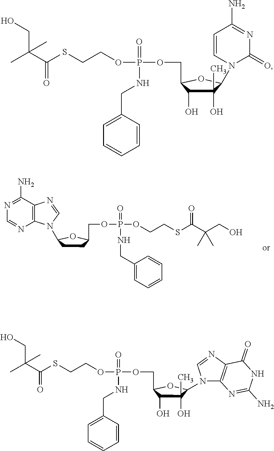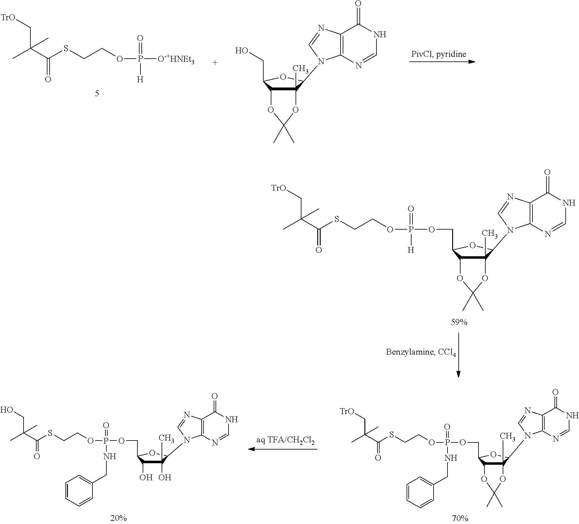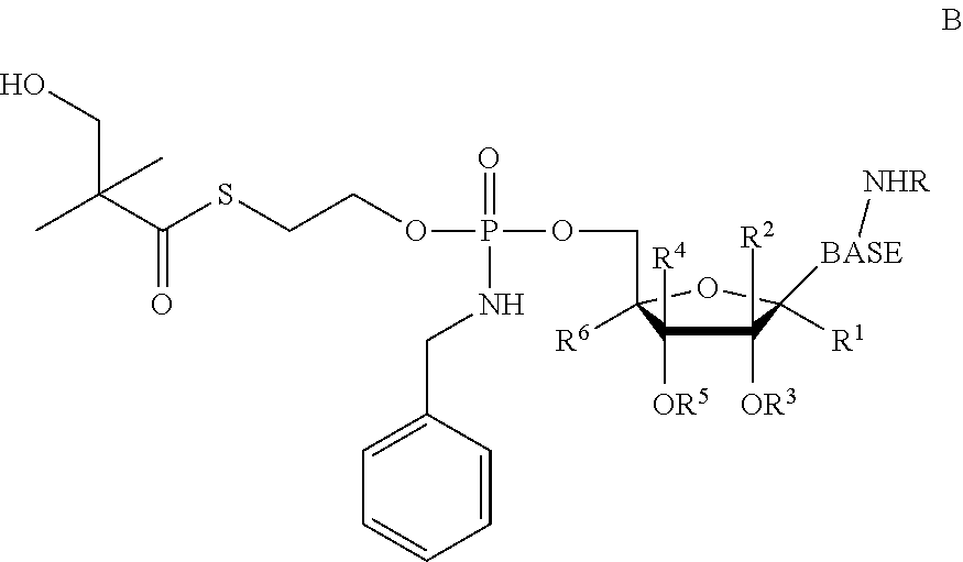 B102: C24H35N4O9PS 586.59 gmoF−1 HPLC AUC (Method Test 20): 98.9%@254 nm, Rt 3.34 min m/z (ESI+): 587.12 [M+H]+100%; 1173.62 [2M+H]+80% vmax(KBr disc) (cm−1): 3343.1 br (O—H, N—H); 1647.2 br (C═O base, thioester) KF: 2.02% H2O content Specific Rotation: [α]D20+55.011 (c. 10.492 mg cm−3in DMSO) Elemental analysis: Calculated: C, 49.14%; H, 6.01%; N, 9.55%; S, 5.47%; P, 5.28%; Found: C, 48.74%; H, 5.83%; N, 9.41%; S, 5.81%; P, 5.33%. NMR: Analyzed using1H,13C,31P, COSY, DEPT, HSQC and HMBC experiments.114 NMR δH(400 MHz, d6-DMSO): 0.94 (3H, d, J=1.8 Hz, CH3), 1.11 (6H, s, (CH3)2C), 3.04 (2H, m, J=6.4 Hz, CH2S), 3.44 (2H, d, J=5.0 Hz, CH2OH), 3.60 (1H, br-m, H-3′), 3.82-4.01 (5H, m, H-4′, CH2O, CH2Ph), 4.07-4.12 (1H, m, H-5′), 4.13-4.24 (1H, m, H-5″), 4.94 (1H, t, J 5.0 Hz, CH2OH), 5.07 (1H, d, J 1.8 Hz, OH-2′), 5.26 (1H, t, J 6.8 Hz, OH-3′), 5.64-5.76 (1H, m, P—N—H), 5.69, 5.70 (1H, 2×d, 2×J 7.6 Hz, H-5), 5.93 (1H, br-s, H-1′), 7.13-7.20 (2H, 2×br-s, NH2), 7.20-7.25 (1H, m, Ar—H), 7.28-7.35 (4H, m, 4×Ar—H), 7.53, 7.57 (1H, 2×d, J 7.6 Hz, H-6) 13C NMR δC(100 MHz, d6-DMSO): 19.81 (CH3), 21.79 (C(CH3)2), 28.17, 28.24 (CH2S), 44.18 (PhCH2), 51.62 (C(CH3)2), 63.74, 63.79 (CH2O), 64.21, 64.51 (C-5′), 68.29 (CH2OH), 72.41, 72.57 (C-3′), 77.80, 77.85 (C-2′), 79.47, (C-4′), 91.66, (C-1′), 93.82 (C-5), 126.68, 127.09, 128.08, 128.09 (5×Ar—C), 140.34, 140.38, 140.40 (Ar—Cipso, C-6), 155.12, 165.21 (C-2, C-4), 203.85 (C═OS)31P NMR δP(162 MHz, d6-DMSO): 9.71, 9.91 (1P, 2×s, ratio 1.00:1.07) Synthetic Procedure A can be used for synthesizing nucleoside prodrugs such as B 102. Protection of the 2′ and 3′ hydroxyl groups as well as the amino group that may be present on the nucleoside base is preferred. In Strategy A, the 2′ and 3′ hydroxyl groups are protected, e.g., as the acetonide derivative and the amino group is protected, e.g., as the di-methoxytrityl derivative. Hydrolysis of the acteonide after the coupling of the nucleoside with the SATE intermediate is carried out using an acid such as TFA. This hydrolysis procedure can potentially produce by-products and give low yields, and the di-methoxytrityl chloride is disadvantageously expensive. Synthetic Procedure B, below, can overcome the such difficulties. An acid, such as a boronic acid, such as phenyl boronic acid is used to protect the 2′ and 3′ hydroxyl groups on the sugar moiety. Coupling the nucleoside phenyl boronate derivative with the SATE intermediate can give good yield, and the phenyl boronate deprotection conveniently takes place during the work-up of the reaction mixture, on washing with an acid such as an aqueous citric acid solution. The final removal of a protecting group such as a trityl group (on the Sate moiety) is mildly carried out using an organic solvent system, such as an acetyl chloride/ethanol mixture. This deprotection reaction can be consistently reproducible, scalable and gave significantly high yield. 2′-C-methylguanosine (NM108) (3 g, 10.10 mmol) and compound 5 [for the synthesis of 5 See Example 2] (6.48 g, 11.10 mmol) were coevaporated together with anhydrous pyridine and dissolved in this solvent (152 mL). Pivaloyl chloride (2.48 mL, 20.18 mmol) was added dropwise at −15° C. and the solution was stirred at the same temperature for 2 h. The reaction mixture was diluted with methylene chloride and neutralized with an aqueous solution of ammonium chloride (NH4Cl 0.5M). After extraction with methylene chloride/aq NH4Cl 0.5M, the organic phases were combined, dried over Na2SO4evaporated under reduce pressure (bath temperature not exceeding 30° C.) and coevaporated twice with toluene. The crude mixture was purified on silica gel flash column chromatography (eluant: stepwise gradient [0-10%] of methanol in methylene chloride+0.2% acetic acid) to afford the desired product 6 (2.5 g, 32%). Rf=0.34 (15% MeOH in CH2Cl2);1H-NMR (400 MHz, DMSO-d60.80 (s, 3H, CH3), 1.13 (s, 6H, 2×CH3), 3.04 (m, 2H, CH2OTr), 3.14 (m, 2H, CH2S), 3.97-4.08 (m, 4H, H-3′, H-4′, CH2OP), 4.28-4.38 (m, 2H, H-5′, H-5″), 5.10-5.35 (m, 2H, OH-2′, OH-3′, D2O exchangeable), 5.77 (s, 1H, H-1′), 6.52 (bs, 2H, NH2, D2O exchangeable), 7.11-7.42 (m, 15H, Tr), 7.75 (s, 1H, H-8), 10.67 (bs, 1H, NH, D2O exchangeable);13P-NMR (161 MHz, DMSO-d6) 9.47, 9.20; LC/MS Scan ES+ 764 (M+H)+, Scan ES− 762 (M−H)−. To a solution of compound 6 (2.5 g, 3.27 mmol) in anhydrous carbon tetrachloride (33 mL) was added dropwise benzylamine (5 eq, 1.79 mL). The reaction mixture was stirred at room temperature for 1 h and evaporated under reduced pressure (bath temperature not exceeding 30° C.). The crude mixture was purified on silica gel flash column chromatography (eluant: stepwise gradient [0-10%] of methanol in methylene chloride) to give compound 7 as a white foam (2.9 g, quantitative yield). Rf=0.27 (10% MeOH in methylene chloride);1H-NMR (400 MHz, DMSO-d6) 0.81 (s, 3H, CH3), 1.10 (s, 6H, 2×CH3), 2.99-3.08 (m, 4H, CH2OTr, CH2S), 3.87-4.30 (m, 8H, H-3′, H-4′, H-5′, H-5″ CH2OP, NCH2Ph), 5.66 (m, 1H, NH, D2O exchangeable), 5.76 (s, 1H, H-1′), 6.60 (bs, 2H, NH2, D2O exchangeable), 7.17-7.39 (m, 20H, Tr, C6H5CH2), 7.77 (s, 1H, H-8);13P-NMR (161 MHz, DMSO-d6) 9.93, 9.78; LC/MS Scan ES+ 869 (M+H)+, Scan ES− 867 (M−H)−. Compound 7 (2.84 g, 3.27 mmol) was dissolved in a mixture of trifluoroacetic acid (1.1 mL) and methylene chloride (11.4 mL). The reaction mixture was stirred 0.5 h at room temperature. The solution was diluted with ethanol, evaporated under reduce pressure (bath temperature not exceeding 30° C.) and coevaporated twice with toluene. The crude mixture was purified on silica gel flash column chromatography (eluant: stepwise gradient [0-30%] of methanol in methylene chloride) and then, on reverse phase column chromatography (eluant: stepwise gradient [0-100%] of acetonitrile in water) to give the desired product 8 (B299) (1:1 mixture of diastereoisomers accord