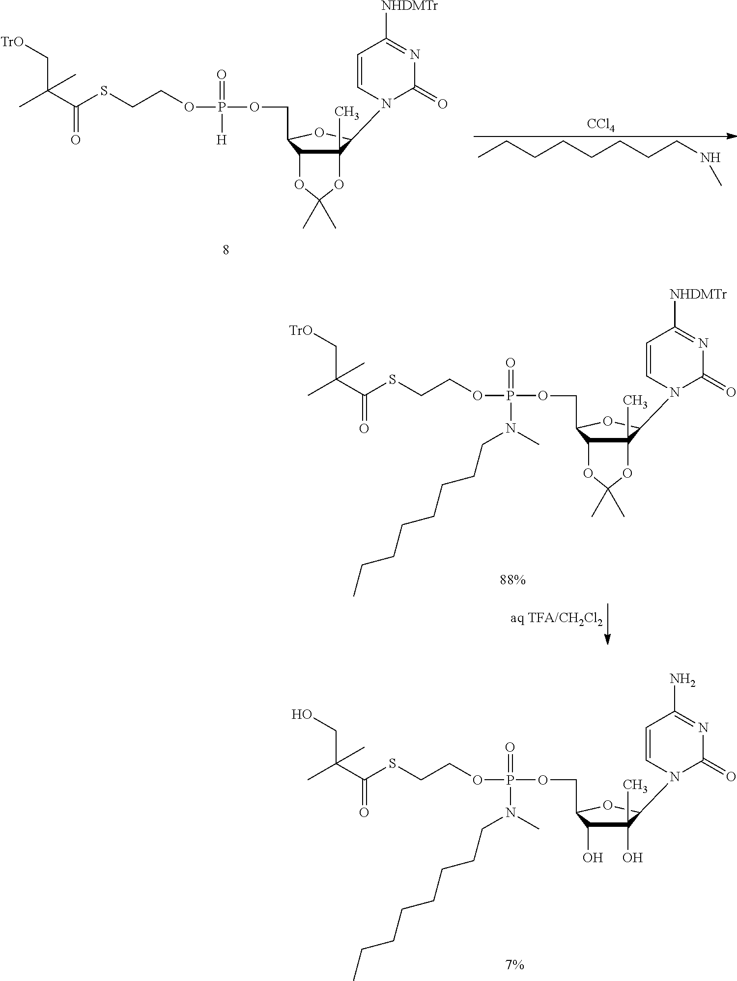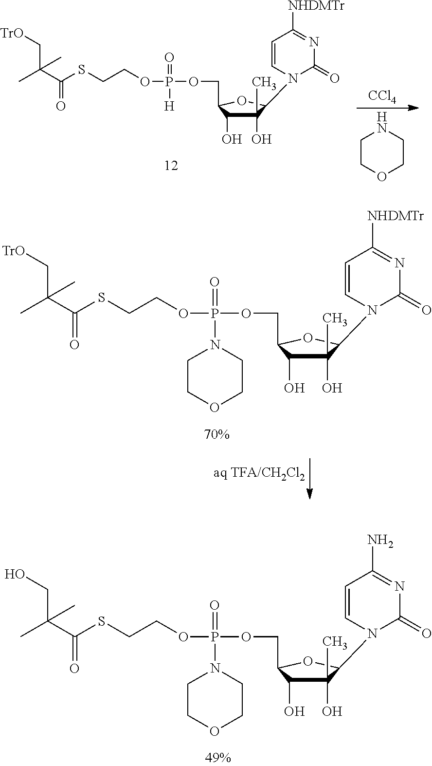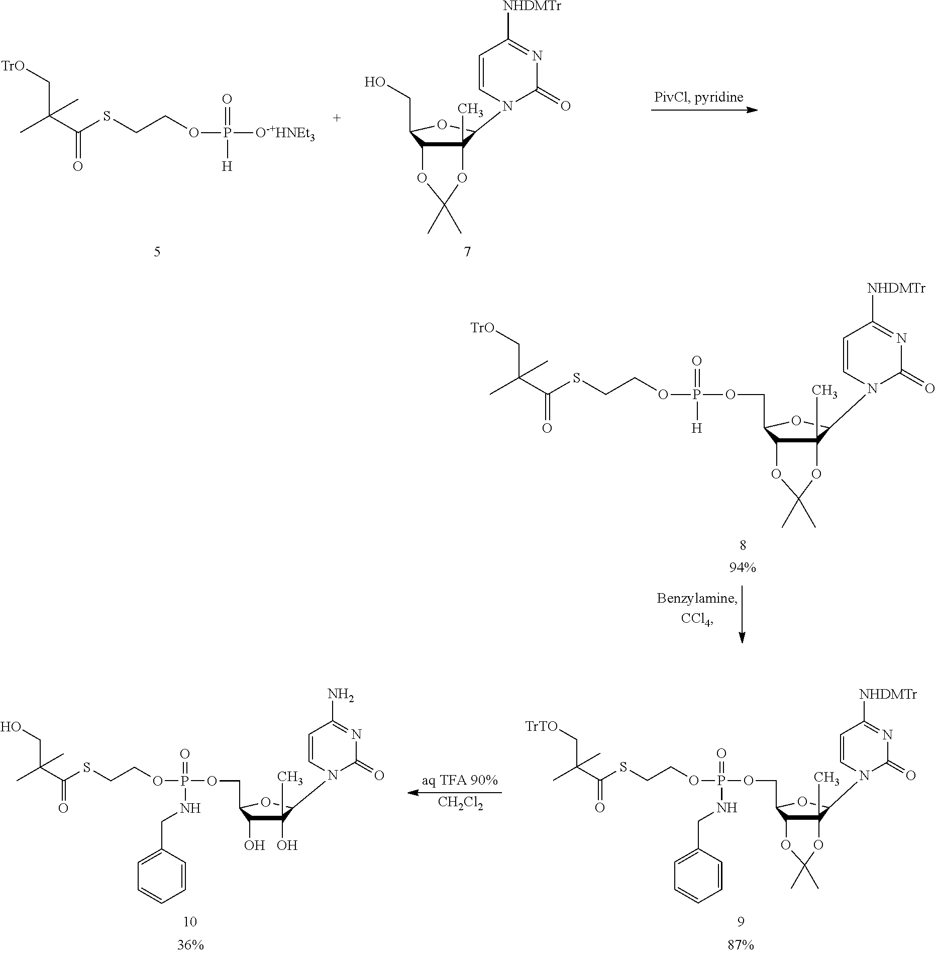 B102: C24H35N4O9PS 586.59 gmoF−1 HPLC AUC (Method Test 20): 98.9%@254 nm, Rt 3.34 min m/z (ESI+): 587.12 [M+H]+100%; 1173.62 [2M+H]+80% vmax(KBr disc) (cm−1): 3343.1 br (O—H, N—H); 1647.2 br (C═O base, thioester) KF: 2.02% H2O content Specific Rotation: [α]D20+55.011 (c. 10.492 mg cm−3in DMSO) Elemental analysis: Calculated: C, 49.14%; H, 6.01%; N, 9.55%; S, 5.47%; P, 5.28%; Found: C, 48.74%; H, 5.83%; N, 9.41%; S, 5.81%; P, 5.33%. NMR: Analyzed using1H,13C,31P, COSY, DEPT, HSQC and HMBC experiments.114 NMR δH(400 MHz, d6-DMSO): 0.94 (3H, d, J=1.8 Hz, CH3), 1.11 (6H, s, (CH3)2C), 3.04 (2H, m, J=6.4 Hz, CH2S), 3.44 (2H, d, J=5.0 Hz, CH2OH), 3.60 (1H, br-m, H-3′), 3.82-4.01 (5H, m, H-4′, CH2O, CH2Ph), 4.07-4.12 (1H, m, H-5′), 4.13-4.24 (1H, m, H-5″), 4.94 (1H, t, J 5.0 Hz, CH2OH), 5.07 (1H, d, J 1.8 Hz, OH-2′), 5.26 (1H, t, J 6.8 Hz, OH-3′), 5.64-5.76 (1H, m, P—N—H), 5.69, 5.70 (1H, 2×d, 2×J 7.6 Hz, H-5), 5.93 (1H, br-s, H-1′), 7.13-7.20 (2H, 2×br-s, NH2), 7.20-7.25 (1H, m, Ar—H), 7.28-7.35 (4H, m, 4×Ar—H), 7.53, 7.57 (1H, 2×d, J 7.6 Hz, H-6) 13C NMR δC(100 MHz, d6-DMSO): 19.81 (CH3), 21.79 (C(CH3)2), 28.17, 28.24 (CH2S), 44.18 (PhCH2), 51.62 (C(CH3)2), 63.74, 63.79 (CH2O), 64.21, 64.51 (C-5′), 68.29 (CH2OH), 72.41, 72.57 (C-3′), 77.80, 77.85 (C-2′), 79.47, (C-4′), 91.66, (C-1′), 93.82 (C-5), 126.68, 127.09, 128.08, 128.09 (5×Ar—C), 140.34, 140.38, 140.40 (Ar—Cipso, C-6), 155.12, 165.21 (C-2, C-4), 203.85 (C═OS)31P NMR δP(162 MHz, d6-DMSO): 9.71, 9.91 (1P, 2×s, ratio 1.00:1.07) Synthetic Procedure A can be used for synthesizing nucleoside prodrugs such as B 102. Protection of the 2′ and 3′ hydroxyl groups as well as the amino group that may be present on the nucleoside base is preferred. In Strategy A, the 2′ and 3′ hydroxyl groups are protected, e.g., as the acetonide derivative and the amino group is protected, e.g., as the di-methoxytrityl derivative. Hydrolysis of the acteonide after the coupling of the nucleoside with the SATE intermediate is carried out using an acid such as TFA. This hydrolysis procedure can potentially produce by-products and give low yields, and the di-methoxytrityl chloride is disadvantageously expensive. Synthetic Procedure B, below, can overcome the such difficulties. An acid, such as a boronic acid, such as phenyl boronic acid is used to protect the 2′ and 3′ hydroxyl groups on the sugar moiety. Coupling the nucleoside phenyl boronate derivative with the SATE intermediate can give good yield, and the phenyl boronate deprotection conveniently takes place during the work-up of the reaction mixture, on washing with an acid such as an aqueous citric acid solution. The final removal of a protecting group such as a trityl group (on the Sate moiety) is mildly carried out using an organic solvent system, such as an acetyl chloride/ethanol mixture. This deprotection reaction can be consistently reproducible, scalable and gave significantly high yield. 2′-C-methylguanosine (NM108) (3 g, 10.10 mmol) and compound 5 [for the synthesis of 5 See Example 2] (6.48 g, 11.10 mmol) were coevaporated together with anhydrous pyridine and dissolved in this solvent (152 mL). Pivaloyl chloride (2.48 mL, 20.18 mmol) was added dropwise at −15° C. and the solution was stirred at the same temperature for 2 h. The reaction mixture was diluted with methylene chloride and neutralized with an aqueous solution of ammonium chloride (NH4Cl 0.5M). After extraction with methylene chloride/aq NH4Cl 0.5M, the organic phases were combined, dried over Na2SO4evaporated under reduce pressure (bath temperature not exceeding 30° C.) and coevaporated twice with toluene. The crude mixture was purified on silica gel flash column chromatography (eluant: stepwise gradient [0-10%] of methanol in methylene chloride+0.2% acetic acid) to afford the desired product 6 (2.5 g, 32%). Rf=0.34 (15% MeOH in CH2Cl2);1H-NMR (400 MHz, DMSO-d60.80 (s, 3H, CH3), 1.13 (s, 6H, 2×CH3), 3.04 (m, 2H, CH2OTr), 3.14 (m, 2H, CH2S), 3.97-4.08 (m, 4H, H-3′, H-4′, CH2OP), 4.28-4.38 (m, 2H, H-5′, H-5″), 5.10-5.35 (m, 2H, OH-2′, OH-3′, D2O exchangeable), 5.77 (s, 1H, H-1′), 6.52 (bs, 2H, NH2, D2O exchangeable), 7.11-7.42 (m, 15H, Tr), 7.75 (s, 1H, H-8), 10.67 (bs, 1H, NH, D2O exchangeable);13P-NMR (161 MHz, DMSO-d6) 9.47, 9.20; LC/MS Scan ES+ 764 (M+H)+, Scan ES− 762 (M−H)−. To a solution of compound 6 (2.5 g, 3.27 mmol) in anhydrous carbon tetrachloride (33 mL) was added dropwise benzylamine (5 eq, 1.79 mL). The reaction mixture was stirred at room temperature for 1 h and evaporated under reduced pressure (bath temperature not exceeding 30° C.). The crude mixture was purified on silica gel flash column chromatography (eluant: stepwise gradient [0-10%] of methanol in methylene chloride) to give compound 7 as a white foam (2.9 g, quantitative yield). Rf=0.27 (10% MeOH in methylene chloride);1H-NMR (400 MHz, DMSO-d6) 0.81 (s, 3H, CH3), 1.10 (s, 6H, 2×CH3), 2.99-3.08 (m, 4H, CH2OTr, CH2S), 3.87-4.30 (m, 8H, H-3′, H-4′, H-5′, H-5″ CH2OP, NCH2Ph), 5.66 (m, 1H, NH, D2O exchangeable), 5.76 (s, 1H, H-1′), 6.60 (bs, 2H, NH2, D2O exchangeable), 7.17-7.39 (m, 20H, Tr, C6H5CH2), 7.77 (s, 1H, H-8);13P-NMR (161 MHz, DMSO-d6) 9.93, 9.78; LC/MS Scan ES+ 869 (M+H)+, Scan ES− 867 (M−H)−. Compound 7 (2.84 g, 3.27 mmol) was dissolved in a mixture of trifluoroacetic acid (1.1 mL) and methylene chloride (11.4 mL). The reaction mixture was stirred 0.5 h at room temperature. The solution was diluted with ethanol, evaporated under reduce pressure (bath temperature not exceeding 30° C.) and coevaporated twice with toluene. The crude mixture was purified on silica gel flash column chromatography (eluant: stepwise gradient [0-30%] of methanol in methylene chloride) and then, on reverse phase column chromatography (eluant: stepwise gradient [0-100%] of acetonitrile in water) to give the desired product 8 (B299) (1:1 mixture of diastereoisomers accord