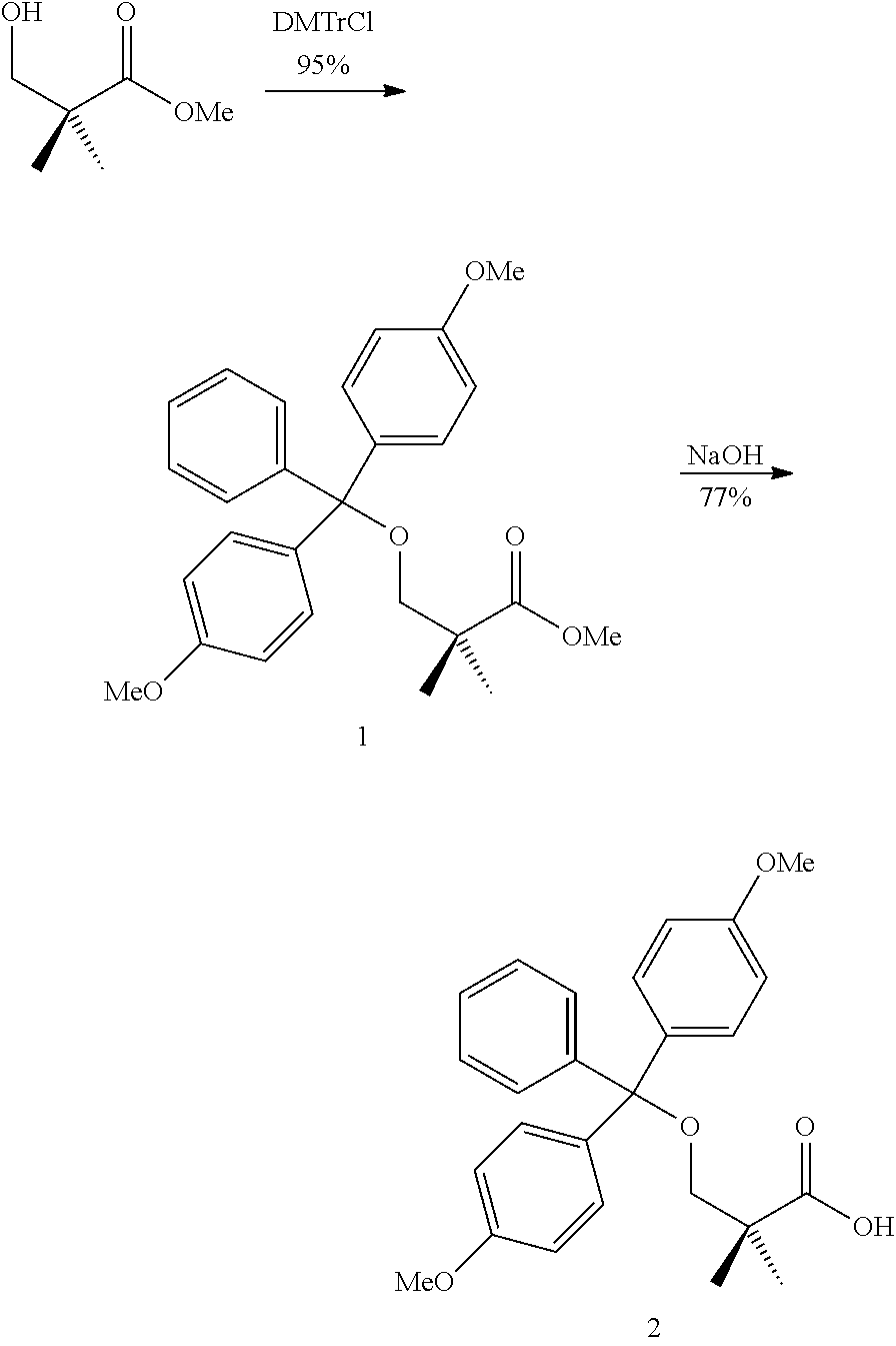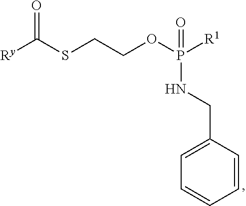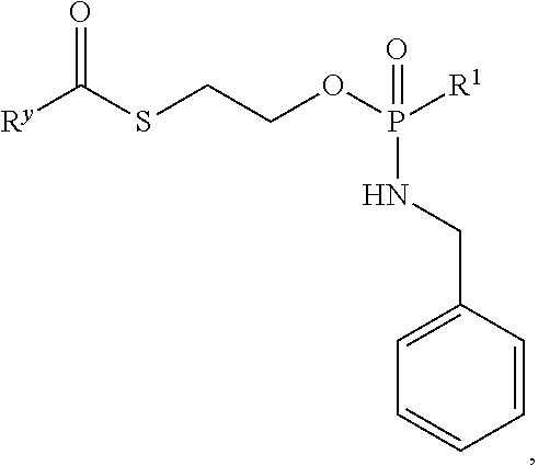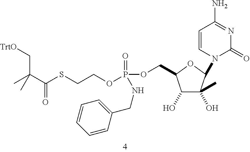H NMR δH(400 MHz, d6-DMSO): 0.96, 0.98 (2×314, 2×s, (CH3)2CH), 1.03 (3H, br-s, CH3), 1.11 (6H, s, (CH3)2C), 2.15 (1H, m, (CH3)2CH), 3.03 (2H, m, CH2S), 3.44 (2H, a-s, CH2OH), 3.85 (1H, a-d, J=4.8 Hz, CHNH2), 3.85-3.92 (2H, m, CH2O), 3.92-4.00 (2H, m, CH2Ph), 4.06-4.11 (1H, br-m, H-5′), 4.17-4.20 (1H, br-m, H-5″), 4.27-4.29 (1H, br-m, H-4′), 5.08 (1H, br-s, H-3′), 5.73 (1H, a-t, J=7.3 Hz, H-5), 5.74-5.82 (1H, m, P—N—H), 5.92 (1H, br-s, H-1′), 7.22-7.25 (1H, m, Ar—H), 7.28-7.32 (4H, m, 4×Ar—H), 7.60, 7.63 (2×0.5H, 2×d, J=7.3 Hz, H-6). 2×O—H and 2×NH2not observed. 13C NMR δC(100 MHz, d6-DMSO): 17.84, 17.96 (CH(CH3)2), 20.42, 20.48 (CH3), 21.78, (C(CH3)2), 28.09, 28.16 (CH2S), 29.72 (CH(CH3)2), 44.16 (PhCH2), 51.62 (C(CH3)2), 57.84 (CHNH2), 63.77, 63.81 (CH2O, C-5′), 68.26 (CH2OH), 74.67 (C-3′), 77.28 (C-4′), 78.09 (C-2′), 91.32 (C-1′), 94.22 (C-5), 126.71 (Ar—Cpara), 127.04, 127.08, 128.11 (2×Ar—Cmeta, 2×Ar—Cortho), 140.23, 140.27, 140.32 (Ar—Cipso, C-6), 155.06 (C-2), 165.32 (C-4), 169.65, 169.72 (CO2R), 203.84 (C═OS). C-1′, C-3′, C-4′ broadened into baseline but observable. 31P NMR δP(162 MHz, d6-DMSO): 9.63, 9.96 (1P, 2×s, ratio 1.02:1.00) To a solution of B102 (See Example 2) (compound 10, 200 mg, 0.34 mmol) in anhydrous dimethylformamide (3.4 ml) was added dropwise acetic anhydride (1.1 eq, 34 μl). The reaction mixture was stirred at room temperature for 4 h and 10 μl of acetic anhydride were added again. The reaction mixture was stirred overnight and the solvent evaporated under reduced pressure. The crude mixture was purified on silica gel column chromatography (eluant: stepwise gradient of methanol [0-10%] in methylene chloride) to give the desired acetylated pronucleotide B183 (169 mg, 79%) isolated as a white lyophilized powder.1H NMR (DMSO-d6, 400 MHz) δ (ppm) 0.93 (s, 3H), 1.09 (s, 6H), 2.09 (s, 3H), 3.01-3.04 (t, J=6.54 Hz, 2H), 3.40-3.42 (d, J=5.10 Hz, 1H), 3.53-3.62 (m, 2H), 3.83-3.91 (m, 1H), 3.94-4.01 (m, 4H), 4.10-4.15 (m, 1H), 4.20-4.25 (m, 1H), 4.88-4.91 (t, J=5.20 Hz, 1H), 5.23 (s, 1H), 5.33-5.37 (t, J=7.19 Hz, 1H), 5.67-5.78 (m, 1H), 5.93 (s, 1H), 7.18-7.21 (m, 1H), 7.27-7.32 (m, 5H), 7.96 and 8.03 (2d, J=7.59 Hz, 1H), 10.87 (s, 1H);31P NMR (DMSO-d6, 162 MHz) δ (ppm) 9.74 and 9.98 (2s); Scan ES+629 (M+H)+, λmax=300.7 nm; HPLC (0-100% ACN over a period of 8 min) tR=4.89 min λmax=302.1 nm To a solution of compound 8 (See Example 2, Procedure A, Strategy a) (1.4 g, 1.3 mmol) in anhydrous carbon tetrachloride (13 ml) was added dropwise N-2-(trifluoromethyl)benzylamine (10 eq, 2.3 g). The reaction mixture was stirred at room temperature for 3 h and the solvent removed under reduced pressure. The crude mixture was purified on silica gel column chromatography (eluant: stepwise gradient [0-3%] of methanol in methylene chloride) to afford the desired protected nucleoside as a foam (60%). This compound was converted into the phosphoramidate prodrug B187 (245 mg, 35%) following experimental conditions described in the Example 2 Strategy A and isolated as a white lyophilized powder.1H NMR (DMSO-d6, 400 MHz) δ (ppm) 0.92 (s, 3H), 1.09 (s, 6H), 3.05 (t, J=6.45 Hz, 2H), 3.29 (s, 1H), 3.41 (d, J=5.60 Hz, 2H), 3.91-3.93 (m, 3H), 4.17-4.21 (m, 4H), 4.91 (t, J=5.59 Hz, 1H), 5.06 (d, J=4.25 Hz, 1H), 5.23 (t, J=7.50 Hz, 1H), 5.65-5.67 (m, 1H), 5.76-5.83 (m, 1H), 5.91 (s, 1H), 7.08 and 7.16 (2s, 2H), 7.45-7.79 (m, 5H);31P NMR (DMSO-d6, 162 MHz) δ (ppm) 9.57-9.78 (2s, 1P);19F NMR (d6-DMSO, 235 MHz) δ (ppm) −60.79 (s, 3F); Scan ES+655 (M+H)+, λmax=280.73 nm; HPLC (0-100% ACN over a period of 10 min) tR=5.08 min λmax=271.4 nm. To a solution of compound 8 (See Example 2, Procedure A, Strategy a) (1.0 g, 0.94 mmol) in anhydrous carbon tetrachloride (10 ml) was added dropwise N4-trifluoromethylbenzylamine (5 eq, 670 μl). The reaction mixture was stirred at room temperature for 3 h and the solvent removed under reduced pressure. The crude mixture was purified on silica gel column chromatography (eluant: stepwise gradient [0-5%] of methanol in methylene chloride) to afford the desired protected nucleoside as a foam (84%). This compound was converted into the phosphoramidate prodrug B399 (204 mg, 40%) following experimental conditions described in the Example 2 Strategy A and isolated as a white lyophilized powder.1H NMR (DMSO-d6, 400 MHz) δ (ppm) 0.91-0.92 (d, J=2.09 Hz, 3H), 1.09 (s, 6H), 3.02-3.06 (m, 2H), 3.41 (d, J=6.17 Hz, 2H), 3.53-3.57 (m, 1H), 3.84-3.94 (m, 3H), 4.03-4.13 (m, 3H), 4.18-4.23 (m, 1H), 4.91-4.94 (t, J=5.48 Hz, 1H), 5.06 (s, 1H), 5.23-5.27 (t, J=6.82 Hz, 1H), 5.65-5.67 (m, 1H), 5.79-5.87 (m, 1H), 5.90 (s, 1H), 7.09 and 7.16 (2s, 2H), 7.48-7.55 (m, 3H), 7.64-7.67 (m, 2H);19F NMR (d6-DMSO, 235 MHz) δ (ppm) −60.79 (s, 3F);31P NMR (DMSO-d6, 162 MHz) δ (ppm) 9.55 and 9.76 (2s); Scan ES+655 (M+H)+, λmax=270 nm; HPLC (0-100% ACN over a period of 10 min) tR=5.03 min λmax=271 nm. To a solution of compound 8 (See Example 2, Procedure A, Strategy a) (950 mg, 0.89 mmol) in anhydrous carbon tetrachloride (9 ml) was added dropwise n-methyl-n-octylamine (10 eq, 1.28 g). The reaction mixture was stirred at room temperature for 3 h and the solvent removed under reduced pressure. The crude mixture was purified on silica gel column chromatography (eluant: stepwise gradient [0-3%] of methanol in methylene chloride) to afford the desired protected nucleoside as a foam (88%). This compound was converted into the phosphoramidate prodrug B204 (52 mg, 7%) following experimental conditions described in the Example 2 Strategy A and isolated as a white lyophilized powder. 1H NMR (DMSO-d6, 400 MHz) δ (ppm) 0.83 (m, 3H), 0.93-0.94 (d, J=3.75 Hz, 3H), 1.10 (s, 6H), 1.22 (s, 10H), 1.44 (m, 2H), 2.56 (d, J=8.2 Hz, 3H), 2.88-2.93 (m, 2H), 3.31 (m, 2H), 3.43 (d, J=5.60 Hz, 2H), 3.50-3.53 (m, 1H), 3.91-3.93 (m, 3H), 4.04-4.07 (m, 1H), 4.13-4.16 (m, 1H), 4.91 (t, J=5.59 Hz, 1H), 5.06 (s, 1H), 5.23 (m, 1H), 5.65-5.67 (m, 1H), 5.91 (s, 