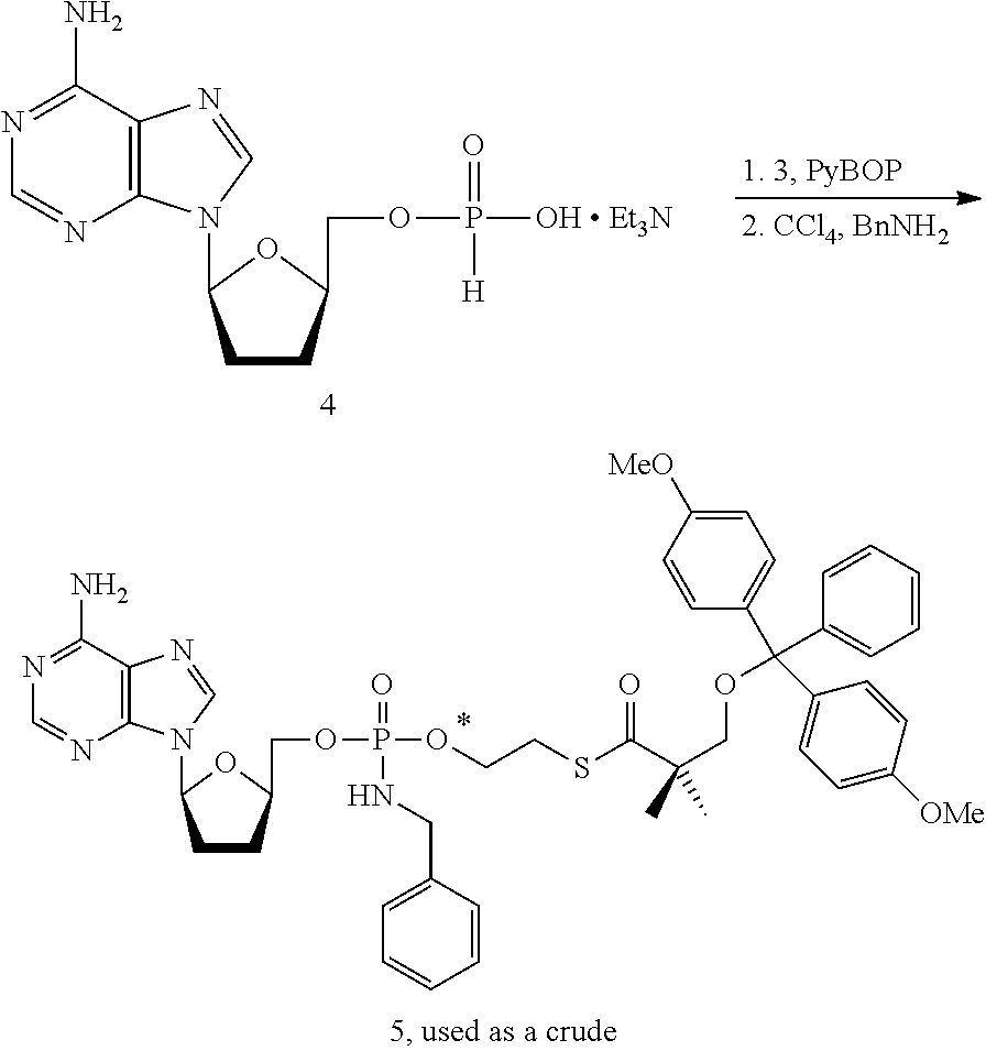 Phosphonate 3 was dissolved in 3 L of acetonitrile under argon. A solution of 2,3-PhB-NM107 from Step 1.1 was added followed by EDCI.HCl. The mixture was stirred under argon at 41-46° C. for 4 h after which time HPLC analysis indicated ˜7:1 ratio of P—H product to NM107. The mixture was cooled to 18° C. and benzylamine was added dropwise followed by carbon tetrachloride. The reaction was slightly exothermic. Analysis by HPLC indicated complete conversion of P—H to phosphoramidate product. Ethyl acetate (1 L) was added to the mixture which was then acidified to pH 4 with 3 L of 20% citric acid. The aqueous phase was extracted with 2.5 L of ethyl acetate. The organic phases were combined and washed with 3 L of 10% citric acid. The organic phase was basified to pH 8 with 5 L of aqueous sodium bicarbonate (saturated) and washed a second time with 2 L of aqueous sodium bicarbonate (saturated). The organic phase was dried over sodium sulfate, filtered under vacuum and evaporated to give a yellow foam, 712 g. The crude residue was dissolved in dichloromethane (1 L) and purified on silica plug (2.3 Kg of silica). Eluted with: 5 L 4% Methanol/DCM, 2*1 L 4%, 3*1 L 5%, 8*250 mL 6%, 4*250 mL 7%, 9*1 L 7%. Evaporation of the relevant fractions gave 254 g (HPLC purity: 98.5%, yield: 52%) and 73 g (HPLC purity: 87.6%, yield: 13%) of phosphoramidate 4. Phosphoramidate 4 was dissolved in anhydrous ethanol and acetyl chloride was added (exothermic: 18° C. to 27° C.) to the reaction mixture, under argon. The mixture was stirred at 60° C. under argon. After 30 min, HPLC analysis indicated complete conversion of the phosphoramidate 4 to deprotected product 5. The mixture was cooled to 25° C. and solid sodium bicarbonate (1.04 Kg) was added in several portions (foaming, pH ˜5.5-6). The mixture was filtered through Celite and washed with two volumes of ethanol. The filtrate was evaporated under vacuum at 35° C. The residue was triturated with TBME (3 L) for 1 h and then filtered to remove the trityl by-product. The solid obtained was dried under vacuum to give 185 g with 93% purity at 254 nm by HPLC. If required, any residual benzeneboronic acid may be removed from the product by dissolution in water and treatment with Amberlite IRA-743 resin.