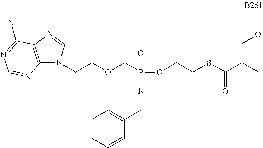 HBV Cell Assay (EPA Read-out) Cytotoxicity Antiviral Activity * Drug (CC50in μM) (EC50in μM) SI PMEA >100 0.328 ± 0.082 >310 B261 19.6 0.016 ± 0.004 1,225 LdT >100 0.366 ± 0.056 >273 Cytoxicity and efficacy was determined on collagen plates. Example 41