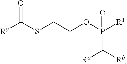 The following results were obtained. Exemplary compound syntheses are described below: To a stirred solution of 7j (0.32 mmol) and S-(2-Phosphite-ethyl) 2,2-dimethyl-3-triphenylmethyloxy-thiopropionate (0.42 mmol) in pyridine (5 ml) at −15° C. was added dropwise pivaloyl chloride (0.64 mmol) under nitrogen. The reaction mixture was stirred at −15° C. for 2 hours. Dichloromethane and NH4Cl solution were added. Organic phase was separated washed with NH4Cl solution, dried over Na2SO4, filtered and concentrated under reduced pressure. The crude material was purified by flash column chromatography (DCM/MeOH) to yield the title compound Brown powder. Molecular Formula C38H39FN5O8PS NMR (DMSO-d6, 400 MHz) δ (ppm) 1.12 (s, 6H), 1.84 (m, 4H) 3.04 (s, 2H), 3.92 (d, J=5.60 Hz, 1H), 4.01-4.10 (m, 3H), 4.33-4.39 (m, 2H), 4.60-4.66 (m, 1H), 6.13 (d, J=18.00 Hz, 1H), 6.67 (s, 2H), 7.21-7.35 (m, 15H), 7.81 (s, 1H), 10.86 (brs, 1H) To a stirred solution of 29 (0.088 mmol) in anhydrous carbon tetrachloride (880 μL), 4-fluoro-benzylamine (0.44 mmol) was added dropwise. The reaction mixture was stirred at room temperature for 2 h and evaporated to dryness (bath temperature not exceeding 30° C.). The crude mixture was filtered on a silica gel plug, eluting with a gradient 0-10% methanol in dichloromethane to yield the title compound. White solid. Molecular Formula C45H45F2N6O8PS1H NMR (DMSO-d6, 400 MHz) δ (ppm) 1.09 (s, 6H), 3.03 (s, 2H), 3.39-3.41 (m, 2H), 3.90-3.93 (m, 5H), 4.05-4.08 (m, 1H), 4.20-4.23 (m, 2H), 4.62-4.65 (m, 1H), 5.74 (m, 1H), 6.08-6.14 (dd, J=17.94 Hz and J=4.22 Hz, 1H), 6.32 (m, 1H), 6.67 (s, 2H), 7.21-7.35 (m, 19H), 7.81 (s, 1H), 10.86 (brs, 1H)31P NMR (DMSO-d6, 162 MHz) δ (ppm) 9.83 (s, 1P)19F NMR (DMSO-d6, 235 MHz) δ (ppm) −116.24 (s, 1F), −158-0.2 (s, 1F) Scan ES+899 (M−H)+, UV λmax255 nm 30a (0.09 mmol) was dissolved in dichloromethane (320 μL) and treated with formic acid (32 μL). The mixture was stirred at room temperature for 10 min, filtered through a solid phase extraction column eluting with a gradient 0-30% methanol in dichloromethane, then purified by reverse phase (C 18) silica gel column chromatography eluting with a gradient 0-100% acetonitrile in water and lyophilised from a mixture of water/dioxan to yield the title compound. White solid. Molecular Formula C26H31F2N6O8PS NMR (d6-DMSO, 400 MHz) δ (ppm) 1.09 (s, 6H), 3.03 (s, 2H), 3.39-3.41 (m, 2H), 3.90-3.93 (m, 5H), 4.05-4.08 (m, 1H), 4.20-4.23 (m, 2H), 4.62-4.65 (m, 1H), 4.92 (m, 1H), 5.74 (m, 1H), 6.08-6.14 (dd, J=17.94 Hz and J=4.22 Hz, 1H), 6.32 (m, 1H), 6.67 (s, 2H), 7.21-7.35 (m, 4H), 7.81 (s, 1H), 10.86 (brs, 1H)31P NMR (DMSO-d6, 162 MHz) δ (ppm) 9.66 (s, 1P)19F NMR (DMSO-d6, 235 MHz) δ (ppm) −116.24 (s, 1F), −158.44 (s, 1F) Scan ES+657 (M−H)+, UV λmax254 nm 30b was synthesized from 29 and 4-methoxy-benzylamine as described for 30a. White solid. Molecular Formula C46H48FN6O9PS1H NMR (DMSO-d6, 400 MHz) (ppm) 1.09 (s, 6H), 3.03 (m, 2H), 3.42 (d, J=5.02 Hz, 2H), 3.71 (d, J=3.60 Hz, 3!:H), 3.85-3.90 (m, 5H), 4.06-4.10 (m, 1H), 4.23-4.29 (m, 2H), 4.60-4.66 (m, 1H), 5.54-5.57 (m, 1H), 6.08-6.14 (dd, J=17.94 Hz and J=4.22 Hz, 1H), 6.28-6.33 (m, 1H), 6.60 (s, 2H), 6.80-6.85 (m, 2H), 7.18-7.20 (m, 2H), 7.23-7.25 (m, 15H), 7.82 (s, 1H), 10.56 (brs, 1H))31P NMR (DMSO-d6, 162 MHz) δ (ppm) 9.83 (s, 1P)19F NMR (DMSO-d6, 235 MHz) δ (ppm) −116.24 (s, 1F), −158.2 (s, 1F) Scan ES+911 (M−H)+, UV λmax255 nm 31b was synthesized from 30b as described for 31a. White solid. Molecular Formula C27H34FN6O9PS1H NMR (d6-DMSO, 400 MHz) δ (ppm) 1.09 (s, 6H), 3.03 (m, 2H), 3.42 (d, J=5.02 Hz, 2H), 3.71 (d, J=3.60 Hz, 3H), 3.85-3.90 (m, 5H), 4.06-4.10 (m, 1H), 4.23-4.29 (m, 2H), 4.60-4.66 (m, 1H), 4.92 (t, J=5.50 Hz, 1H), 5.54-5.57 (m, 1H), 6.08-6.14 (dd, J=17.94 Hz and J=4.22 Hz, 1H), 6.28-6.33 (m, 1H), 6.60 (s, 2H), 6.80-6.85 (m, 2H), 7.18-7.20 (m, 2H), 7.82 (s, 1H), 10.56 (brs, 1H)31P NMR (DMSO-d6, 162 MHz) δ (ppm) 9.86 (s, 1P)19F NMR (DMSO-d6, 235 MHz) δ (ppm) −158.24 (s, 1F) Scan ES+669 (M−H)+, UV λmax254 nm 30c was synthesized from 29 and 4-trifluoromethyl-benzylamine as described for 30a. White solid. Molecular Formula C46H45F4N6O8PS1H NMR (d6-DMSO, 400 MHz) (ppm) 1.09 (s, 6H), 3.03 (t, J=6.44 Hz, 2H), 3.42 (s, 2H), 3.87-3.92 (m, 5H), 4.03-4.08 (m, 1H), 4.24-4.29 (m, 2H), 4.60-4.64 (m, 1H), 5.79-5.82 (m, 1H), 6.08-6.14 (dd, J=17.94 Hz and J=4.22 Hz, 1H), 6.28-6.33 (m, 1H), 6.60 (s, 2H), 7.23-7.25 (m, 15H), 7.50-7.70 (m, 4H), 8.25 (brs, 1H), 10.76 (brs, 1H),31P NMR (DMSO-d6, 162 MHz) δ (ppm) 9.86 (s, 1P)19F NMR (DMSO-d6, 235 MHz) δ (ppm) −158.20 (s, 1F) Scan ES+949 (M−H)+, UV λmax254 nm 31c was synthesized from 30c as described for 31a. White solid. Molecular Formula C27H31F4N6O8PS1NMR (d6-DMSO, 400 MHz) δ (ppm) 1.09 (s, 6H), 3.03 (t, J=6.44 Hz, 2H), 3.42 (s, 2H), 3.87-3.92 (m, 5H), 4.03-4.08 (m, 1H), 4.24-4.29 (m, 2H), 4.60-4.64 (m, 1H), 4.91 (brs, 1H), 5.79-5.82 (m, 1H), 6.08-6.14 (dd, J=17.94 Hz and J=4.22 Hz, 1H), 6.28-6.33 (m, 1H), 6.60 (s, 2H), 7.50-7.70 (m, 4H), 8.25 (brs, 1H), 10.64 (brs, 1H),31P NMR (DMSO-d6, 162 MHz) δ (ppm) 9.86 (s, 1P)19F NMR (DMSO-d6, 235 MHz) δ (ppm) −158.24 (s, 1F) Scan ES+669 (M−H)+, UV λmax254 nm Further exemplary compounds synthesized using procedures similar to those described herein are listed below. Note the following names for the compounds synthesized in the examples.