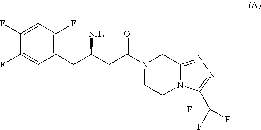 In one embodiment, sitagliptin is in the form of its dihydrogenphosphate salt, i.e. sitagliptin phosphate. In a further embodiment, sitagliptin phosphate is in the form of a crystalline anhydrate or monohydrate. A class of this embodiment refers to sitagliptin phosphate monohydrate. Sitagliptin free base and pharmaceutically acceptable salts thereof are disclosed in U.S. Pat. No. 6,699,871 and in Example 7 of WO 03/004498. Crystalline sitagliptin phosphate monohydrate is disclosed in WO 2005/003135 and in WO 2007/050485. For details, e.g. on a process to manufacture, to formulate or to use this compound or a salt thereof, reference is thus made to these documents. A tablet formulation for sitagliptin is commercially available under the trade name Januvia®. A tablet formulation for sitagliptin/metformin combination is commercially available under the trade name Janumet®.