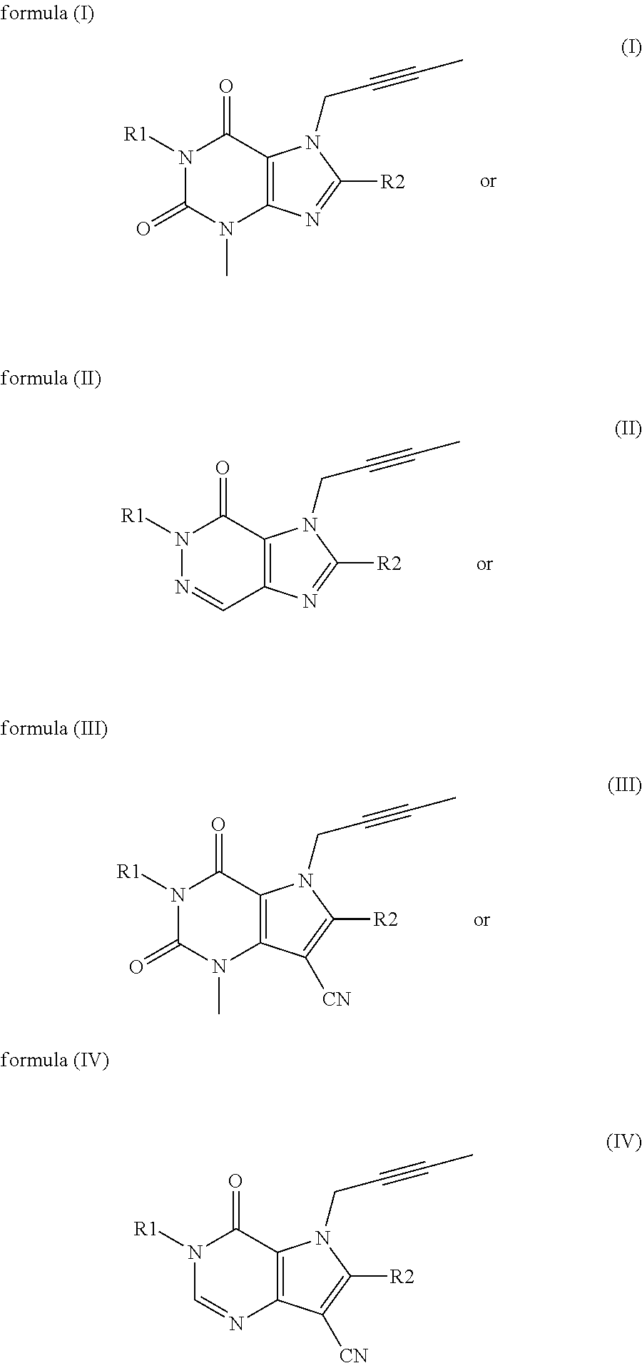These DPP-4 inhibitors are distinguished from structurally comparable DPP-4 inhibitors, as they combine exceptional potency and a long-lasting effect with favourable pharmacological properties, receptor selectivity and a favourable side-effect profile or bring about unexpected therapeutic advantages or improvements when combined with other pharmaceutical active substances. Their preparation is disclosed in the publications mentioned. A more preferred DPP-4 inhibitor among the abovementioned DPP-4 inhibitors of embodiment A of this invention is 1-[(4-methyl-quinazolin-2-yl)methyl]-3-methyl-7-(2-butyn-1-yl)-8-(3-(R)-amino-piperidin-1-yl)-xanthine, particularly the free base thereof (which is also known as BI 1356). Unless otherwise noted, according to this invention it is to be understood that the definitions of the active compounds (including the DPP-4 inhibitors) mentioned hereinabove and hereinbelow also comprise their pharmaceutically acceptable salts as well as hydrates, solvates and polymorphic forms thereof. With respect to salts, hydrates and polymorphic forms thereof, particular reference is made to those which are referred to herein. With respect to embodiment A, the methods of synthesis for the DPP-4 inhibitors according to embodiment A of this invention are known to the skilled person. Advantageously, the DPP-4 inhibitors according to embodiment A of this invention can be prepared using synthetic methods as described in the literature. Thus, for example, purine derivatives of formula (I) can be obtained as described in WO 2002/068420, WO 2004/018468, WO 2005/085246, WO 2006/029769 or WO 2006/048427, the disclosures of which are incorporated herein. Purine derivatives of formula (II) can be obtained as described, for example, in WO 2004/050658 or WO 2005/110999, the disclosures of which are incorporated herein. Purine derivatives of formula (III) and (IV) can be obtained as described, for example, in WO 2006/068163, WO 2007/071738 or WO 2008/017670, the disclosures of which are incorporated herein. The preparation of those DPP-4 inhibitors, which are specifically mentioned hereinabove, is disclosed in the publications mentioned in connection therewith. Polymorphous crystal modifications and formulations of particular DPP-4 inhibitors are disclosed in WO 2007/128721 and WO 2007/128724, respectively, the disclosures of which are incorporated herein in their entireties. Formulations of particular DPP-4 inhibitors with metformin or other combination partners are described in WO 2009/121945, the disclosure of which is incorporated herein in its entirety. Typical dosage strengths of the dual fixed combination of BI 1356/metformin are 2.5/500 mg, 2.5/850 mg and 2.5/1000 mg, which may be administered 1-3 times a day, particularly twice a day. With respect to embodiment B, the methods of synthesis for the DPP-4 inhibitors of embodiment B are described in the scientific literature and/or in published patent documents, particularly in those cited herein. For pharmaceutical application in warm-blooded vertebrates, particularly humans, the compounds of this invention are usually used in dosages from 0.001 to 100 mg/kg body weight, preferably at 0.1-15 mg/kg, in each case 1 to 4 times a day. For this purpose, the compounds, optionally combined with other active substances, may be incorporated together with one or more inert conventional carriers and/or diluents, e.g. with corn starch, lactose, glucose, microcrystalline cellulose, magnesium stearate, polyvinylpyrrolidone, citric acid, tartaric acid, water, water/ethanol, water/glycerol, water/sorbitol, water/polyethylene glycol, propylene glycol, cetylstearyl alcohol, carboxymethylcellulose or fatty substances such as hard fat or suitable mixtures thereof into conventional galenic preparations such as plain or coated tablets, capsules, powders, suspensions or suppositories. The pharmaceutical compositions according to this invention comprising the DPP-4 inhibitors as defined herein are thus prepared by the skilled person using pharmaceutically acceptable formulation excipients as described in the art. Examples of such excipients include, without being restricted to diluents, binders, carriers, fillers, lubricants, flow promoters, crystallisation retardants, disintegrants, solubilizers, colorants, pH regulators, surfactants and emulsifiers. Examples of suitable diluents for compounds according to embodiment A include cellulose powder, calcium hydrogen phosphate, erythritol, low substituted hydroxypropyl cellulose, mannitol, pregelatinized starch or xylitol. Examples of suitable lubricants for compounds according to embodiment A include talc, polyethyleneglycol, calcium behenate, calcium stearate, hydrogenated castor oil or magnesium stearate. Examples of suitable binders for compounds according to embodiment A include copovidone (copolymerisates of vinylpyrrolidon with other vinylderivates), hydroxypropyl methylcellulose (HPMC), hydroxypropylcellulose (HPC), polyvinylpyrrolidon (povidone), pregelatinized starch, or low-substituted hydroxypropylcellulose (L-HPC). Examples of suitable disintegrants for compounds according to embodiment A include corn starch or crospovidone. Suitable methods of preparing pharmaceutical formulations of the DPP-4 inhibitors according to embodiment A of the invention are